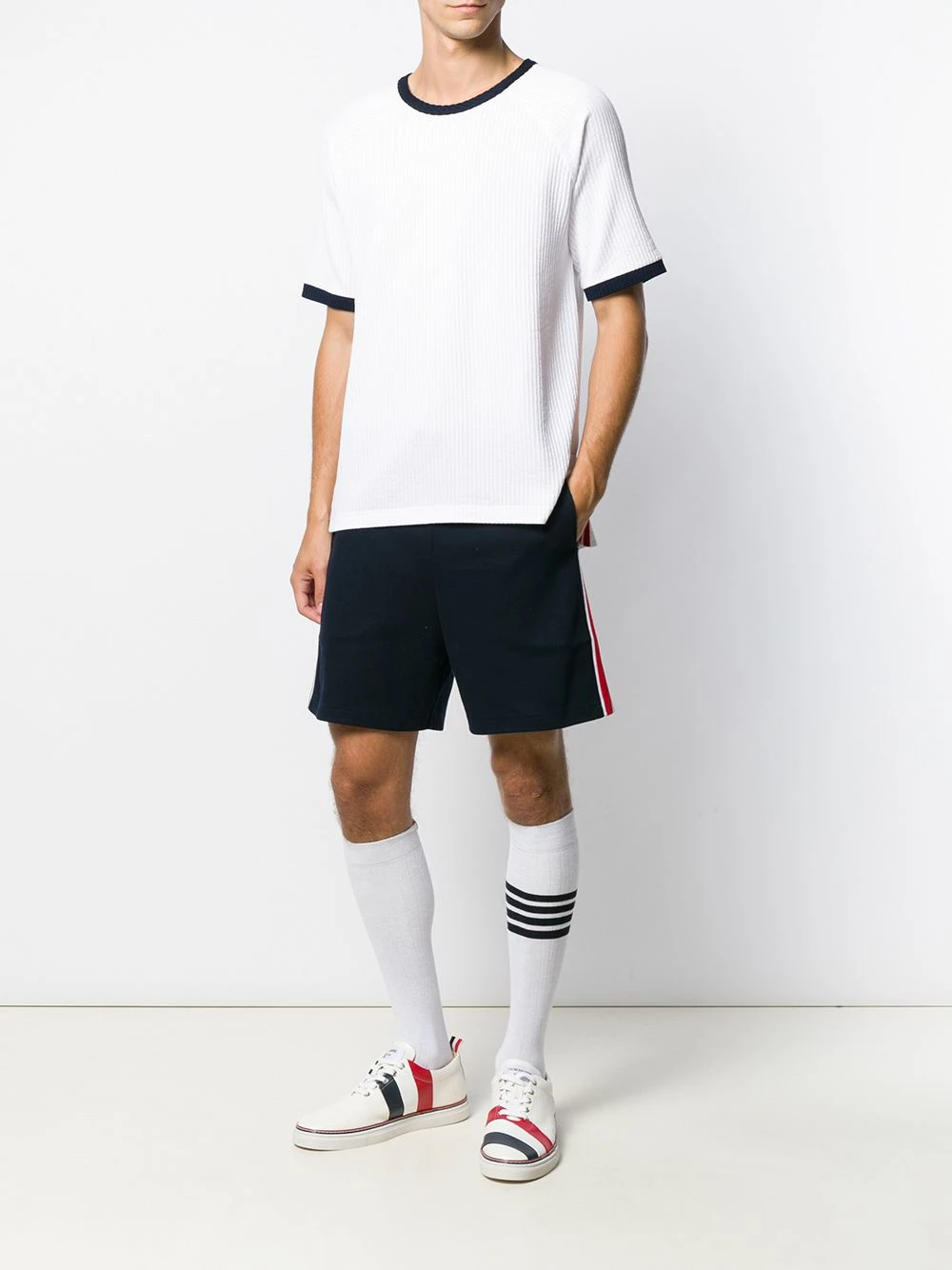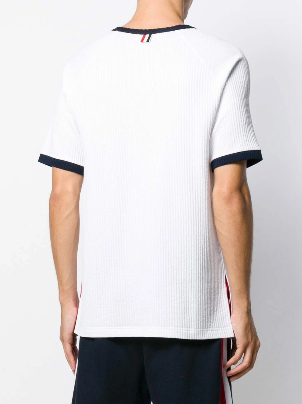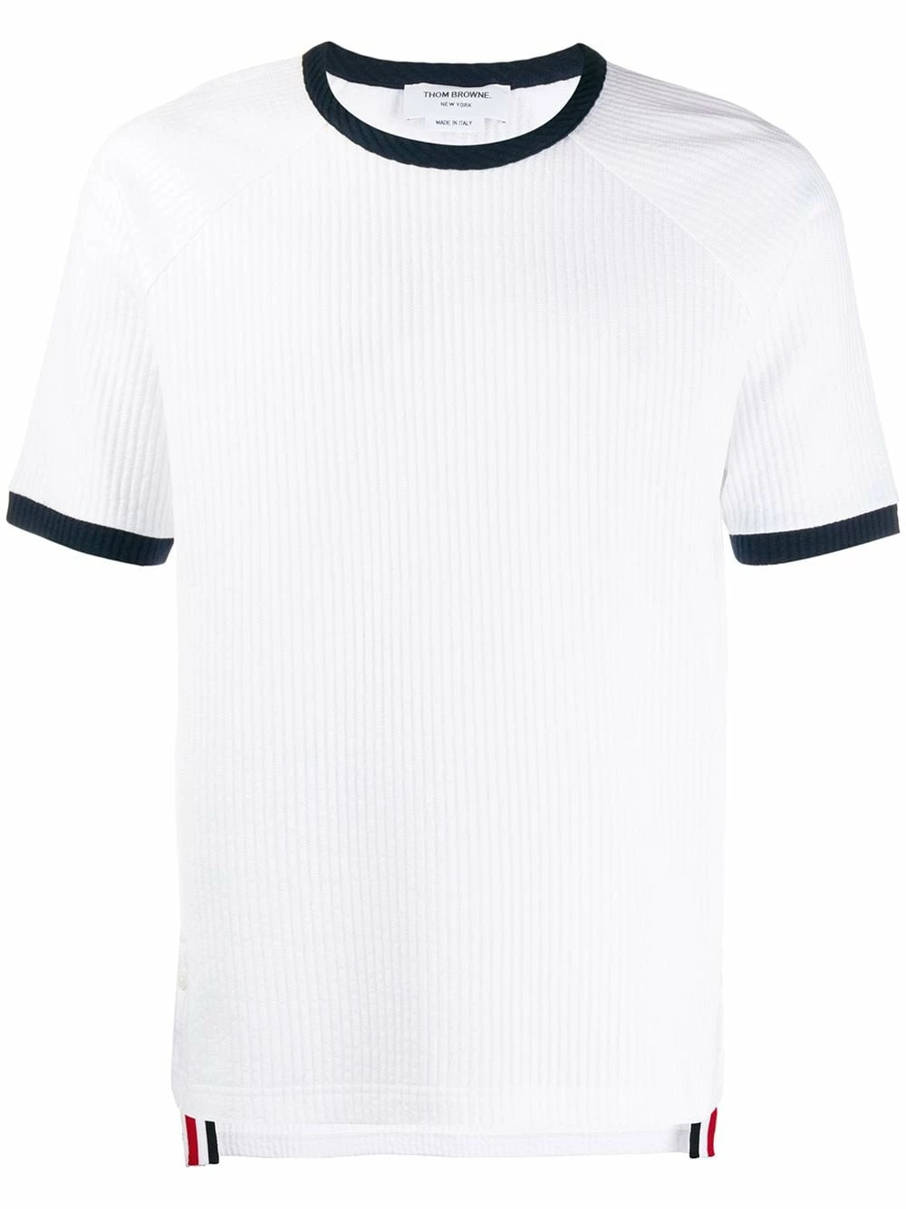 Launched in 2003, Thom Browne is internationally celebrated for its clean-cut silhouettes and couture-like sensibilities, as showcased by this white cotton seersucker ringer T-shirt. Featuring short sleeves, a crew neck, a contrasting collar, contrasting cuffs, a dropped back, button details at the waist and a contrasting white, navy blue and red grosgrain tab at the rear.