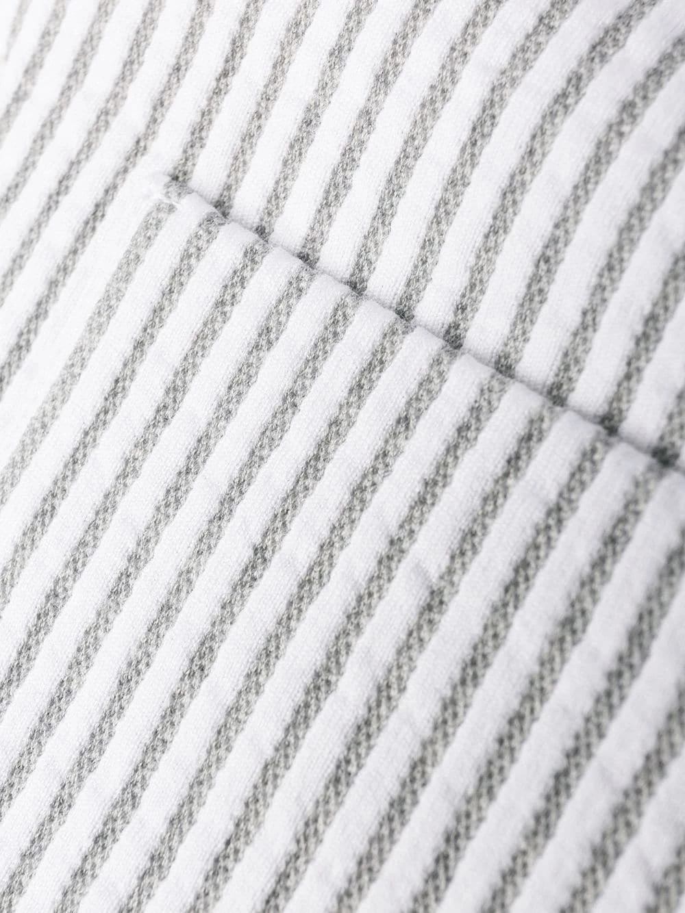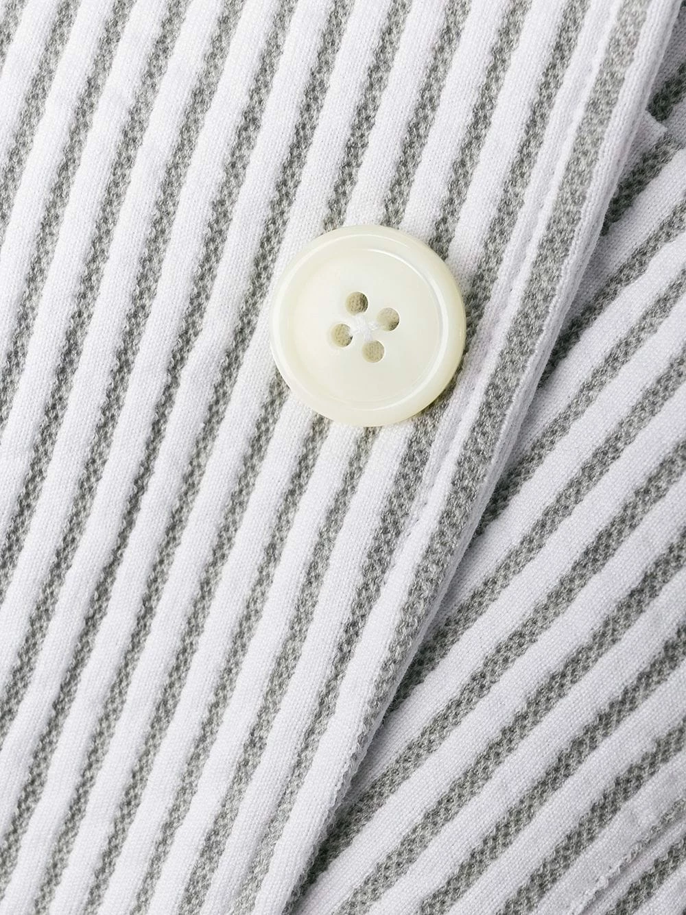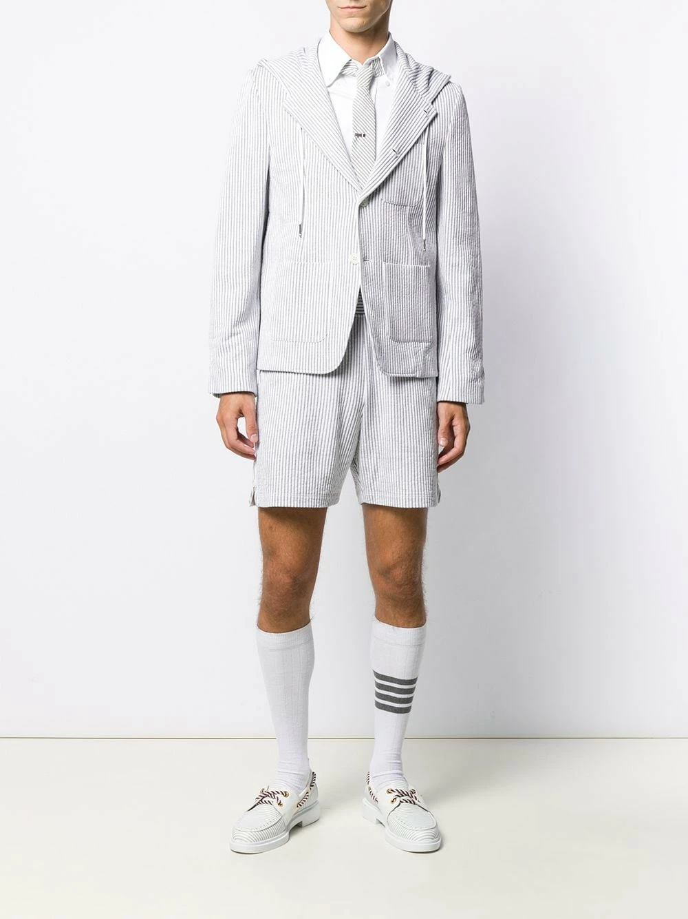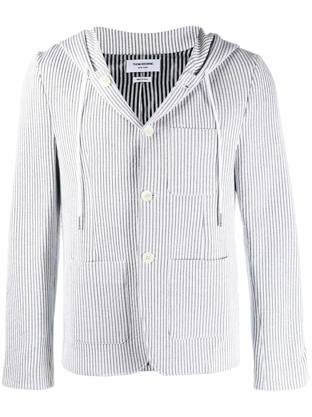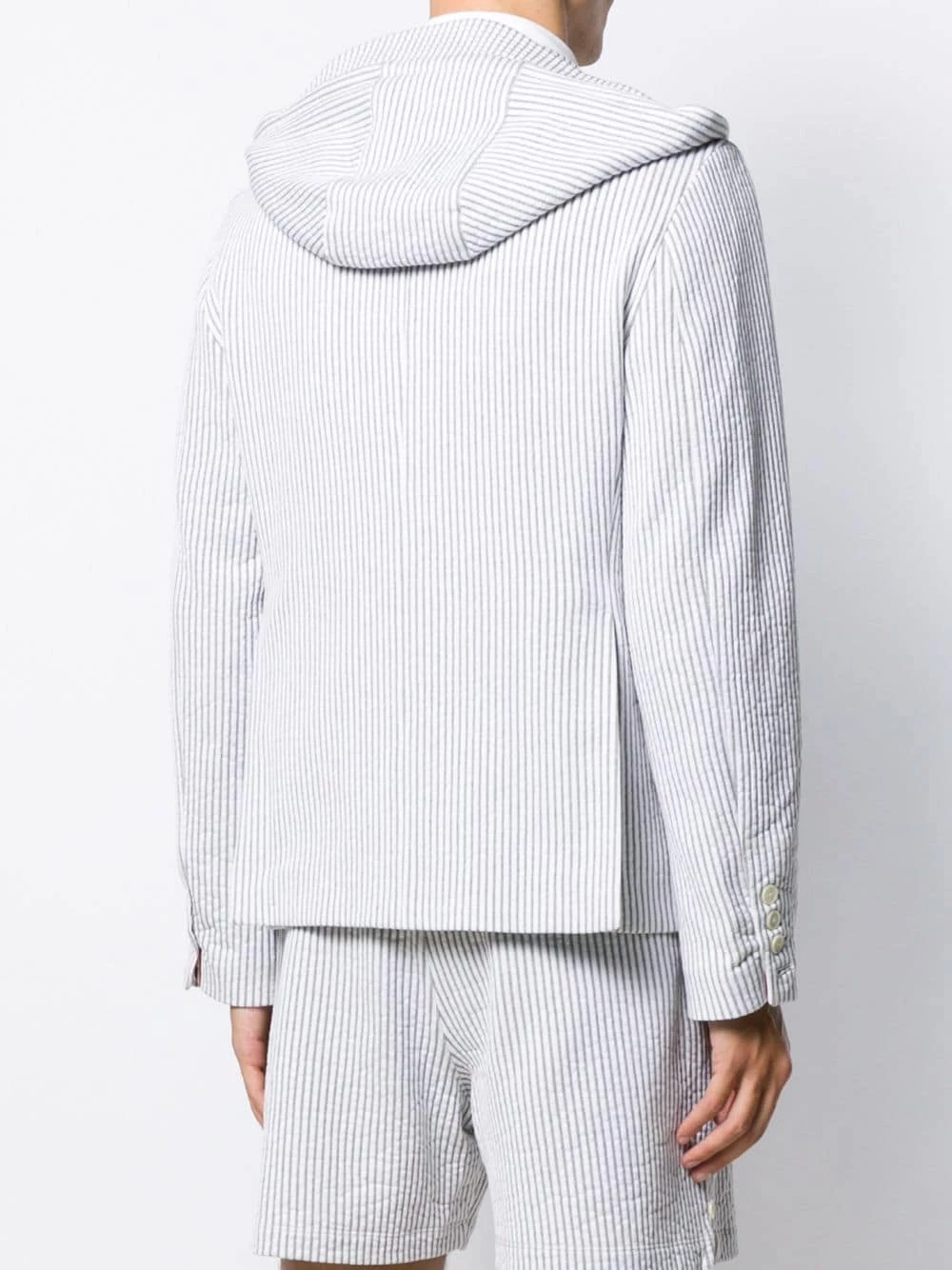 Launched in 2003, Thom Browne is internationally celebrated for its clean-cut silhouettes and couture-like sensibilities, as seen in this light grey cotton seersucker striped hooded blazer.