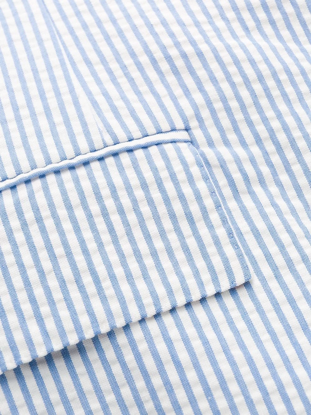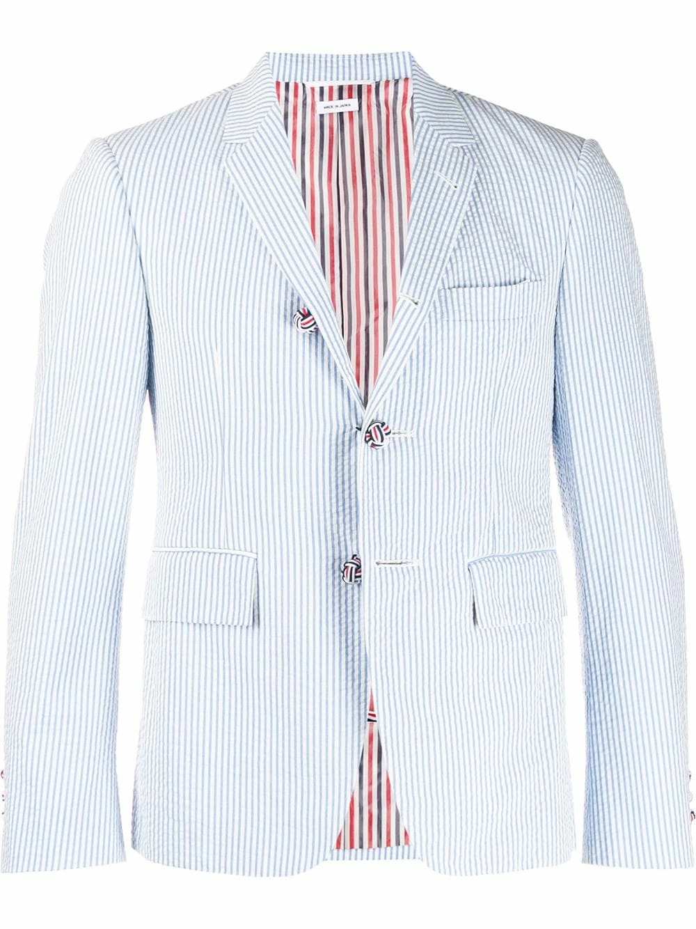 Launched in 2003, Thom Browne is internationally celebrated for its clean-cut silhouettes and couture-like sensibilities, as showcased by this light blue and white cotton seersucker striped sport blazer. Featuring long sleeves, a v-neck, front pockets, a chest pocket, button cuffs, a contrasting grosgrain tab at the rear and contrasting red, white and navy blue buttons.