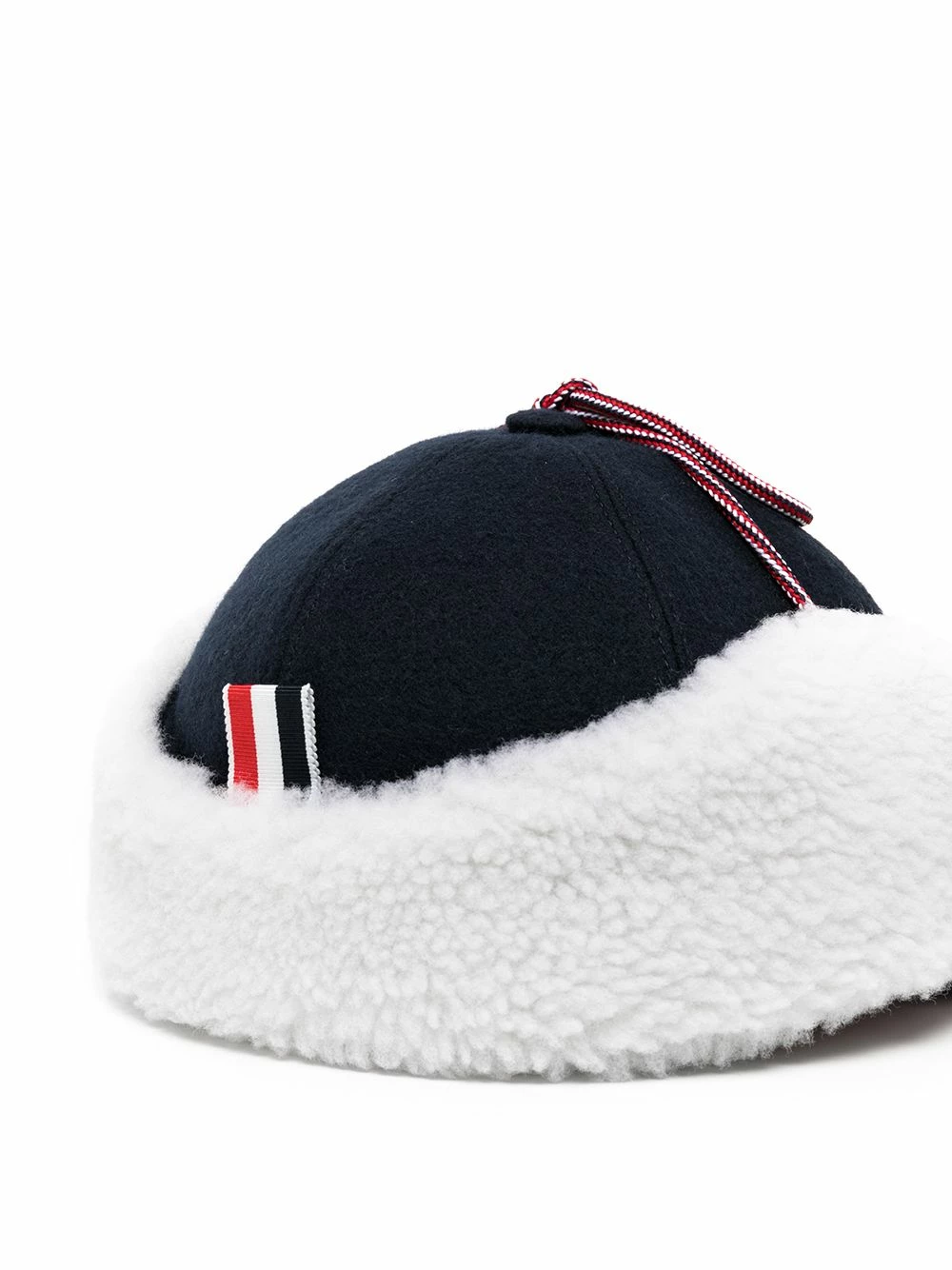 Thom Browne presents a navy blue Hunting cap in cashmere and wool with a soft white shearling interior. Versatility is provided with integrated earflaps with woven drawstrings that may be worn up or down.
