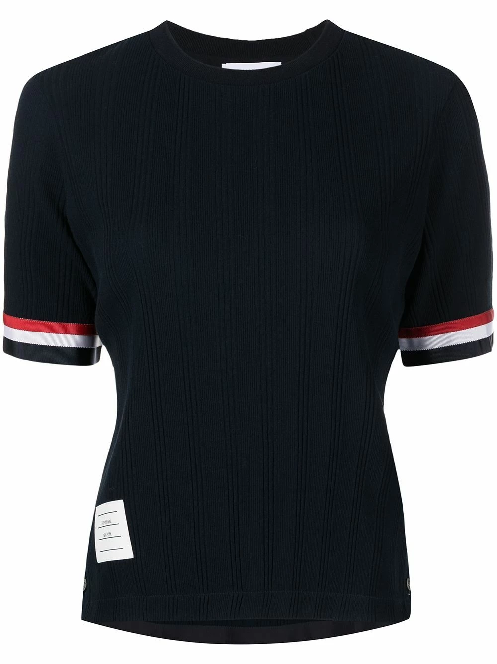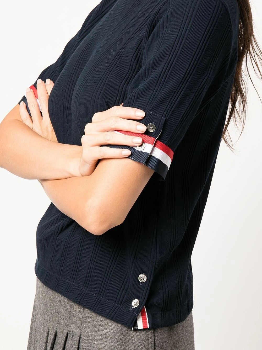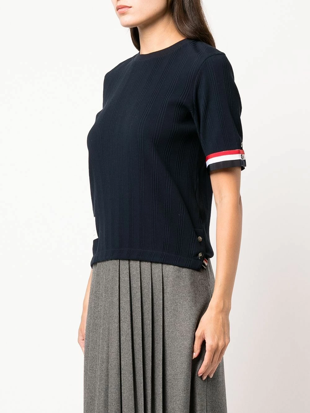 415 Navy Natural (Veg)->Cotton SHORT SLEEVE TEE W/ RWB GROSGRAIN CUFF IN HIGH TWIST VARIEGATED RIB from THOM BROWNE.