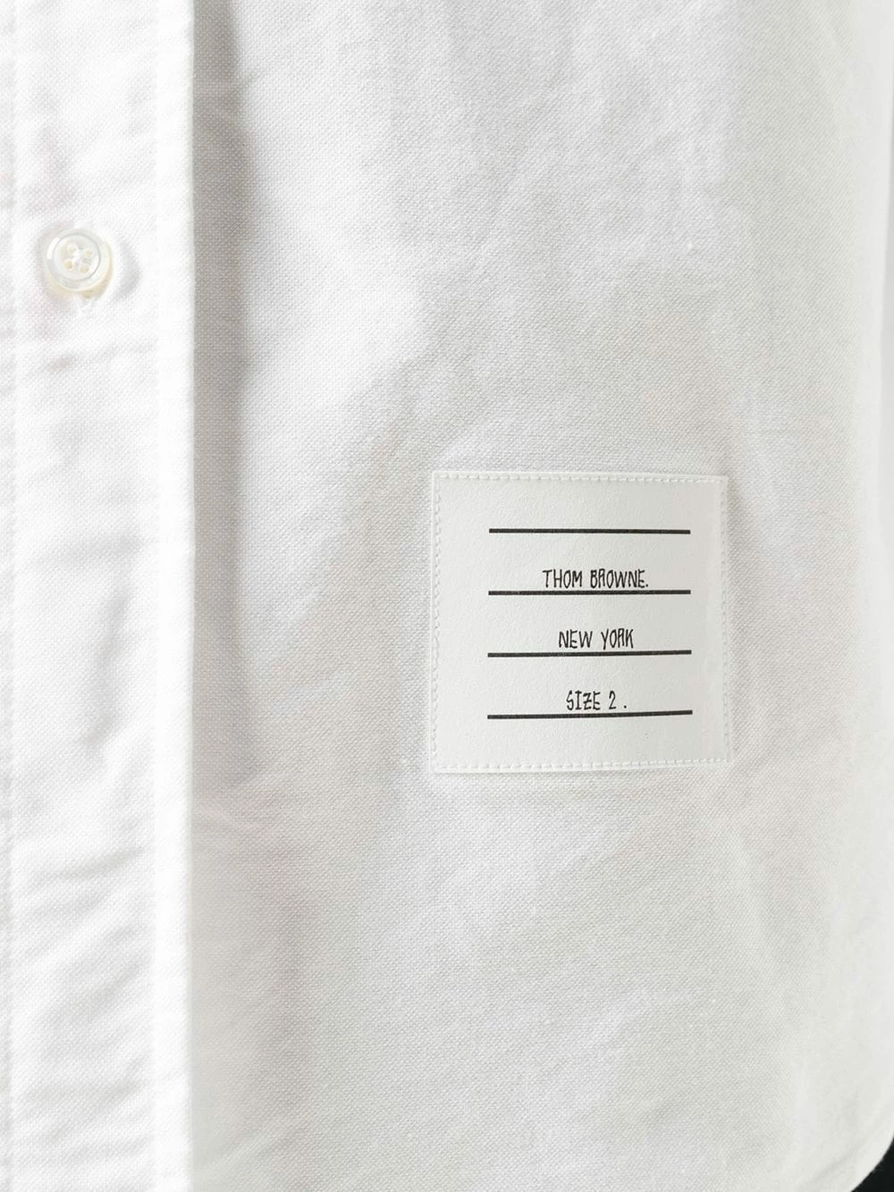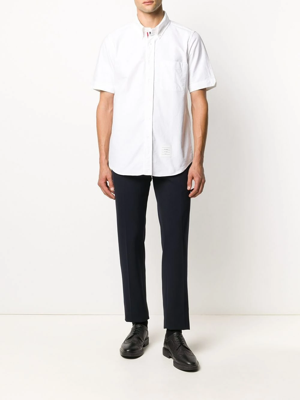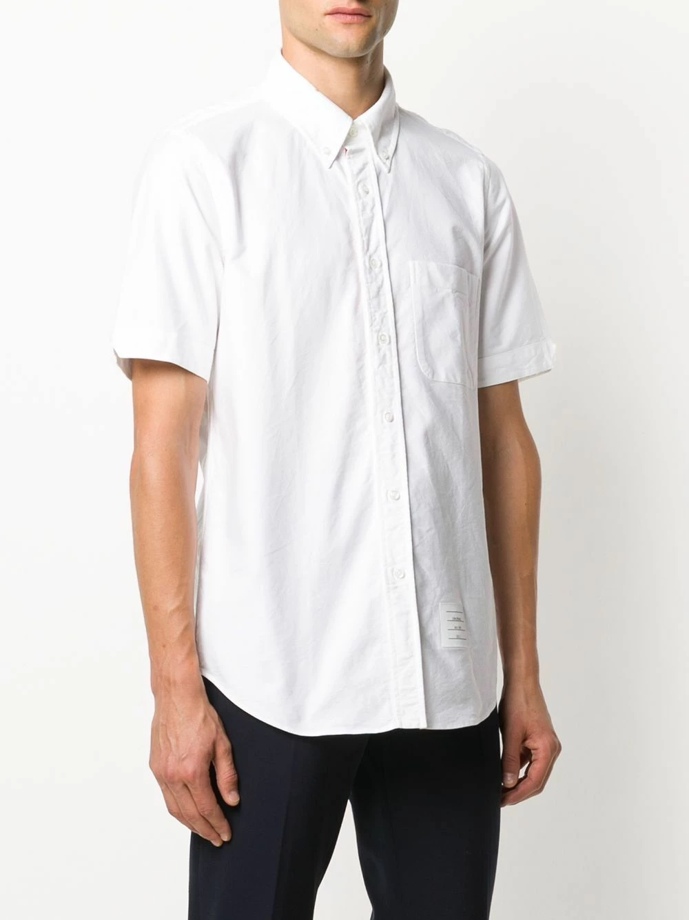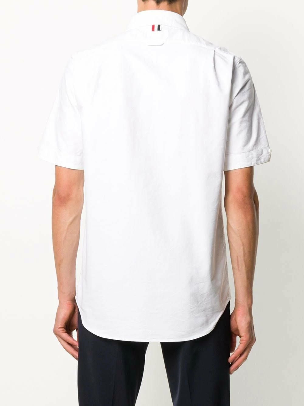 White cotton short-sleeved Oxford shirt from Thom Browne featuring button-down collar, front button fastening, chest patch pocket, short sleeves, logo patch to the front and signature tricolour tab to the back.