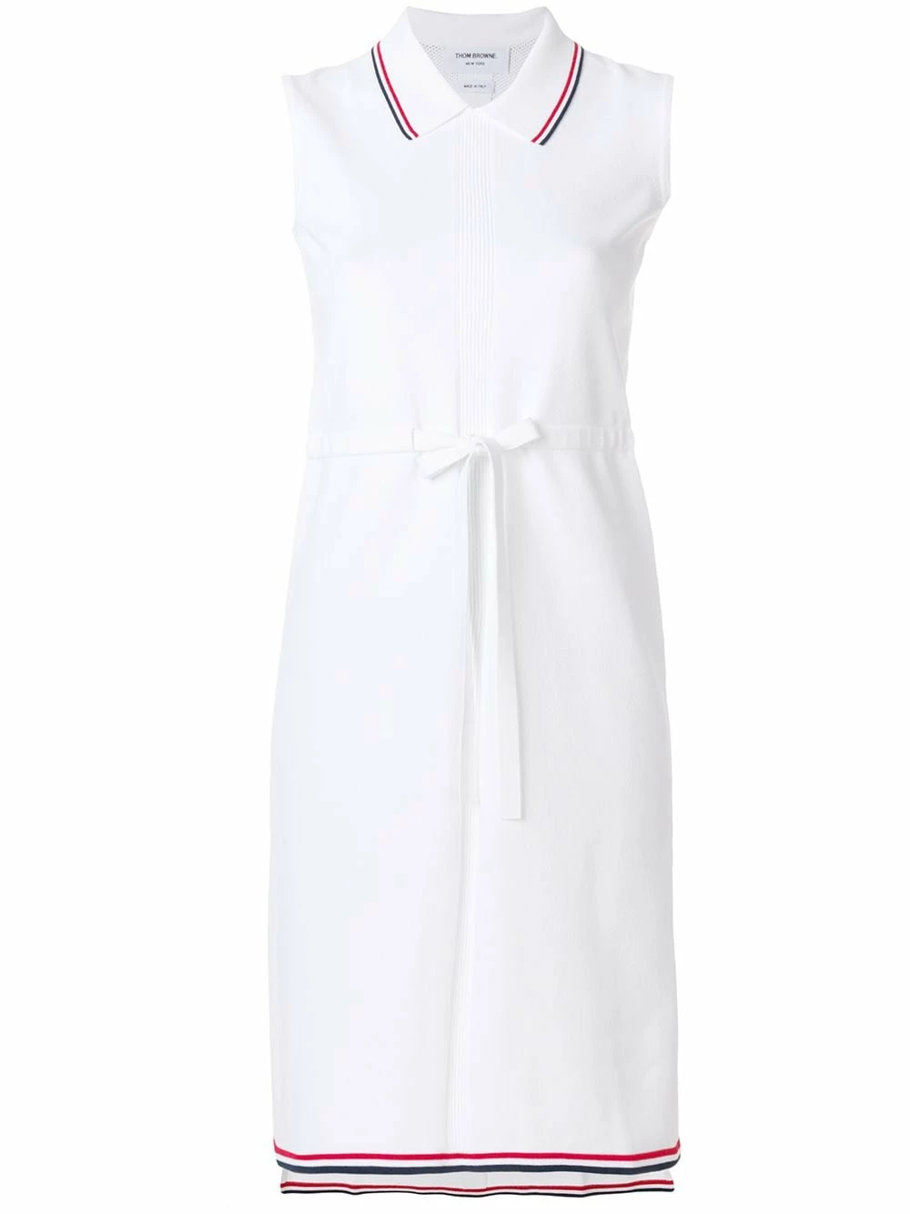 With a history in men’s formalwear, Thom Browne brings his tailoring expertise to the table when creating his women’s collection, focusing on premium materials and expertly cut shapes. Designed for a fine day out in the spring sun, this drawstring sleeveless white dress features a classic collar, an asymmetric hem with a signature tri-colour striped trim, ribbed details to the front and back and a grosgrain band.