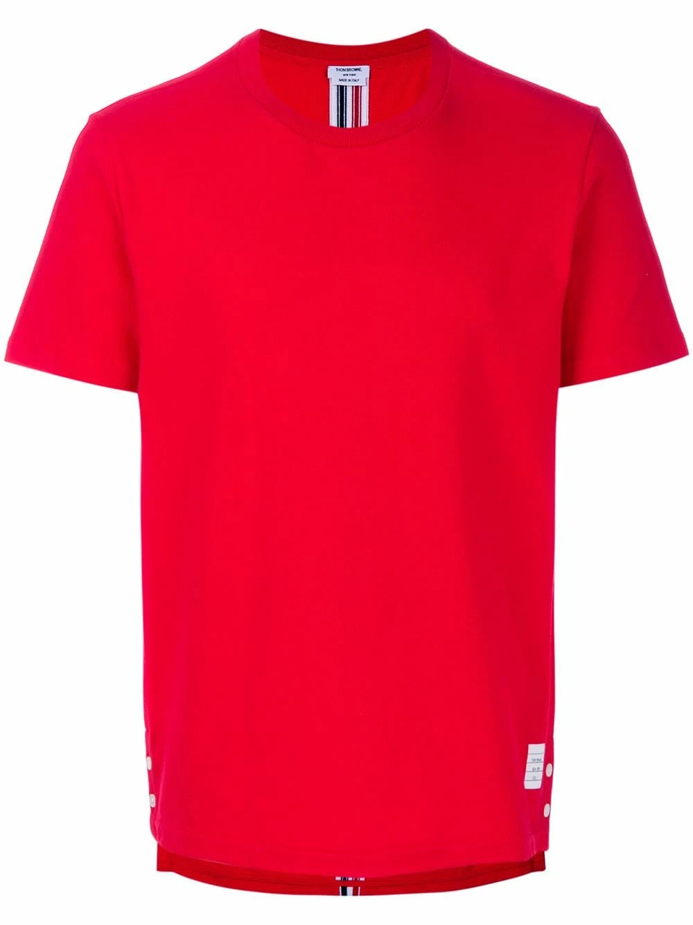 Acclaimed for his subtly deconstructed tailoring, Browne incorporates traditional craftsmanship techniques to modern transformations in men’s everyday wear. Made in Italy, this T-shirt is presented with a classic Thom Browne construction, with an asymmetric hemline and buttoned sides. The pure red cotton is comfortable and fresh, exactly what the Spring/Summer 2018 ordered. The piece features a ribbed crew neck, short sleeves, a front logo patch with the size and the brand’s home city and red, white and blue grosgrain straps on the back and inside the side slits.