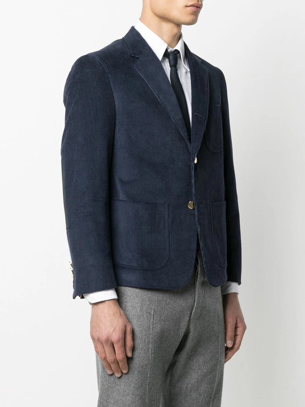Smarten up. Your office looks will get an instant improvemente with this navy blue single-breasted corduroy blazer from Thom Browne. Look as good as you feel.