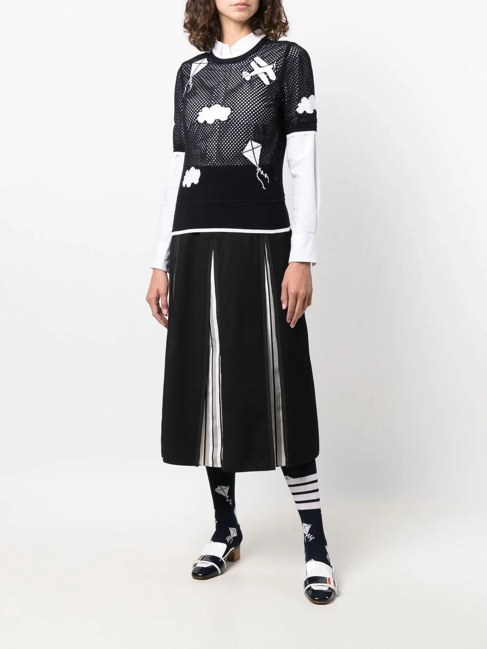Looking to the sky for inspiration, Thom Browne’s Resort 2022 collection incorporates aviation and sky motifs. Showcasing this dreamy theme is this mesh-style cotton top, which has intarsia-knit motifs throughout.