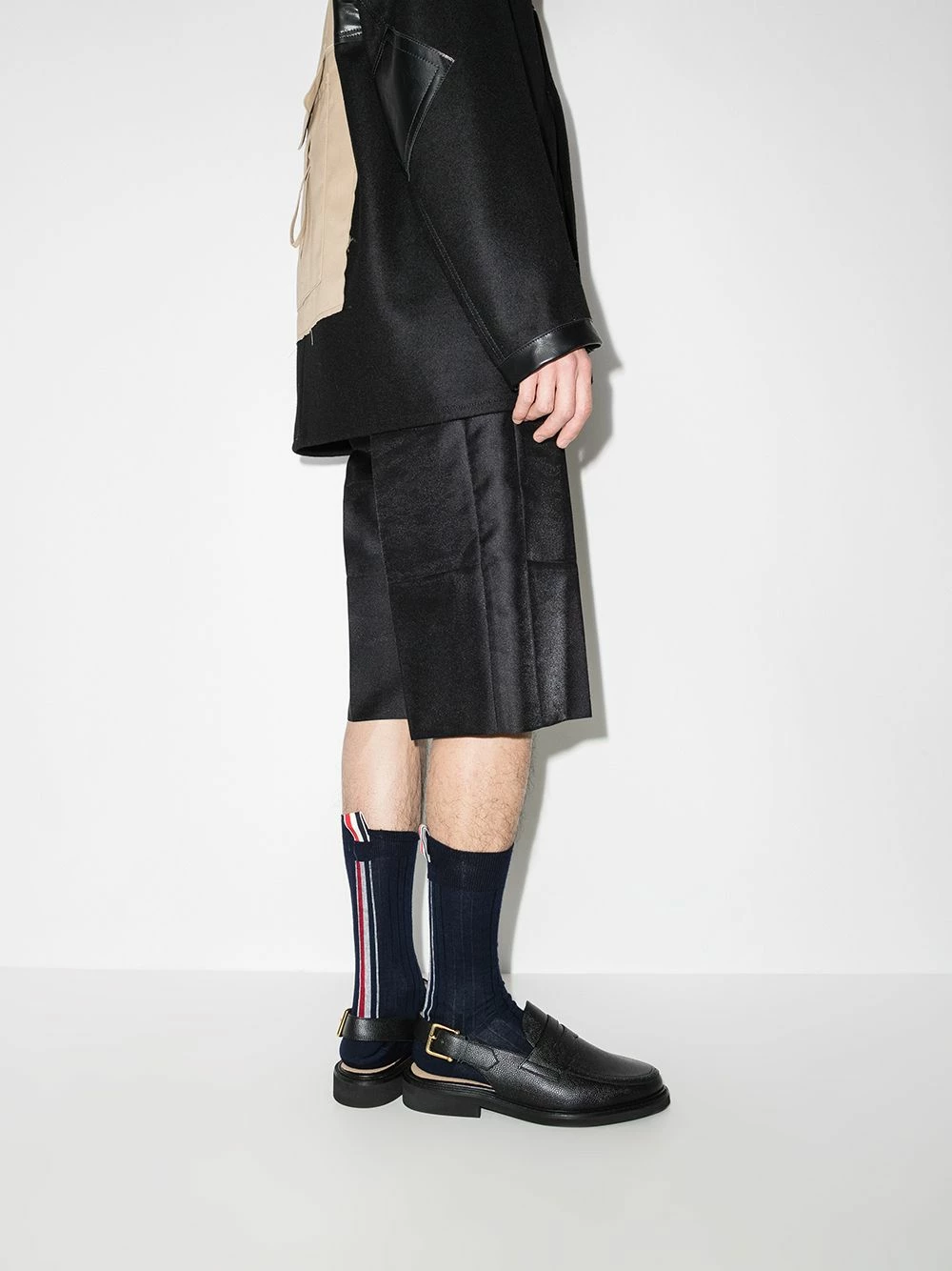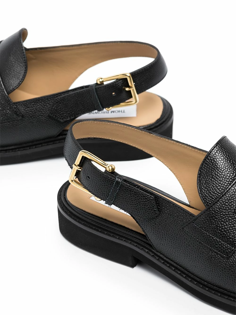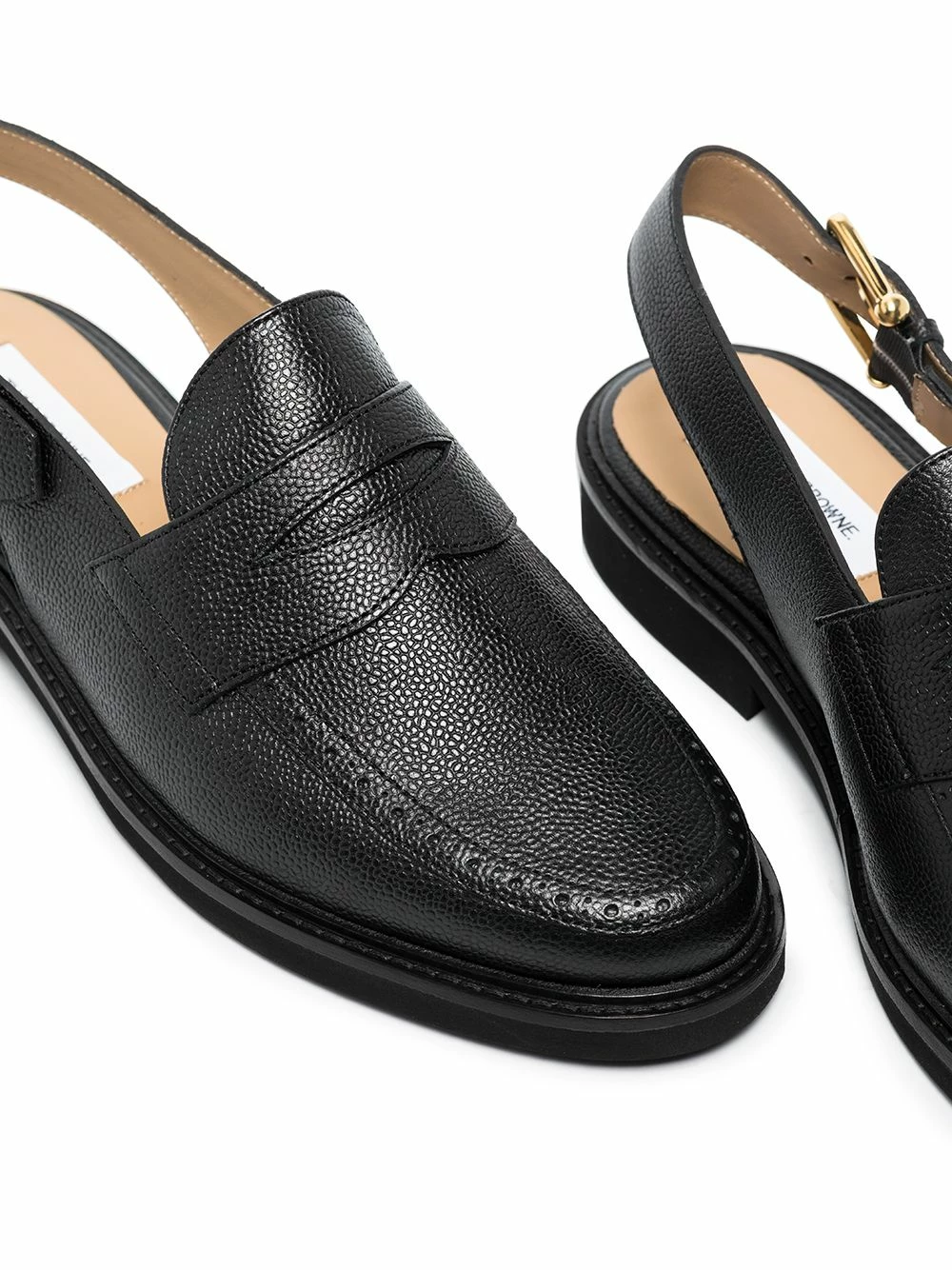 THOM BROWNE transforms the classic silhouette of these loafers. Crafted from black leather and cut to a traditional almond-toe shape adorned with the usual penny slot, this pair gets a contemporary update through the buckle-fastening slingback strap that secures it.