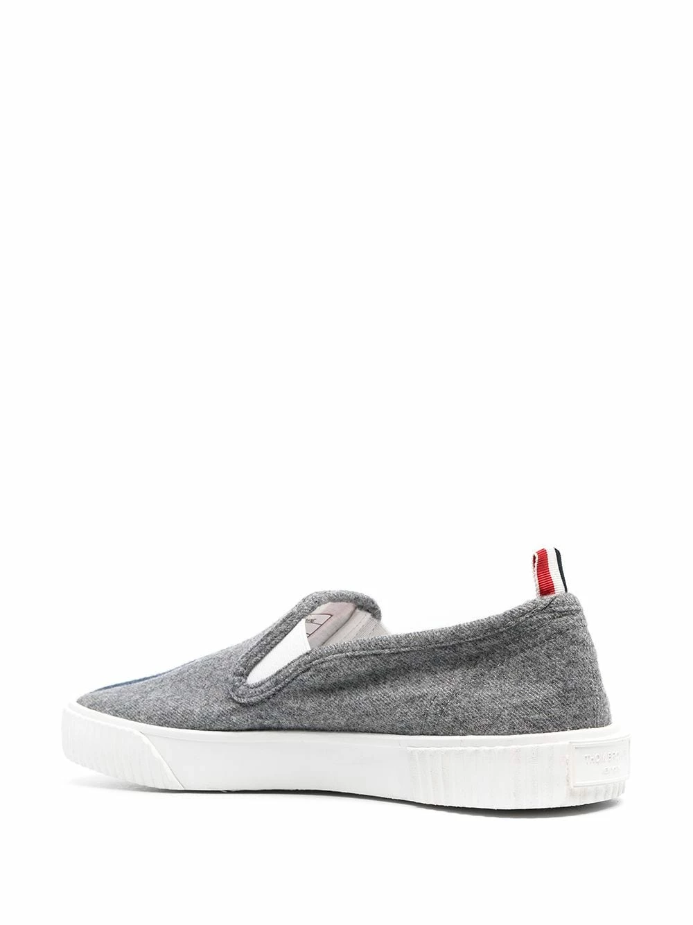 Earn your stripes, with theses lip-on heritage trainers from Thom Browne. The relaxed shoe features the signature three-stripe logo front and centre, a chunky rubber sole, round toe, in a slip-on style with elasticated side panels and a felted finish. At ease!