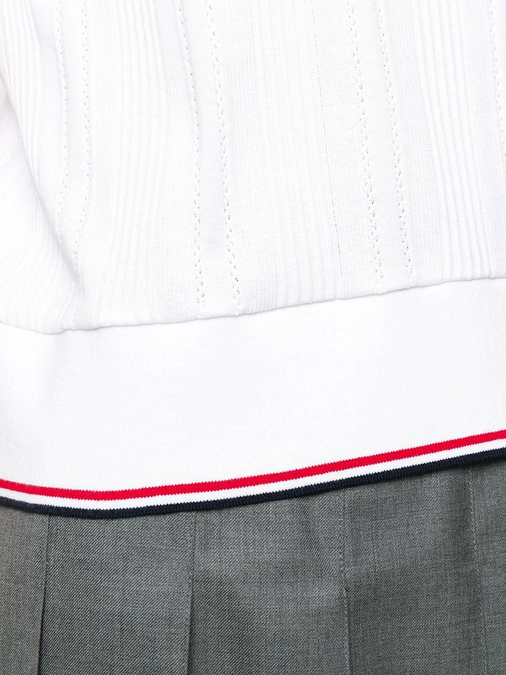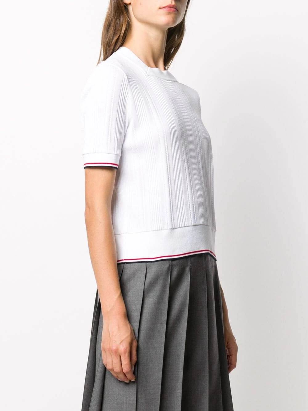 Earn your stripes, with this textured knit top from Thom Browne. The striped piece features a square neck, short sleeves, vertical stripe embroidery, knitted construction and stripe trim. You can thank us later.