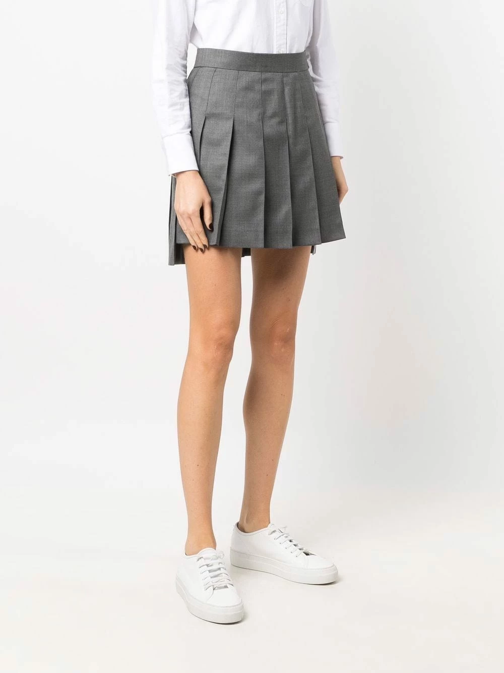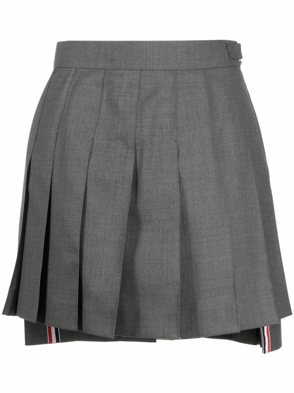 Showcasing Thom Browne’s focus on tailoring, this pleated skirt boasts a high-low hemline. The brand’s signature RWB stripe adds a bold touch to this piece.