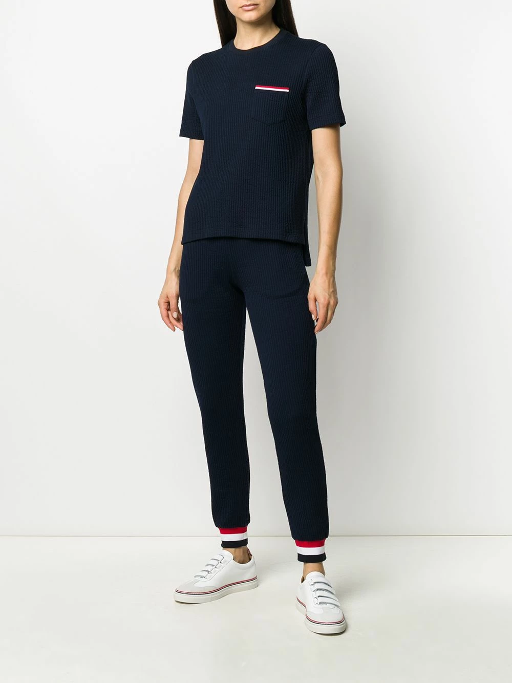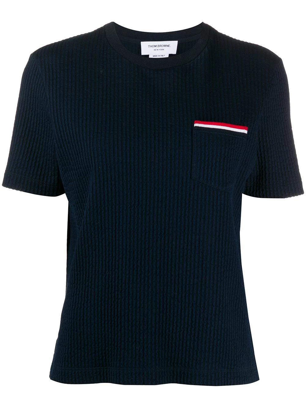 Who says that seersucker is just for summer? Thom Browne challenges the norm with this seersucker short-sleeve T-shirt. The signature RWB stripe at the pocket makes it instantly recognisable. Featuring a patch pocket at the chest, a round neck, seersucker knit and RWB stripe on the pocket.