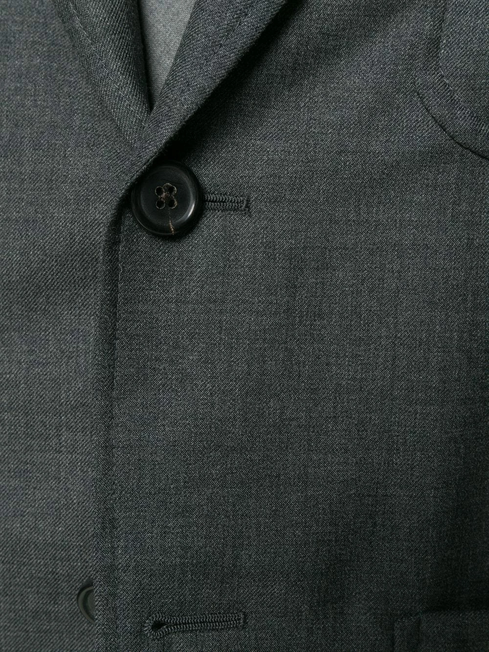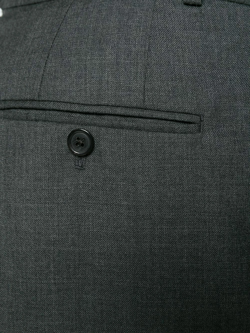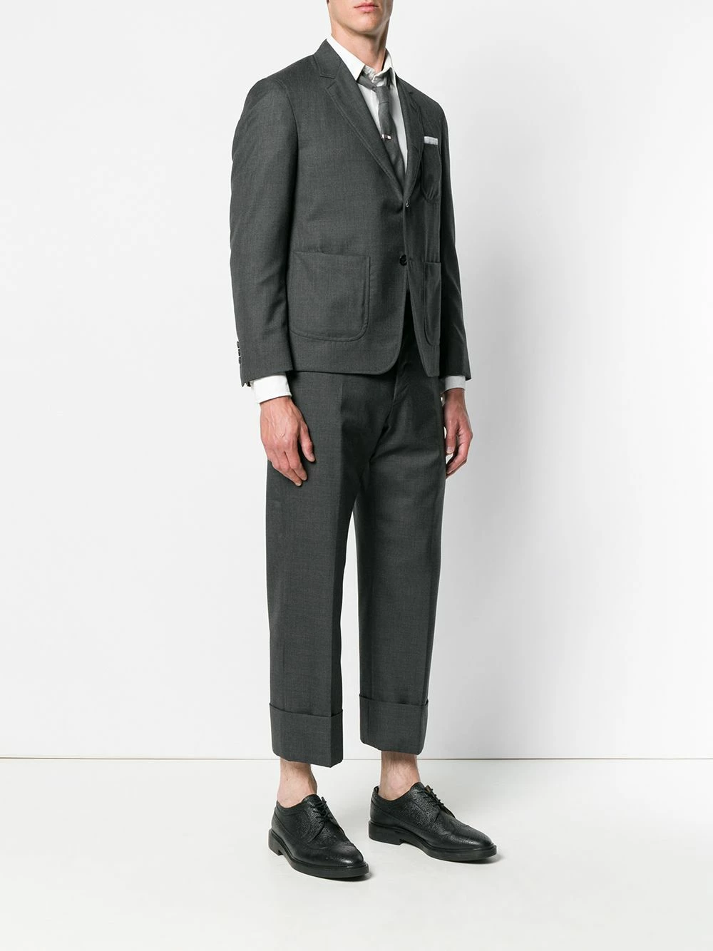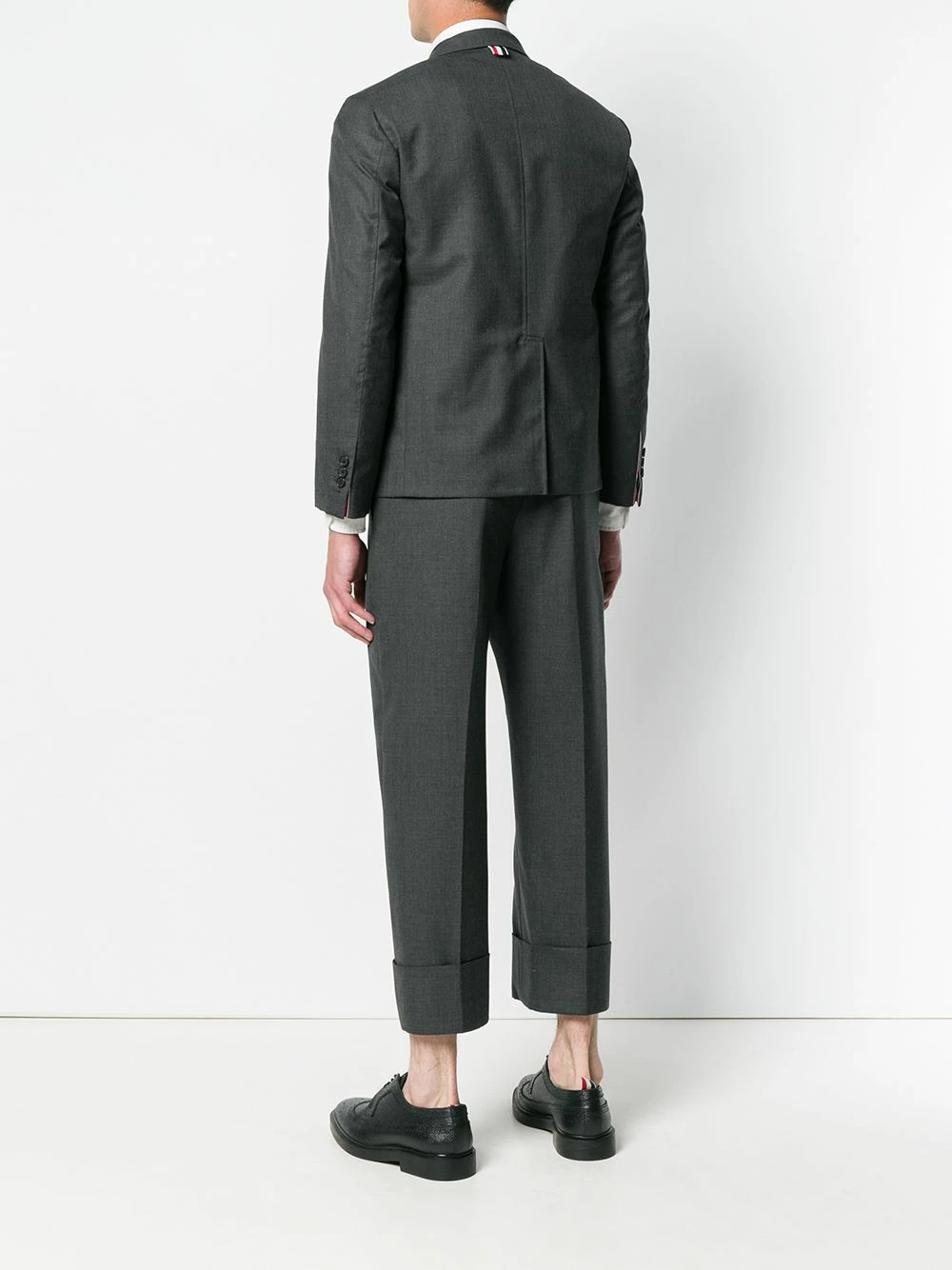 Never thought you were going to be a suit, working nine to five? Us neither, but this dark grey wool Super 120s formal suit from Thom Browne makes us want to jump out of bed every morning. Go on, suit yourself. Featuring a blazer with notched lapels, a chest pocket, a front button fastening, patch pockets, long sleeves, button cuffs and a rear central vent. The trousers feature belt loops, side slit pockets, two back buttoned welt pockets, a straight leg and a cropped length.