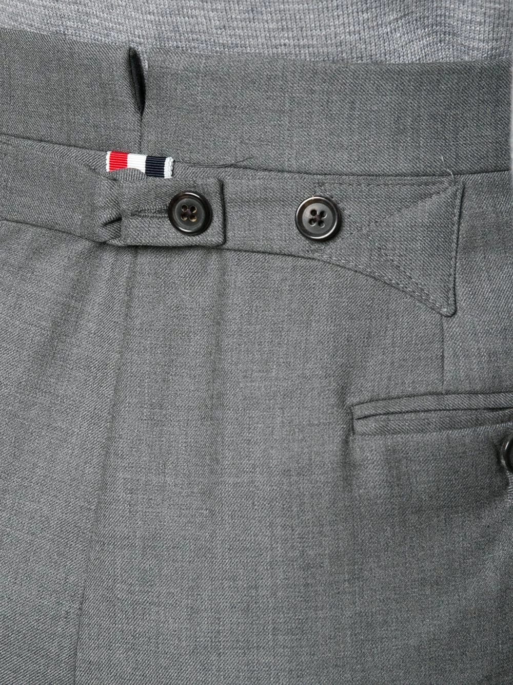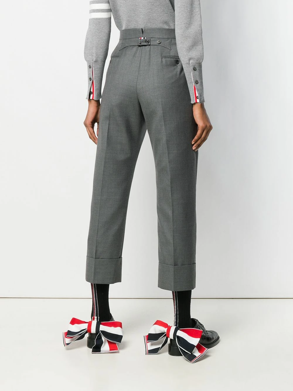Do you prefer a more traditionally-masculine style of tailoring? Then you’ll want to introduce yourself to these cropped trousers from Thom Browne. We’re sure the two of you will get along famously. Featuring a high waist, a concealed front fastening, rear welt pockets, a turned up hem, a cropped length and a signature grosgrain loop tab. This item fits large, please select half a size down.