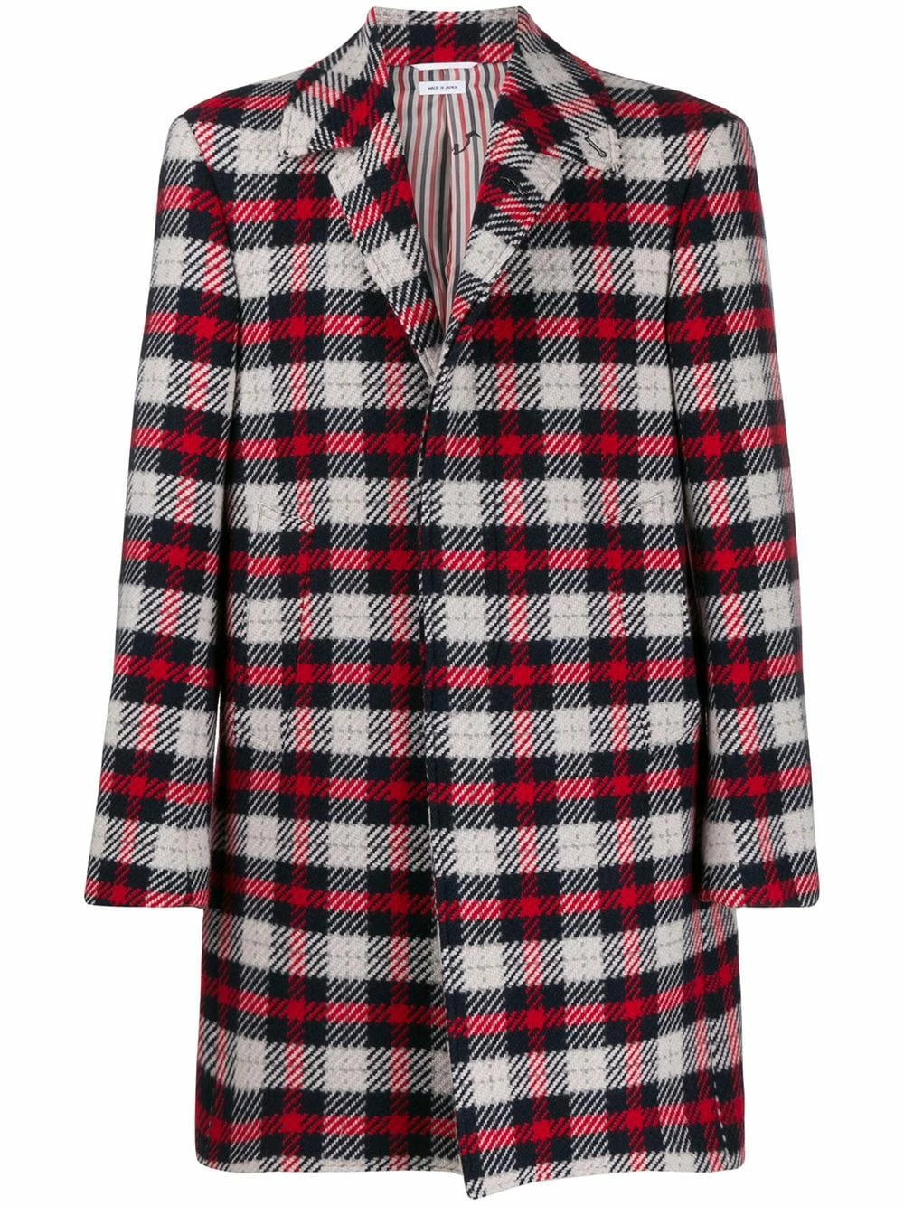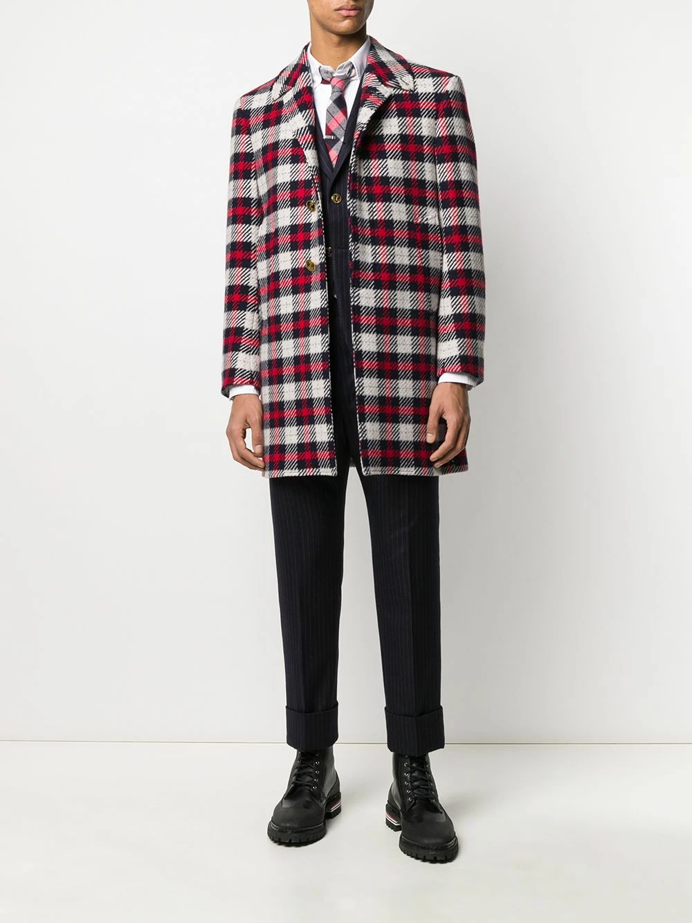 Crafted from soft cashmere in the brand’s code colours – red, navy blue and white – this tweed single-breasted overcoat from Thom Browne boasts a tartan check pattern all over and is finished with the signature grosgrain loop tab to the rear.
