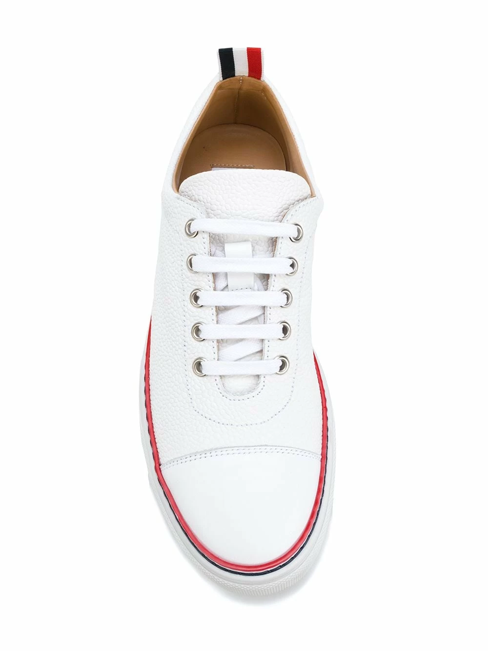 The classic Thom Browne leather sneaker is recreated as a monochrome model for this season’s Wimbledon-inspired capsule collection. Carefully crafted in Italy, they sit atop a cup sole with an insole bearing the brand logo for maximum comfort, and find a pebble grained calf leather exterior with a rubber toe cap. Featuring a contrasting red stripe detail as well as Browne’s signature stripe detail on a rear pull tab, these luxurious sneakers are bound to impress whether on or off the court.