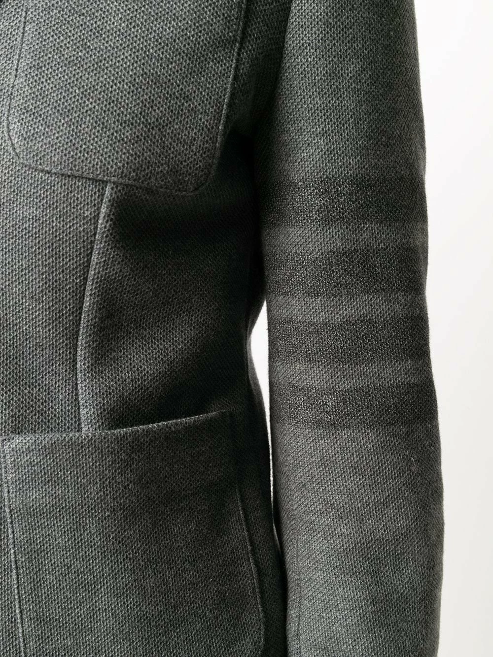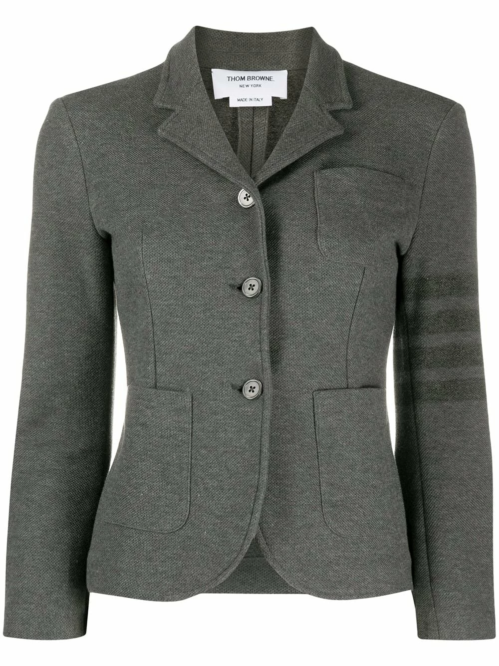 A little school feel. Crafted in medium grey double-face cotton twill, this Thom Browne jacket has a tonal 4-bar detail and a fitted silhouette. Because you can wear whatever you like. Featuring a fitted silhouette, a signature tri-colour striped trim, classic lapels, a front button fastening, button cuffs, a double vent to the rear, front pockets, no lining, a four-bar stripe on the upper arm and cropped long sleeves.