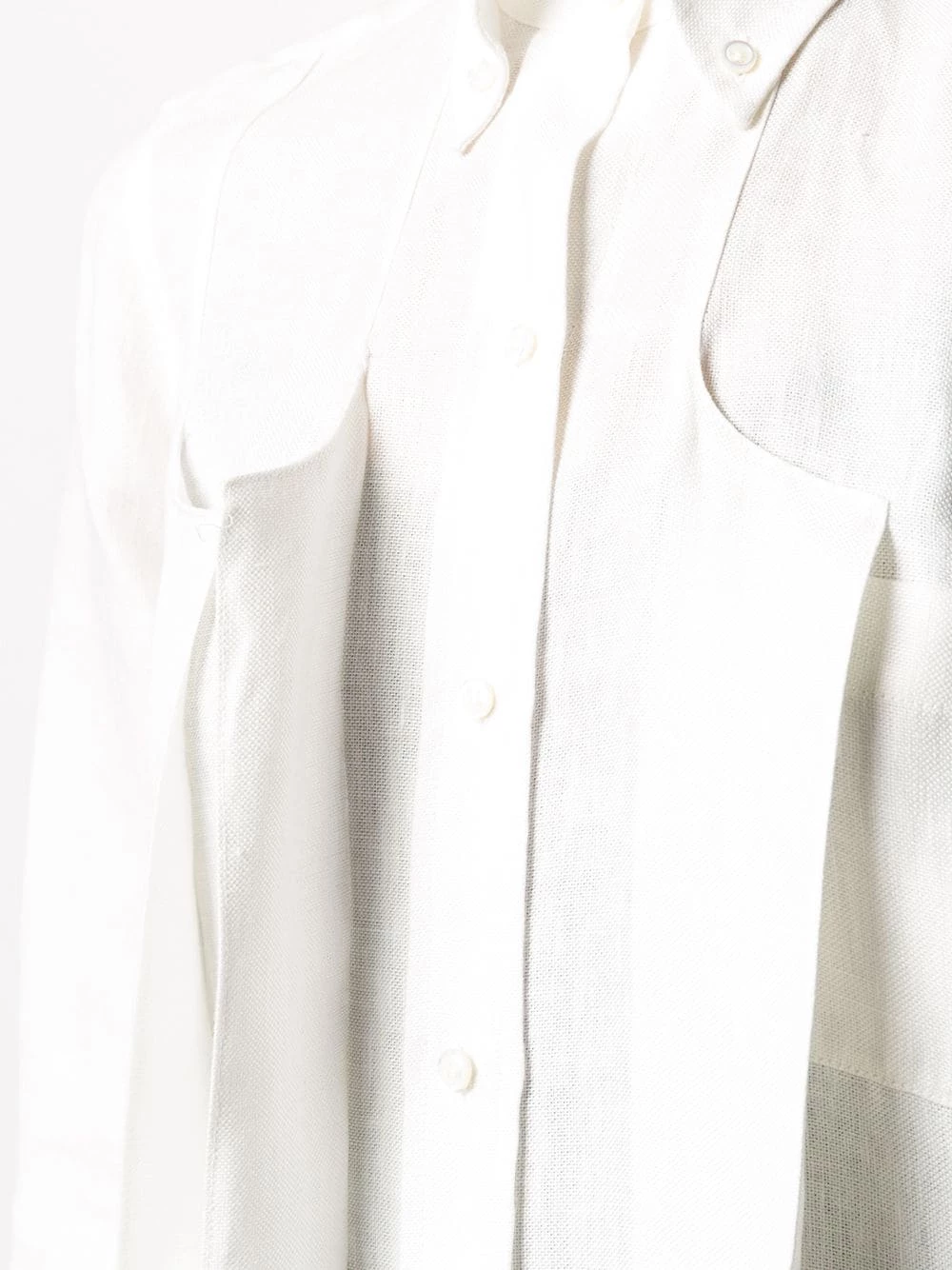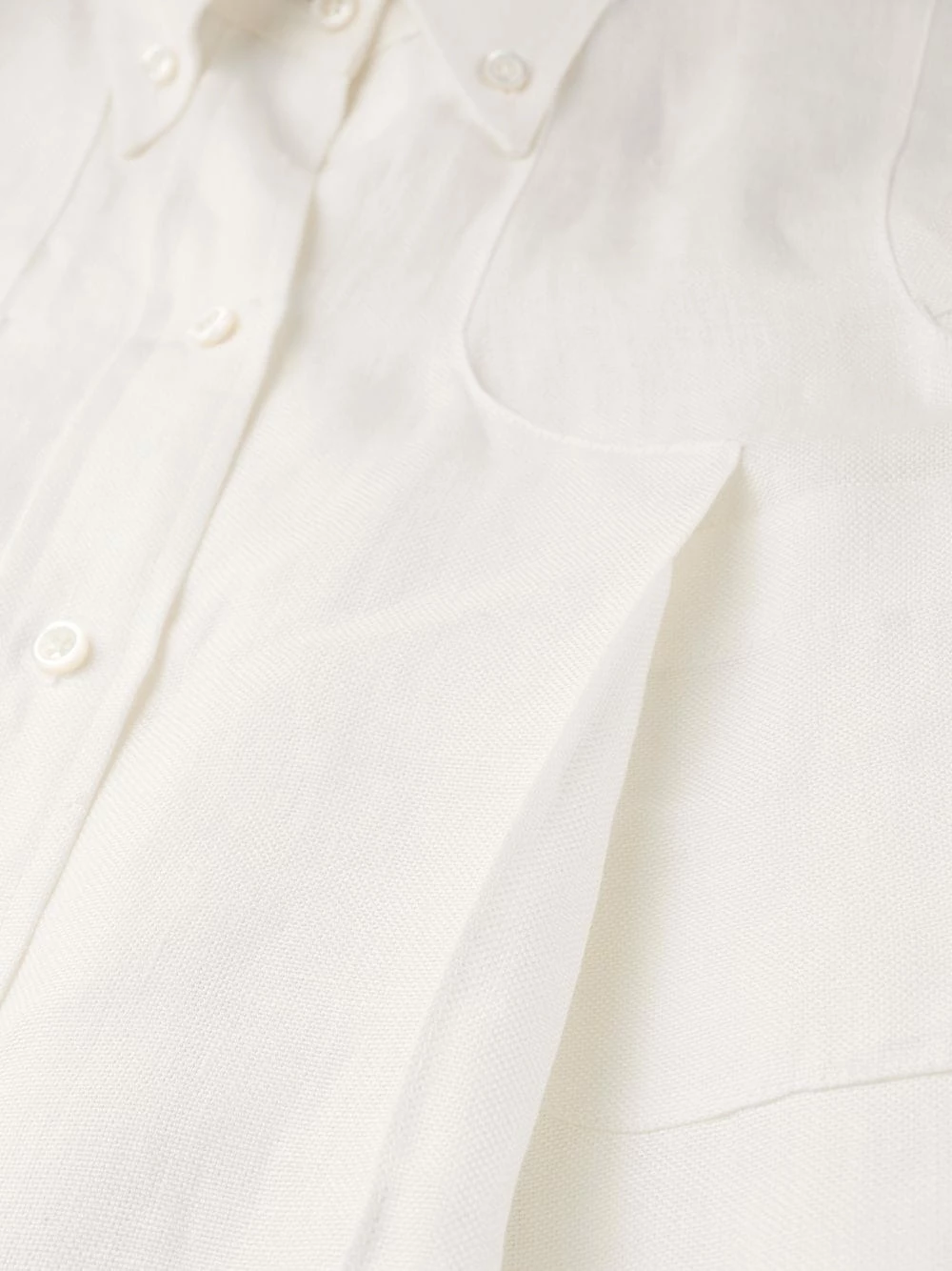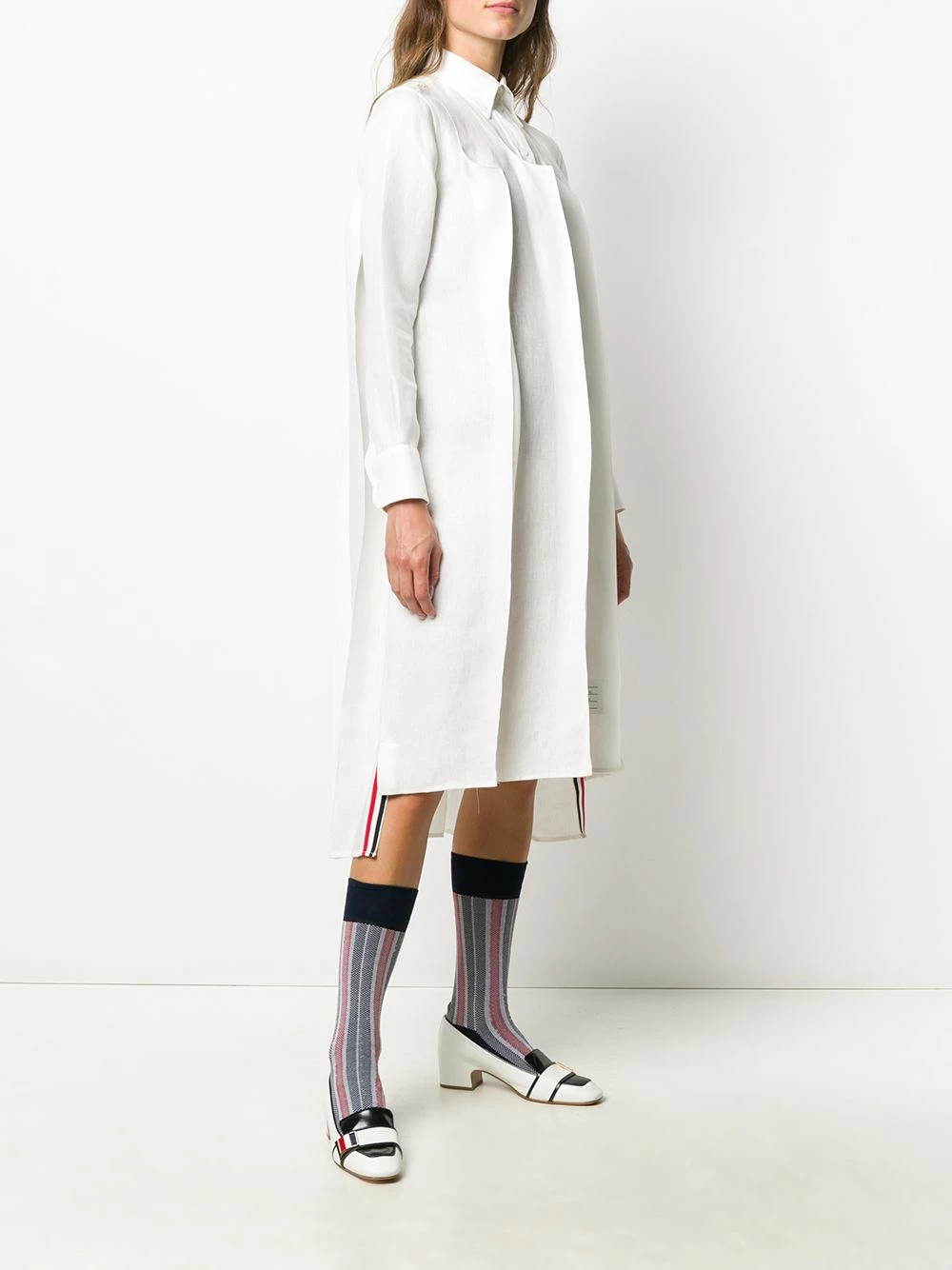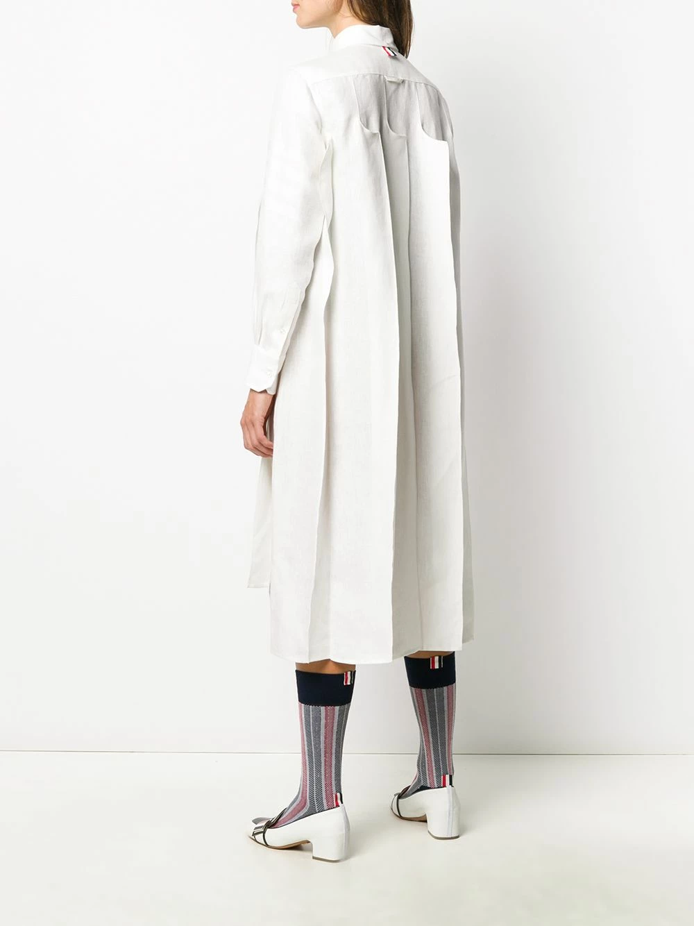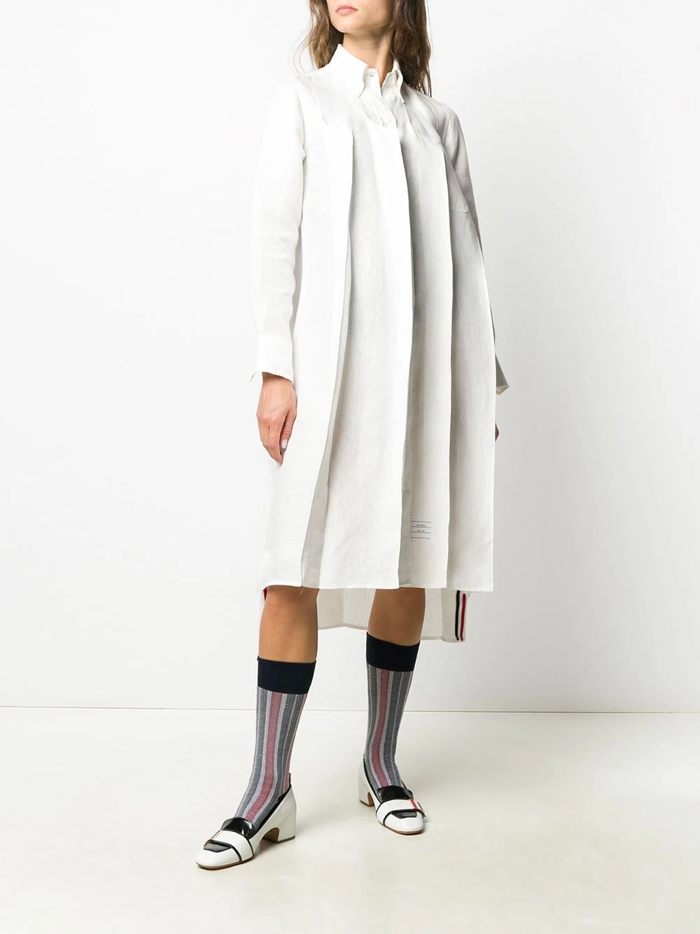 Be a linen day dream, in this tonal 4-Bar inverted pleat linen dress from Thom Browne.The artsy piece features oversize pleat detailing, long sleeves, buttoned-cuff sleeves, front button fastening and classic collar. Did we mention it’s a positively conscious piece?