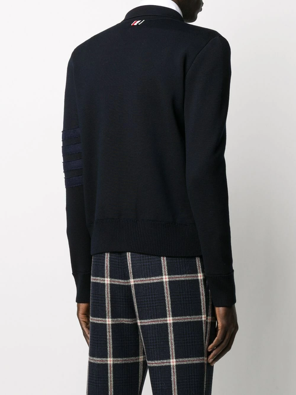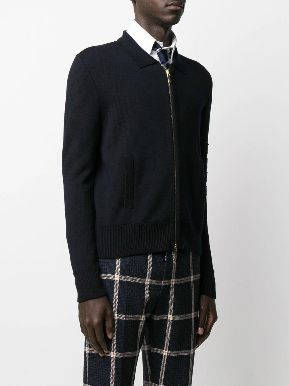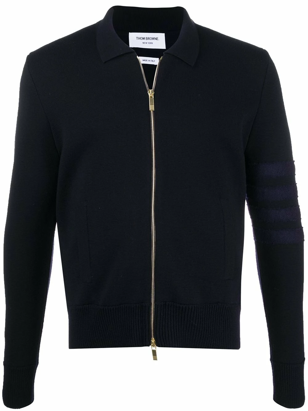 We know that you have a reputation for dressing well. Keep up appearances in this Merino wool zip-up bomber jacket from Thom Browne. Just because you’re wearing casual clothes doesn’t mean your usual high standards have to slip. Featuring a fine knit, a front zip fastening, long sleeves, fitted, side slit pockets and a signature four-bar detail.