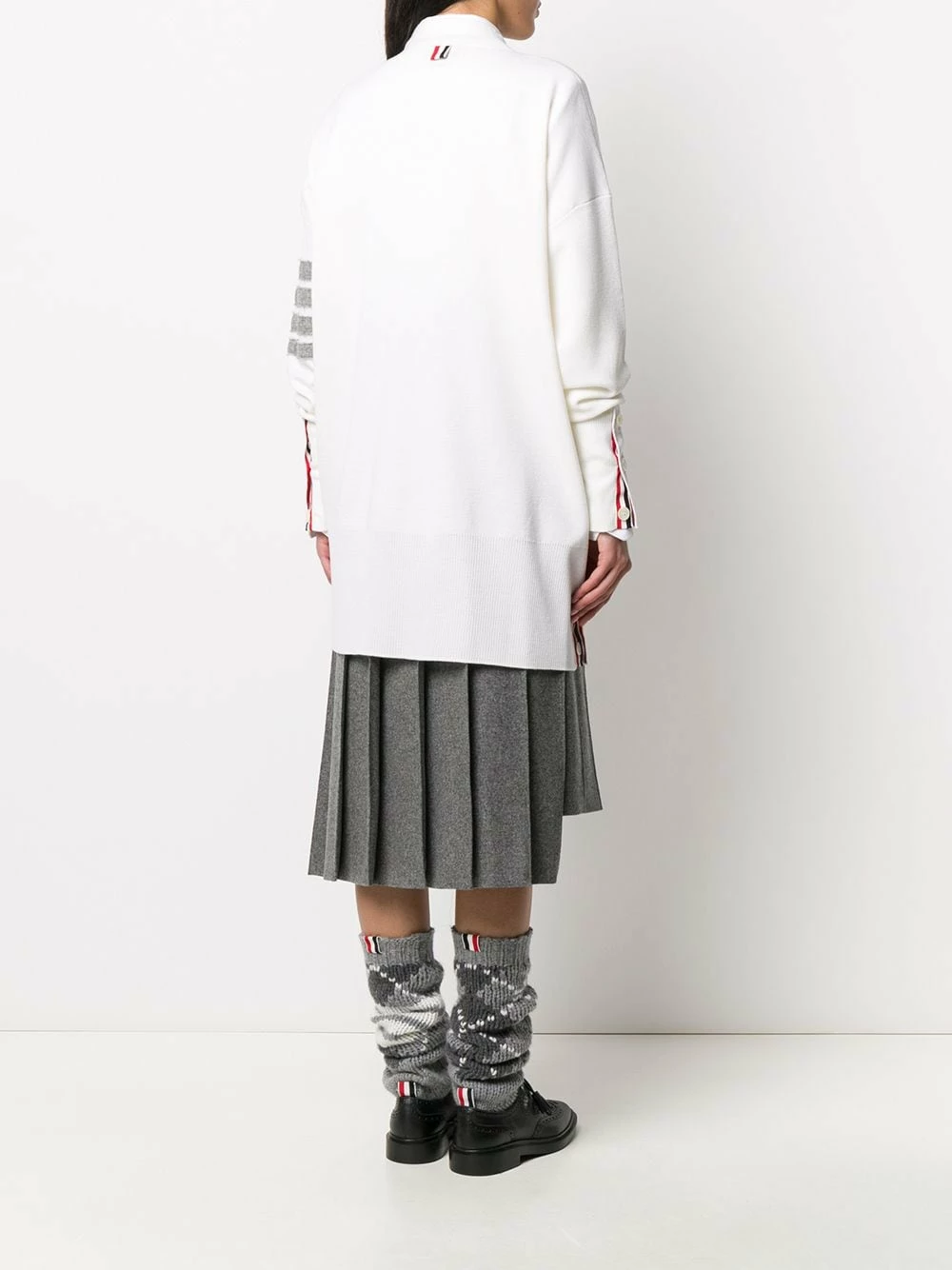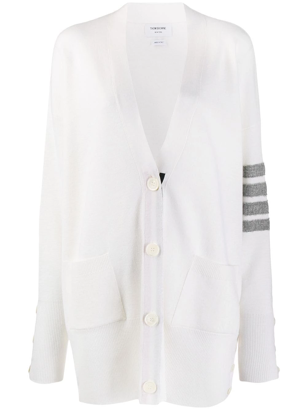 It’s time to get cosy! It’s also time to make an impact! Do both at once, with this oversized cardi-coat from Thom Browne. Featuring a v-neck, dropped shoulders, a front button fastening, long sleeves, two front pockets, an oversized fit, a ribbed hem and cuffs, button cuffs, a RWB tab, a 4-Bar stripe, RWB details and buttons to the hem.