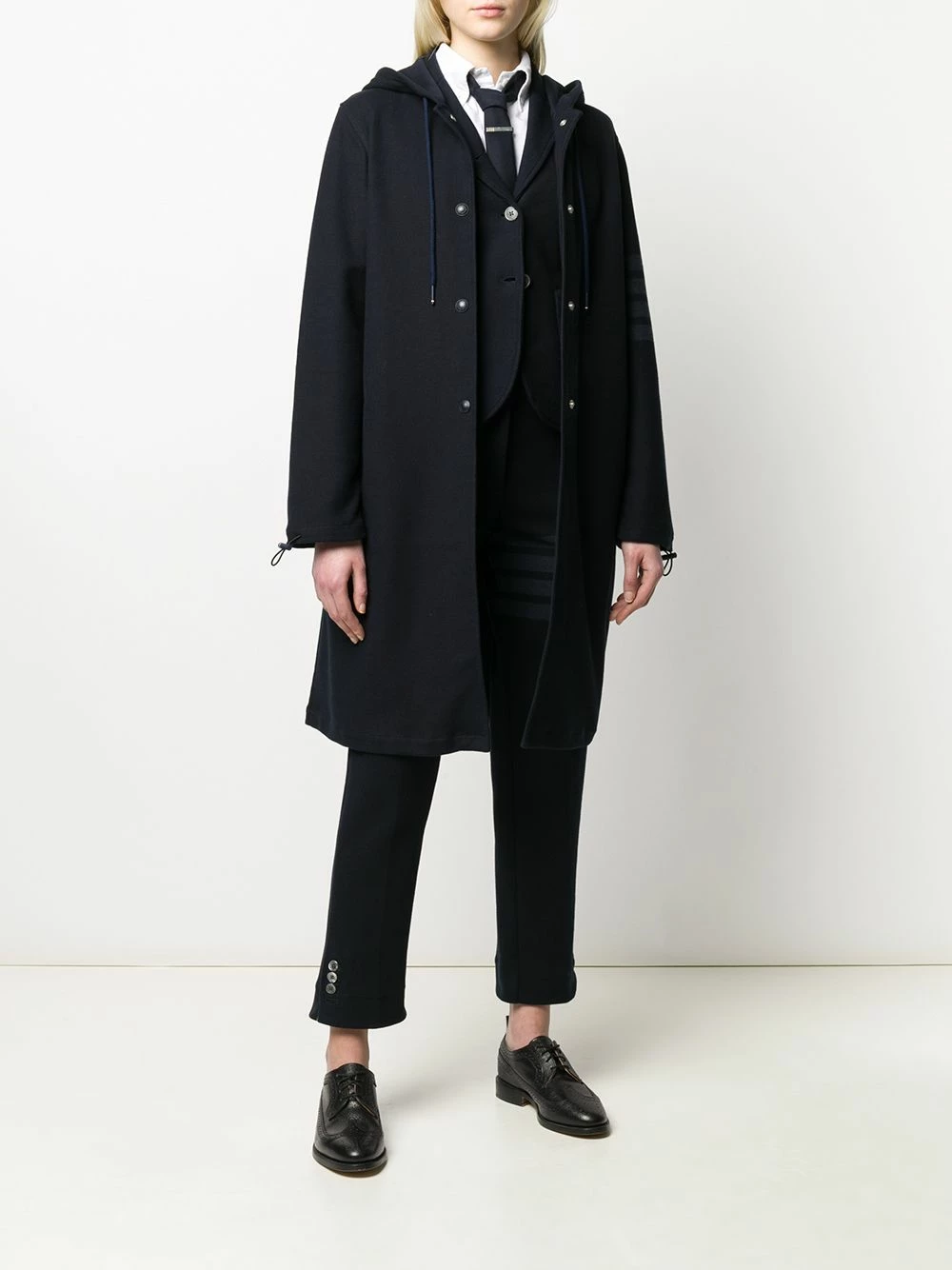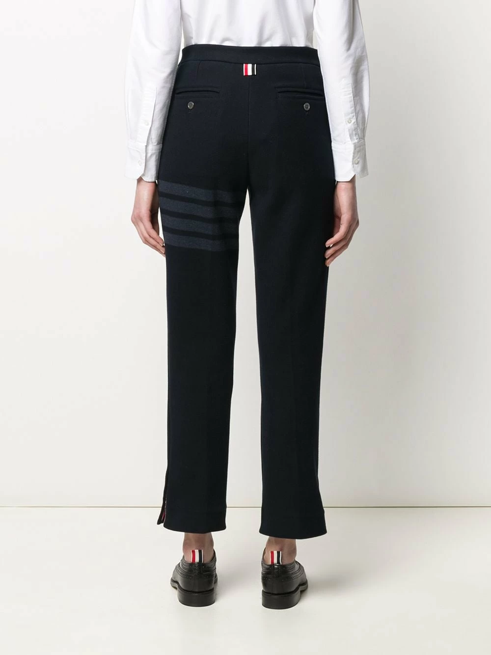 If you have to sit down on your in-laws’ sofa listening to that joke about a golfer for the million time, you might as well do it in Thom Browne. And these navy cotton tonal 4-Bar twill trousers might just do the trick. At least you’re not the joke. Featuring a mid-rise, belt loops, a button & zip fastening, side slit pockets, two back buttoned welt pockets, tone-on-tone 4-bar print to the left leg, a signature 4-bar pull tab at the rear and button details at the hem.