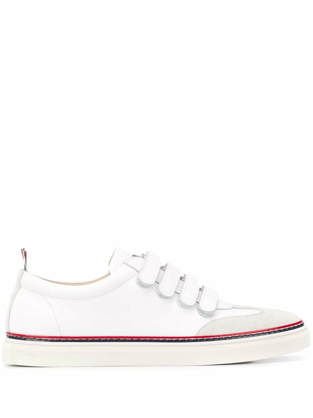 Give your days a kick thanks to these white calf leather touch-strap low-top sneakers from Thom Browne. And bounce onto any adventure life throws at you. Featuring a signature tri-colour striped trim, a pull tab at the rear, a logo patch at the tongue, a touch strap fastening, an almond toe and a flat rubber sole.
