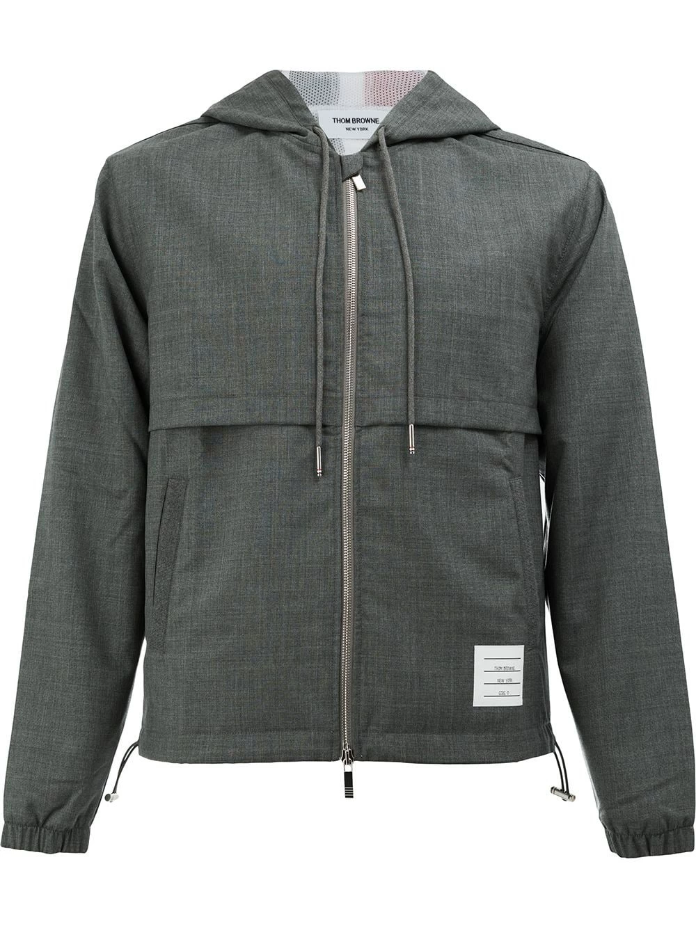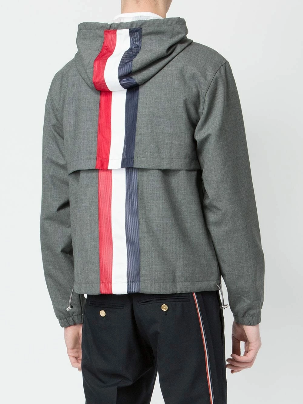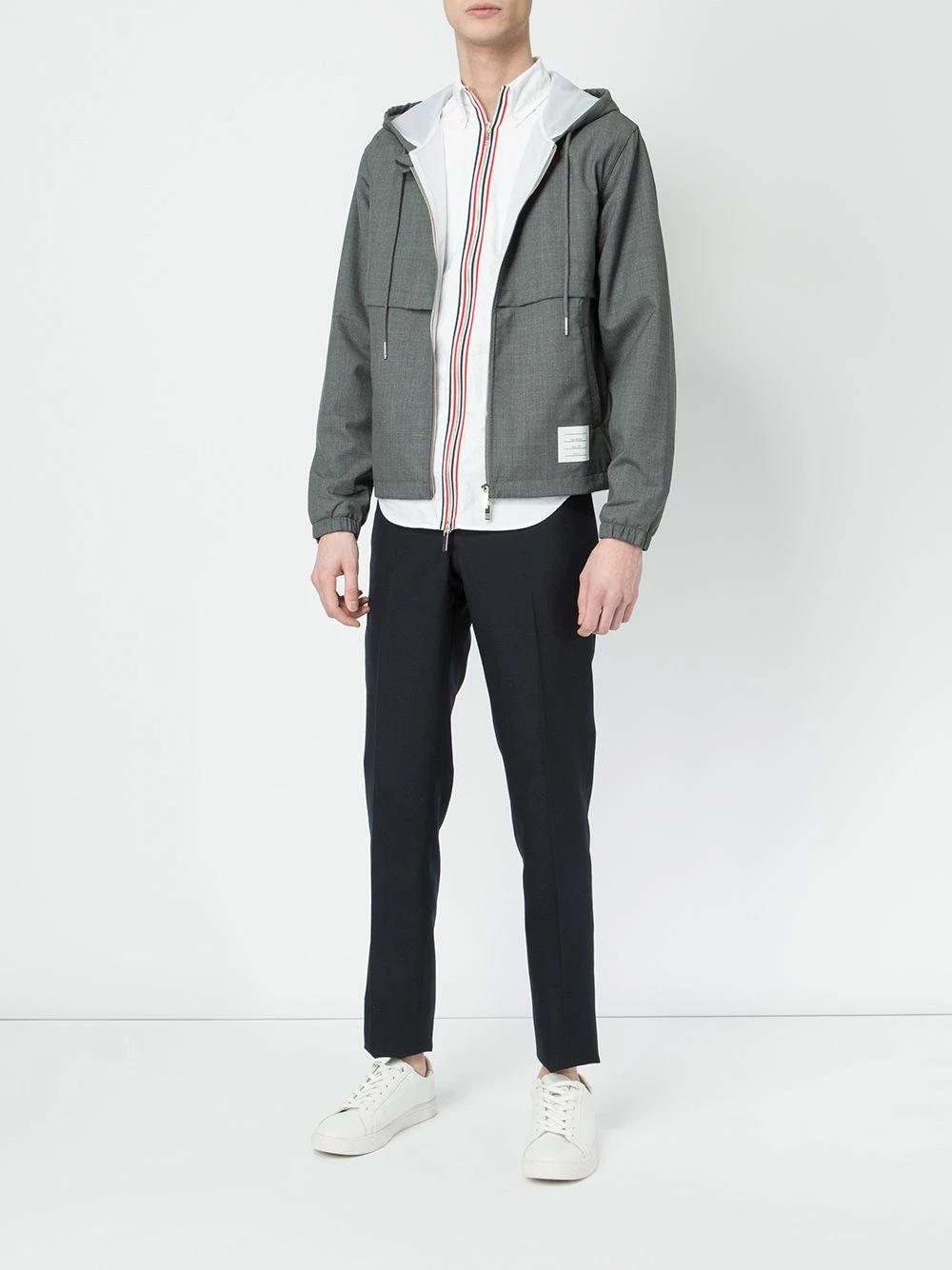 Browne’s source of inspiration and knowledge float in between refined tailoring and contemporary sportswear. Designed from super 120’s plain weave wool blend, this medium grey hooded jacket features a drawstring hood, a front zip fastening, long sleeves with elasticated cuffs, side slit pockets, a drawstring hem, a storm flap, a signature tri-colour striped trim and a printed logo to the front.