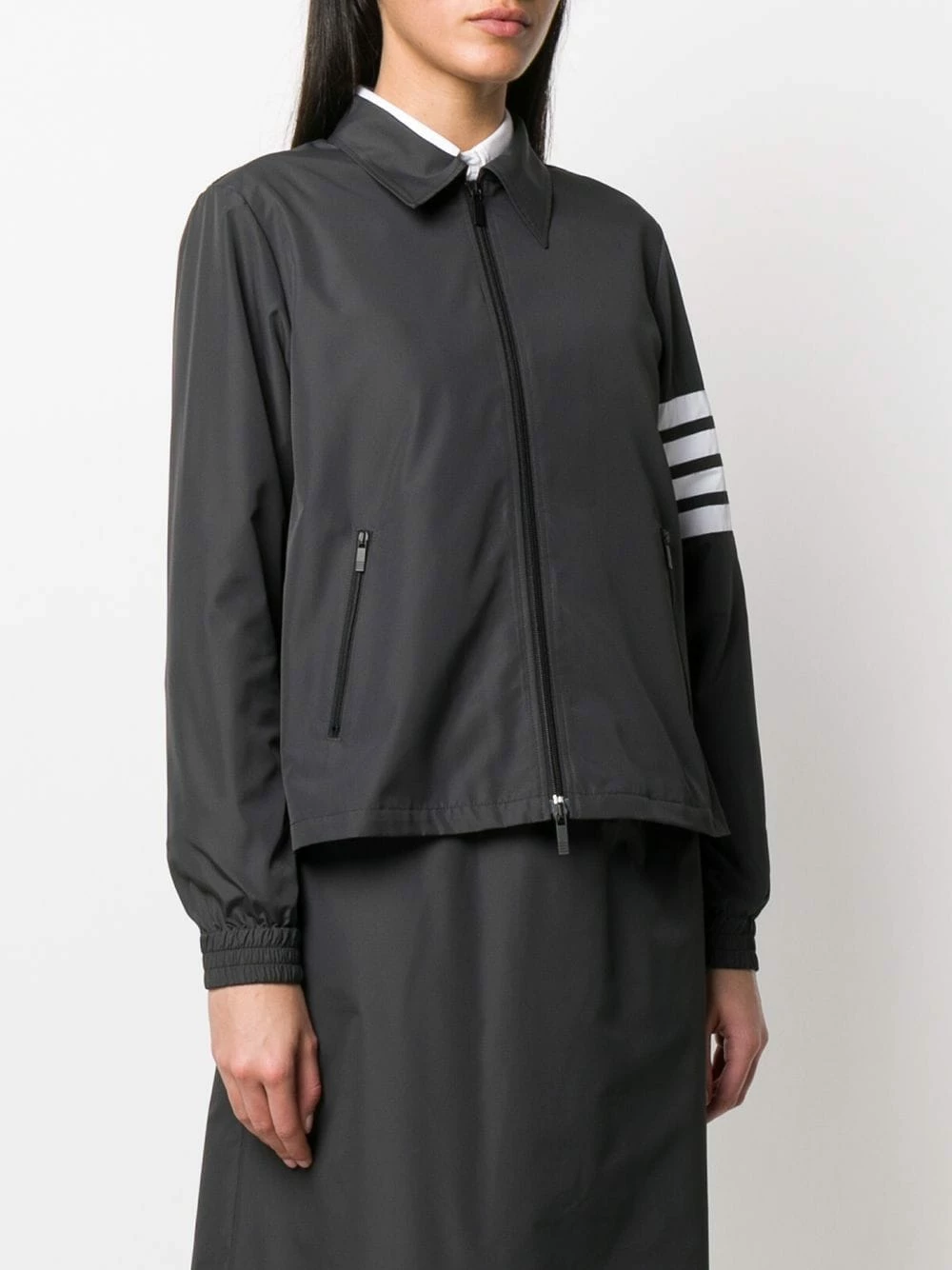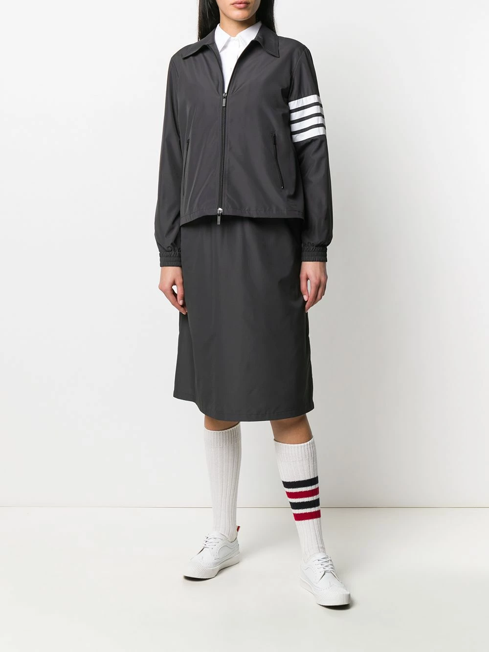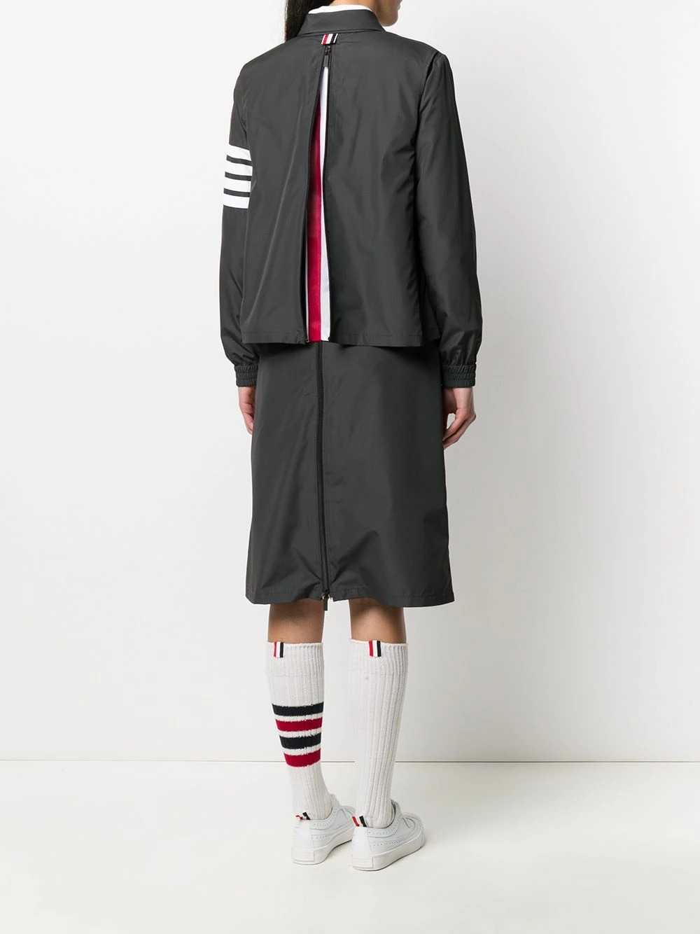 Can you never say no to a party? Well, a striped gusset makes this Thom Browne jacket, sporty in the front, and a party in the back. And you’re invited! Featuring a collar style, a front zip fastening, front zipped pockets, long sleeves, elasticated cuffs, a striped zip-up gusset, a RWB tab and a 4-Bar stripe.