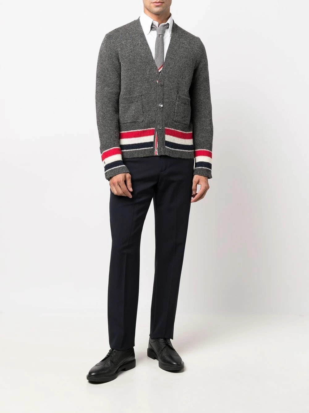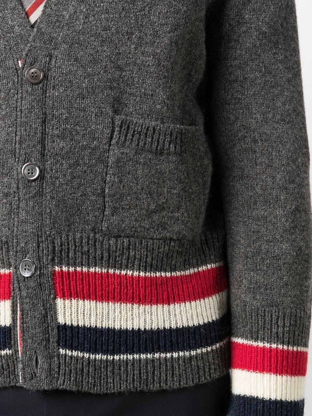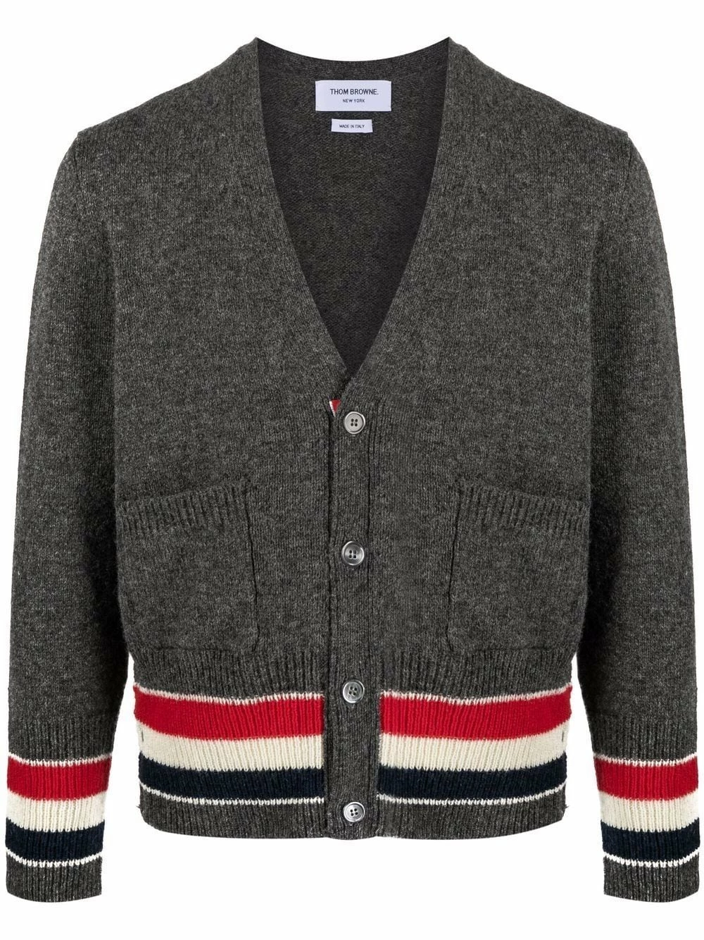 Thom Browne transforms its usually subtle tricolour signature detail into the centre of this cardigan’s design. The house’s iconic red, navy blue and white stripes is seen here on the ribbed cuffs and hem, paired with a grey wool construction.