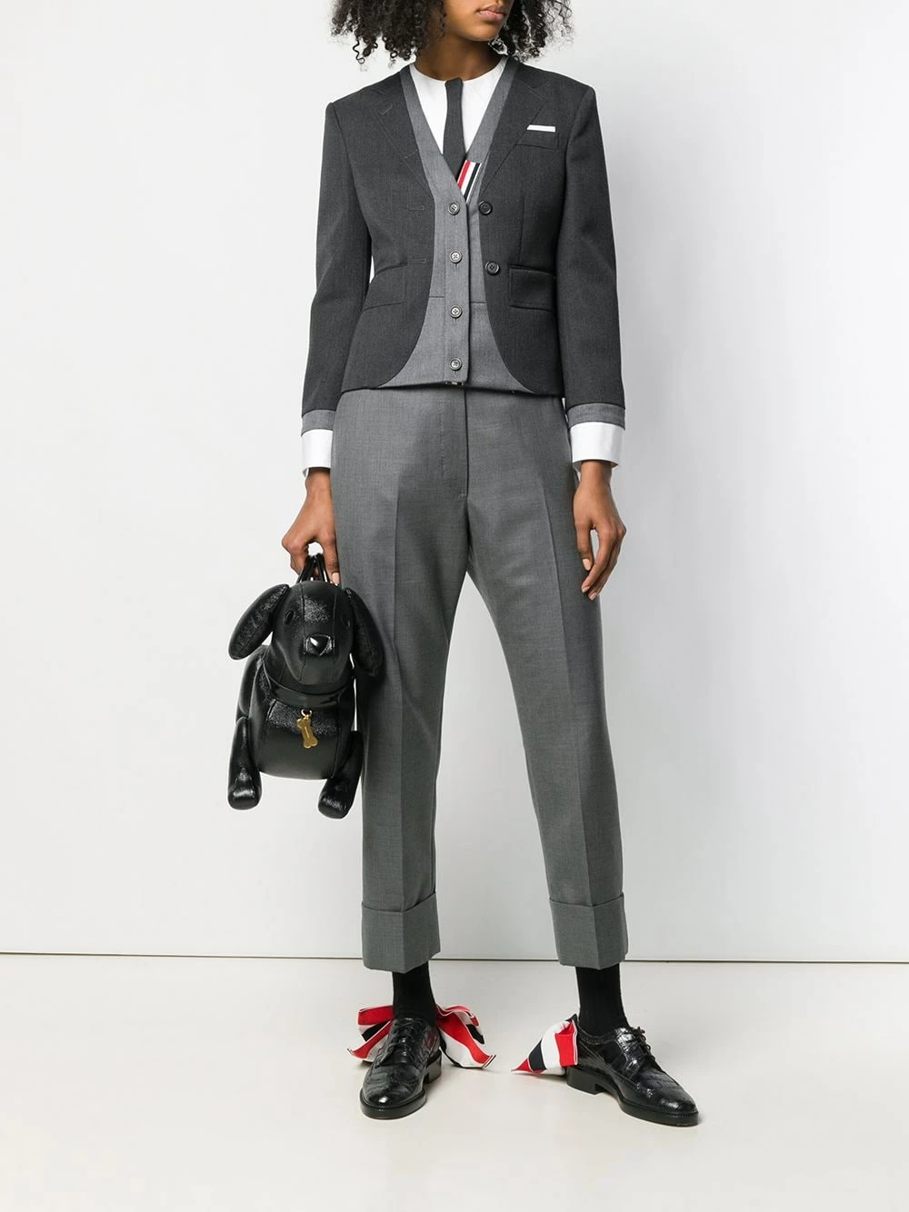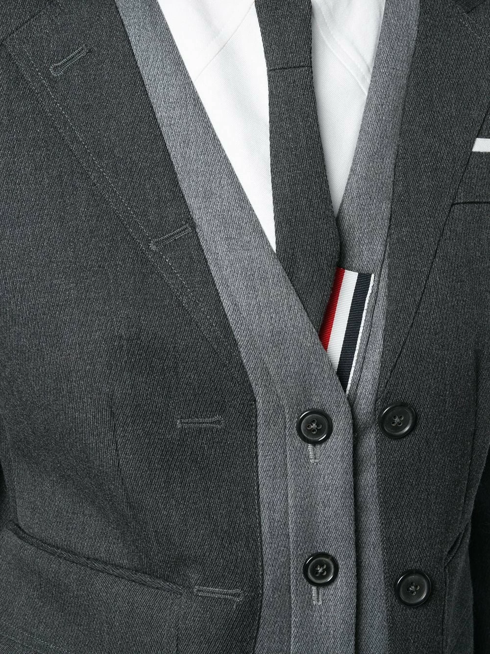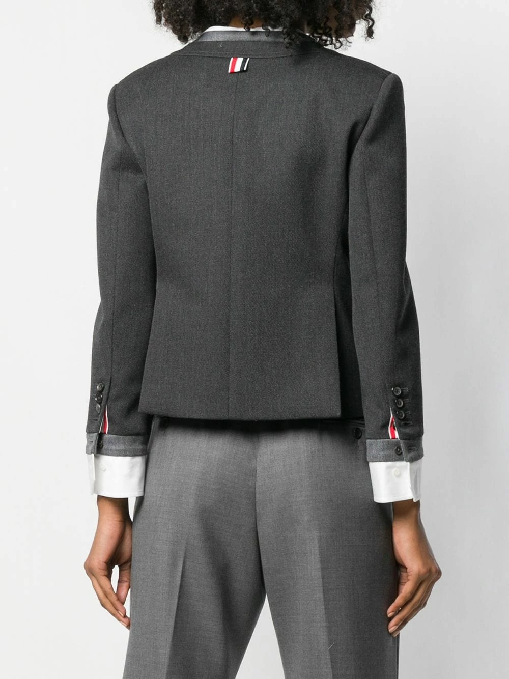 Since its launch in 2003, Thom Browne’s namesake label has gained notoriety for its clean designs and use of luxury materials, as showcased by this dark grey wool-cotton blend Trompe L’Oeil suit sport coat. Featuring long sleeves, button cuffs, a tricolour grosgrain tab on the rear, a striped lining and signature tricolour striped trimming details.