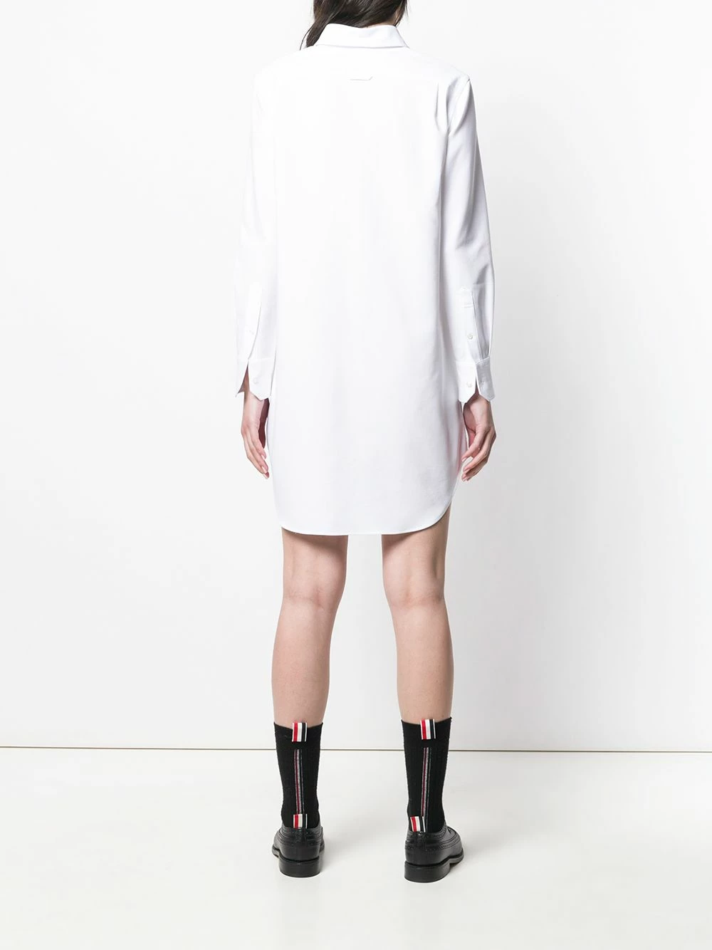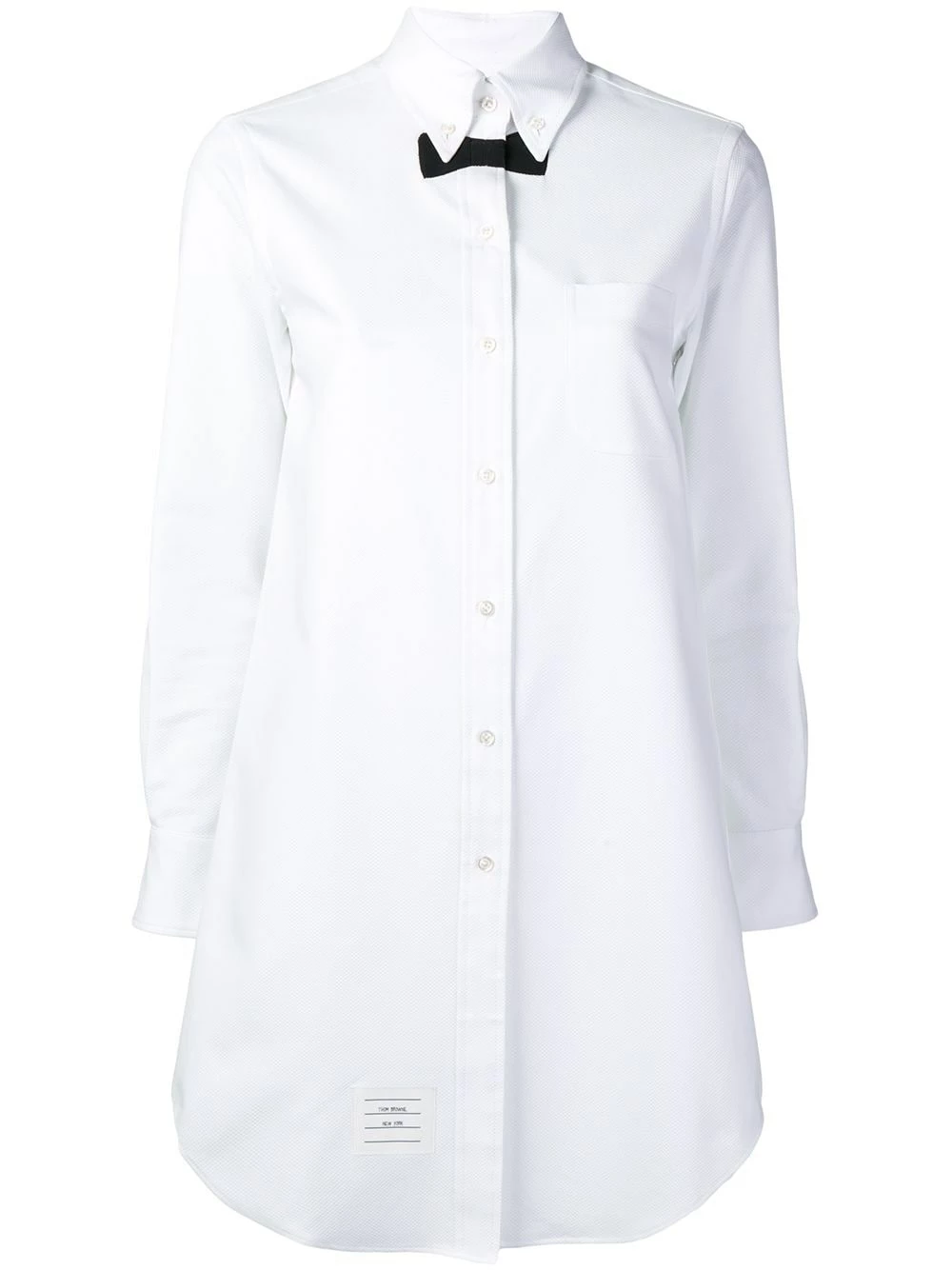 Do you like to be just that little bit different? Then you’ll want to go for this bow tie print white shirt dress from Thom Browne. Pull it on and stand out. Featuring a classic collar, a front button fastening, long sleeves, button cuffs, a chest pocket, a front logo patch, a curved hem, a short length and a bow tie print.
