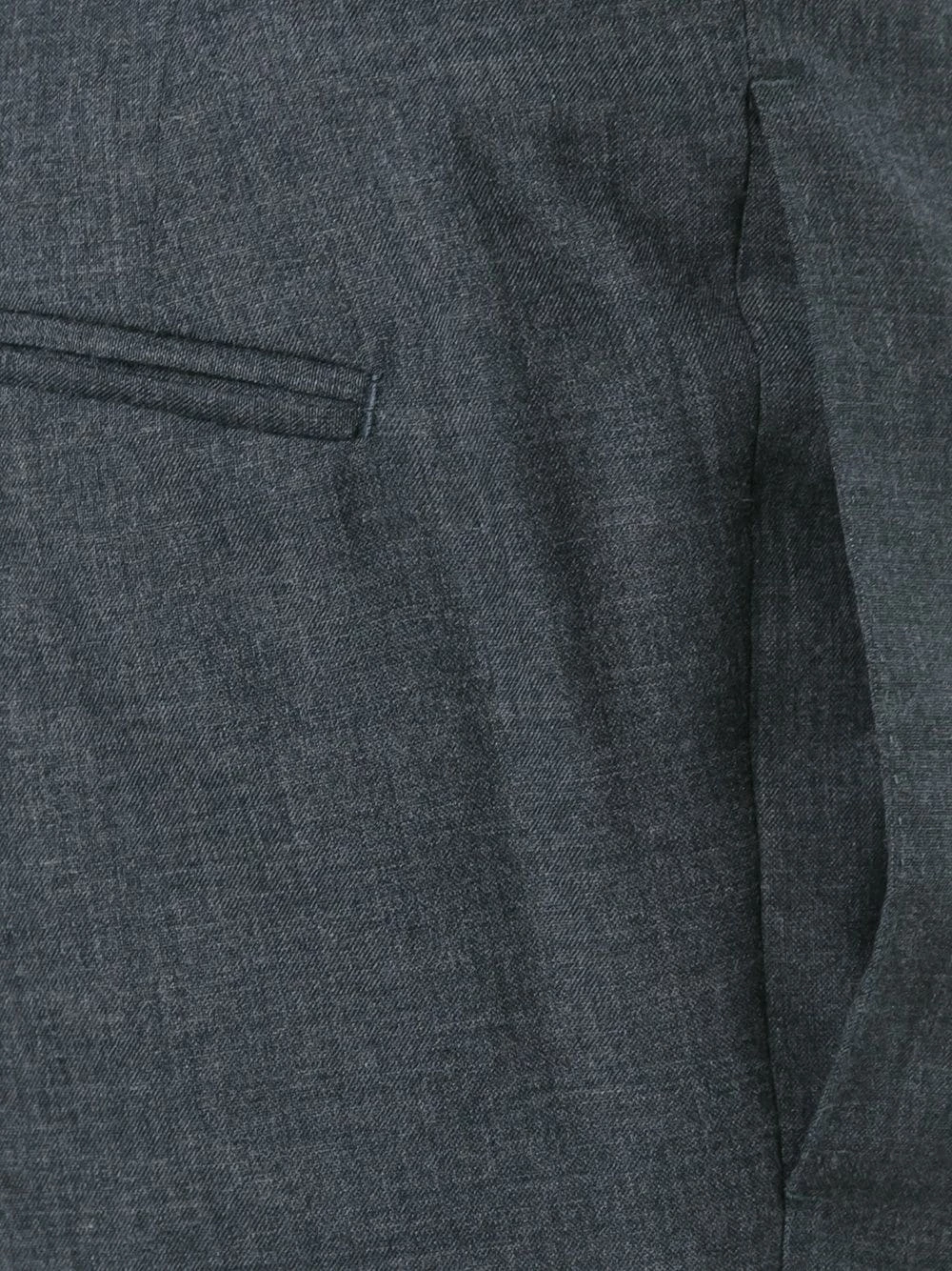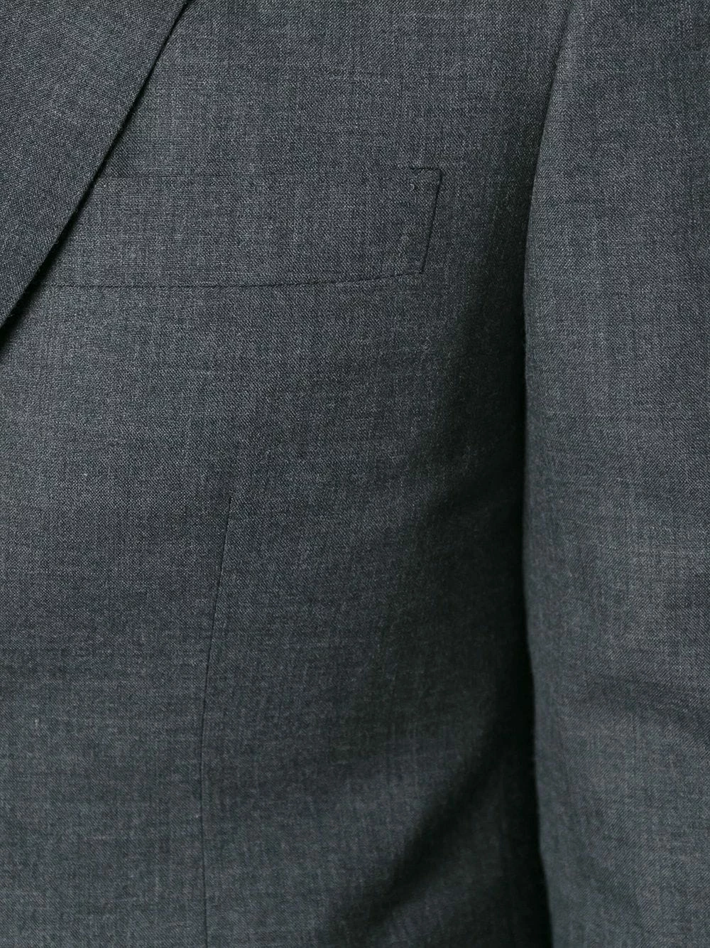 This grey suit bears all the hallmarks of Thom Browne, its single breasted silhouette crafted in a luxurious mohair blend wool. The jacket fastens with three buttons and is finished with notched lapels, welt pockets, buttoned cuffs, double vent and a striped tab to the rear, while the interior is fully lined with a striking striped fabric. The trousers take a straight cut, topped with a waistband, concealed fastening, side pockets, buttoned welt pockets and a tri-stripe patch.