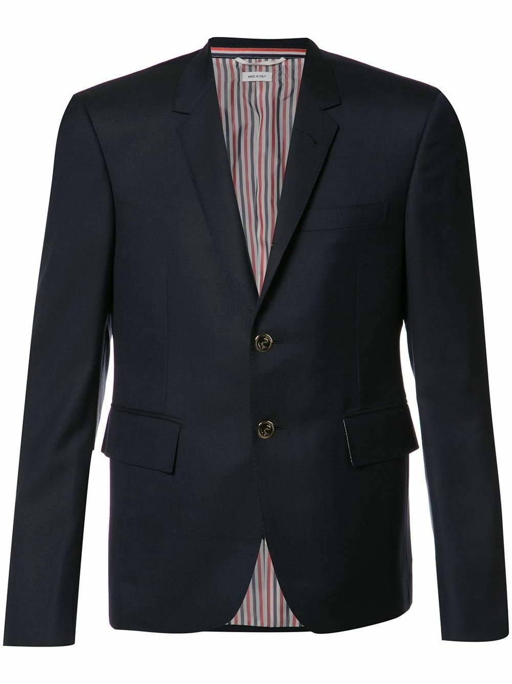 This dark blue blazer bears all the hallmarks of Thom Browne, its schoolboy silhouette crafted in lightweight wool, fastening with two buttons and finished with the tri-stripe detail to the rear. The single breasted style features all the classic details, with notched lapels, two front welt pockets, a welt pocket to the chest and buttoned cuffs, with a full tri-stripe lining.