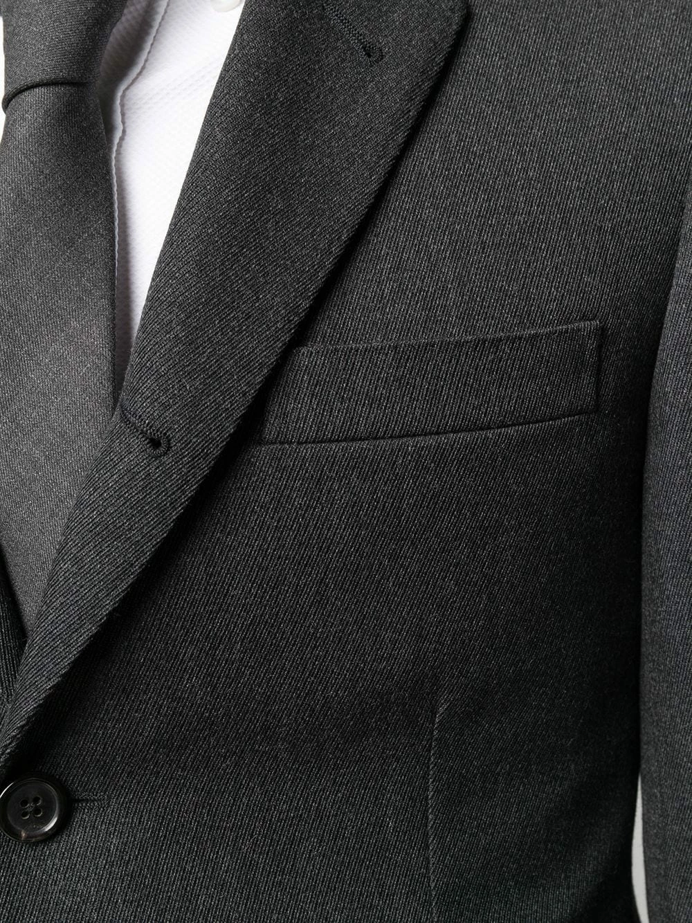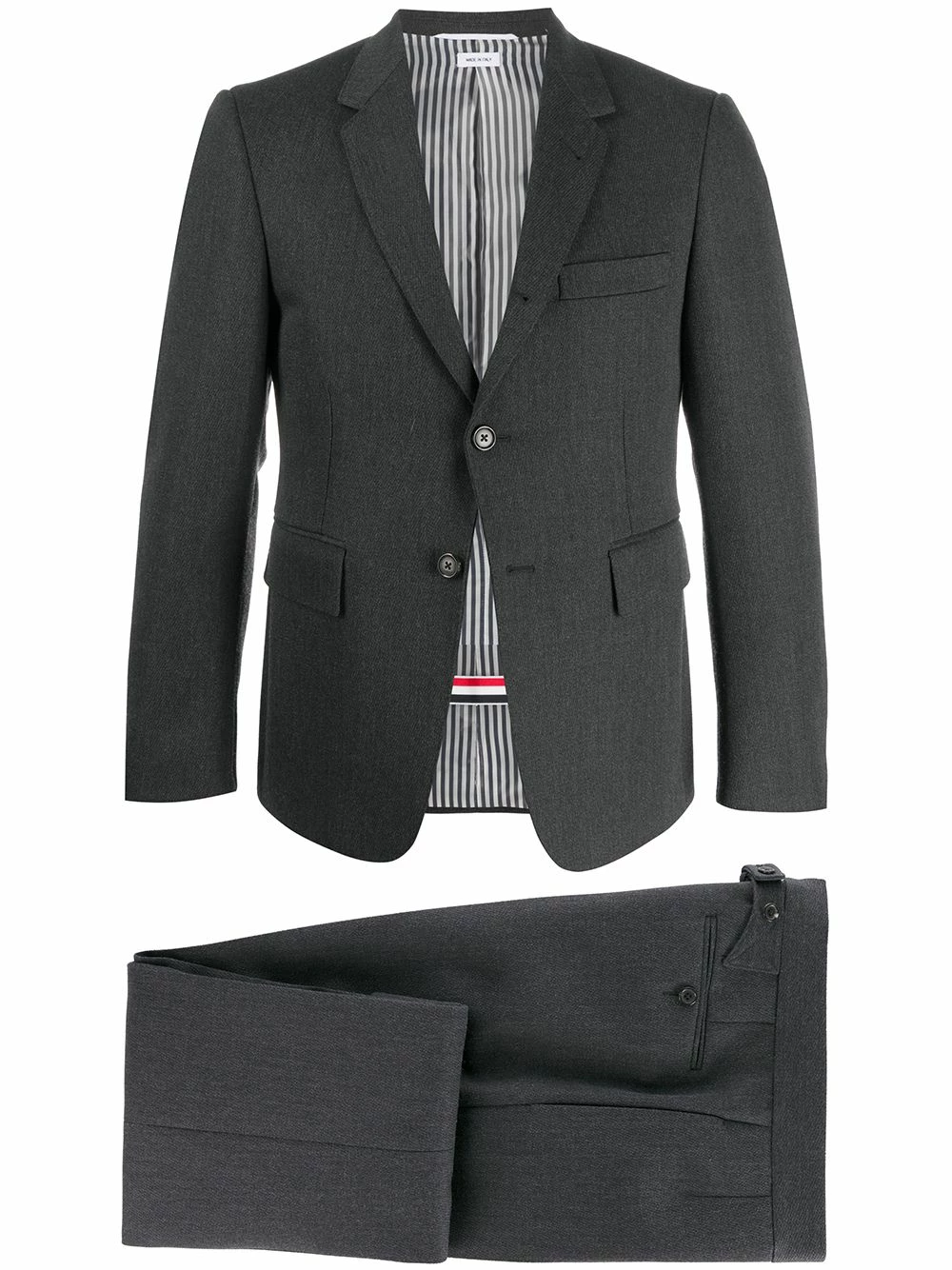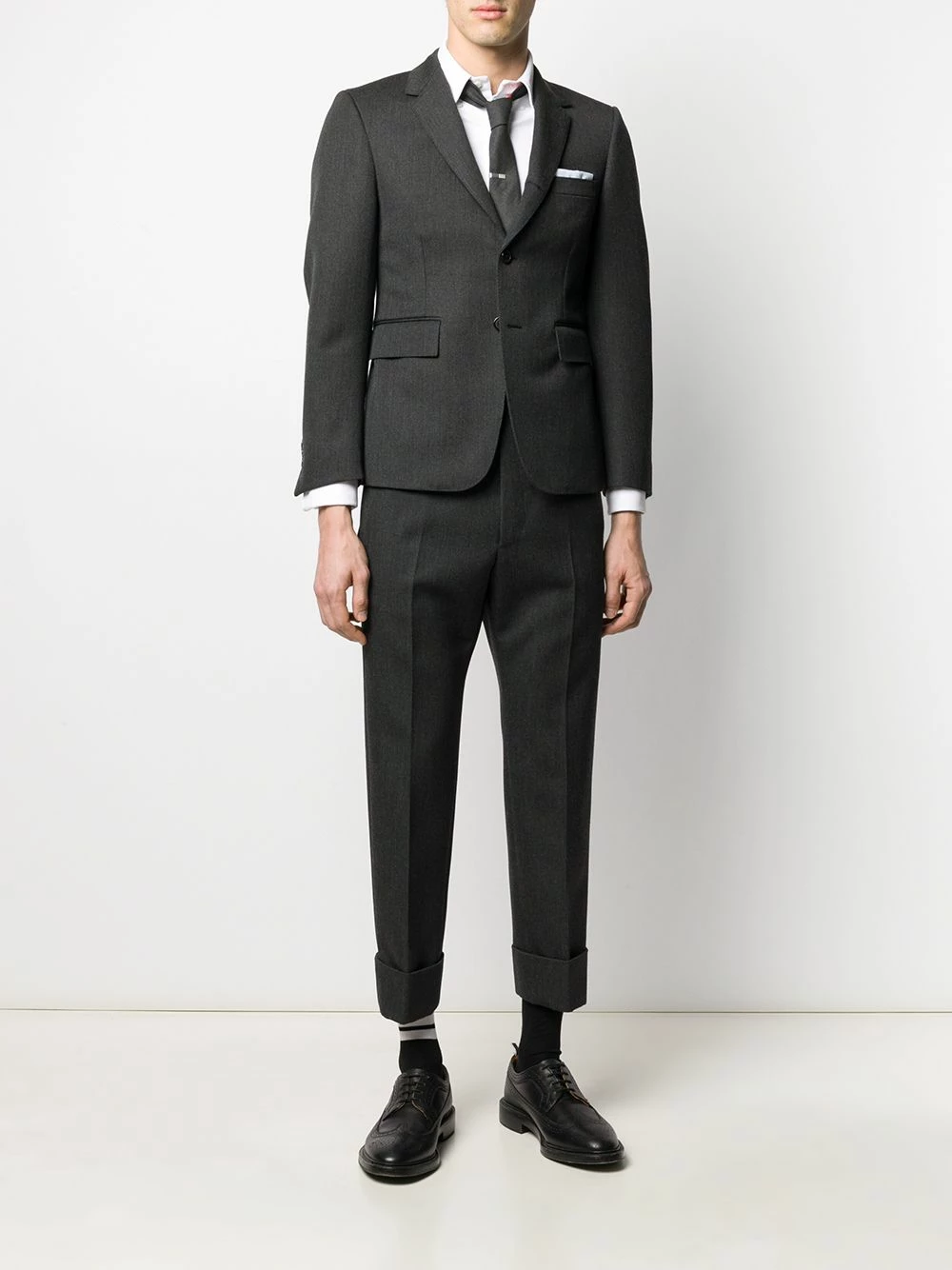 Thom Browne transforms classic silhouettes by adding signature detailing that gives the brand that avant-garde edge. Case in point: this two-piece formal suit. Crafted from super 120s wool twill, this structured yet comfortable suit is trimmed with the signature three-stripe tab to the back and has cropped turned-up cuffs to the trousers. Jazzy socks encouraged.