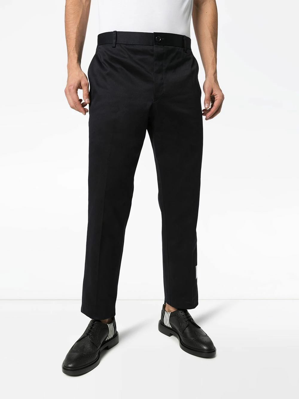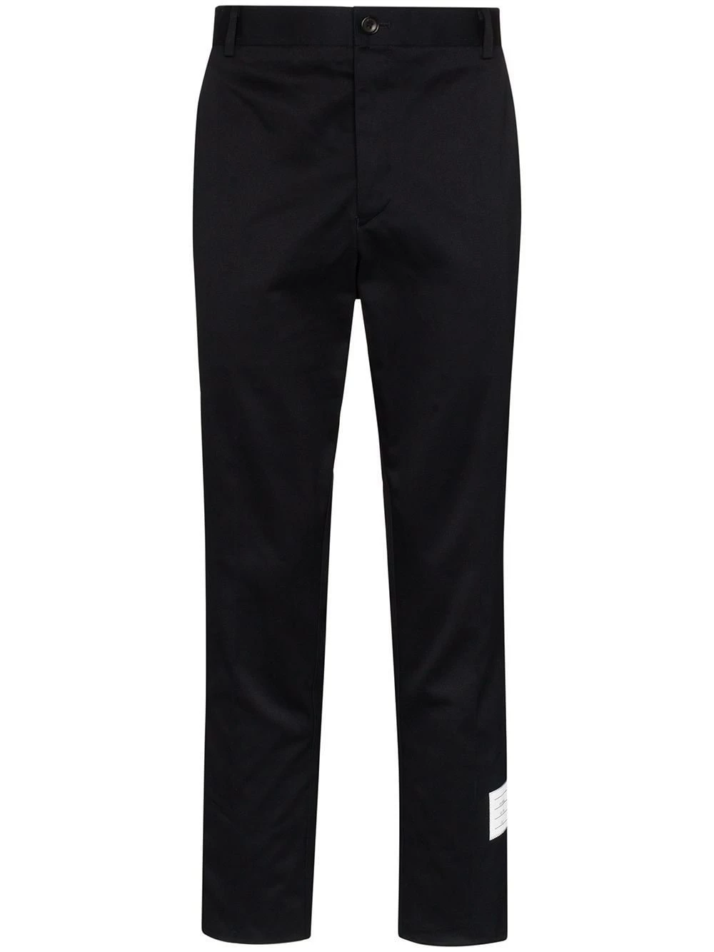 Always favouring clean lines and signature house elements, Thom Browne presents these navy blue chinos. Made from cotton, this slightly cropped pair is detailed with the label’s recognisable grosgrain loop tab to the rear and a logo patch to the side.