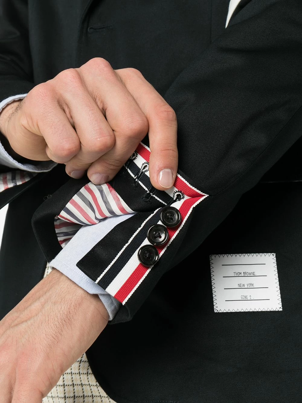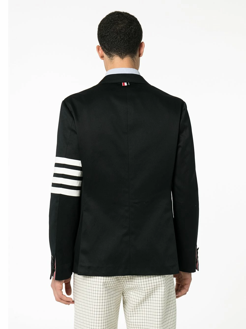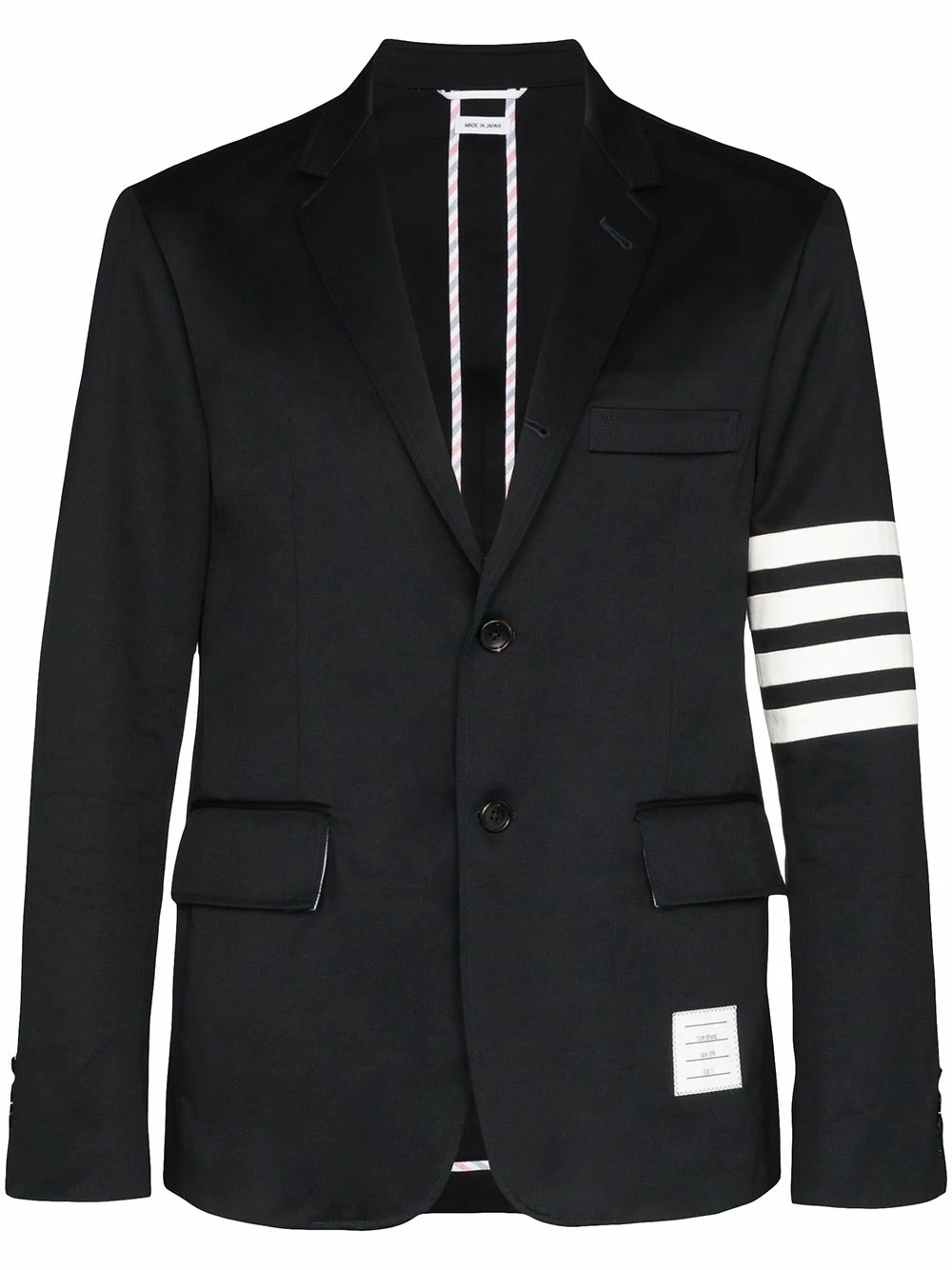 Stripes, stripes, baby. That’s what this navy blue cotton unconstructed 4-Bar single-breasted blazer from Thom Browne has to say. Boasting the label’s iconic 4-Bar motif to one side, this blazer is ready to go… well, wherever you are. To work, to the bar, to the streets, to a wedding – you name it, it’s there. Featuring structured shoulders, notched lapels, a broad welt chest pocket, a front button fastening, front flap pockets, a front logo patch, long sleeves, button cuffs, a double vent to the rear and a contrast 4-Bar motif to one side.