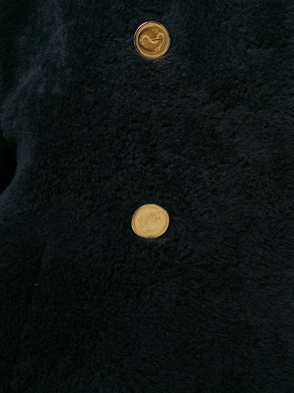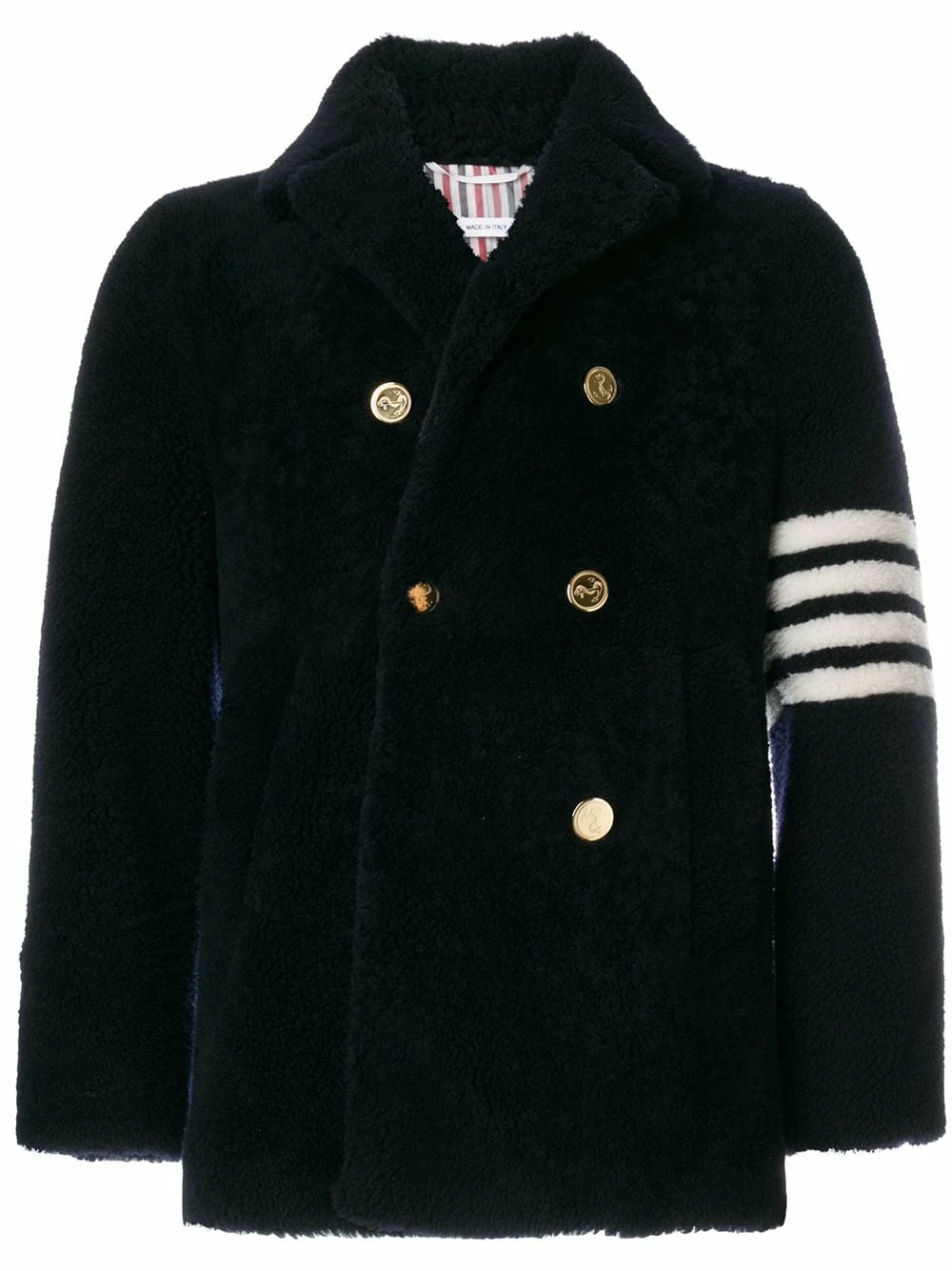Combining highest-quality fabrics and a conservative sensibility with a touch of irreverence and humour, Thom Browne’s Autumn/Winter 2018 is full of modern must-haves. Crafted in Italy from luxuriously soft shearling, this navy blue peacoat features a double breasted front fastening, gold-tone embossed buttons and button cuffs with a distinctive tricolour striped trim. A smooth striped lining, a matching grosgrain tab on the rear and four-bar stripes at the sleeve adds an unmistakable finishing touch to this timeless essential that’s sure to keep you warm and stylish this season and beyond.