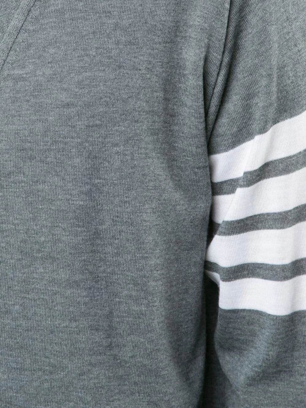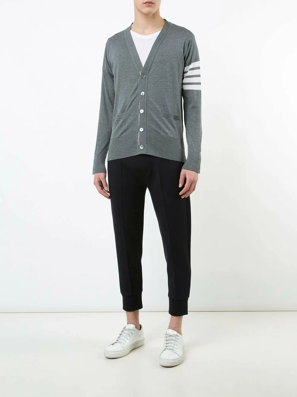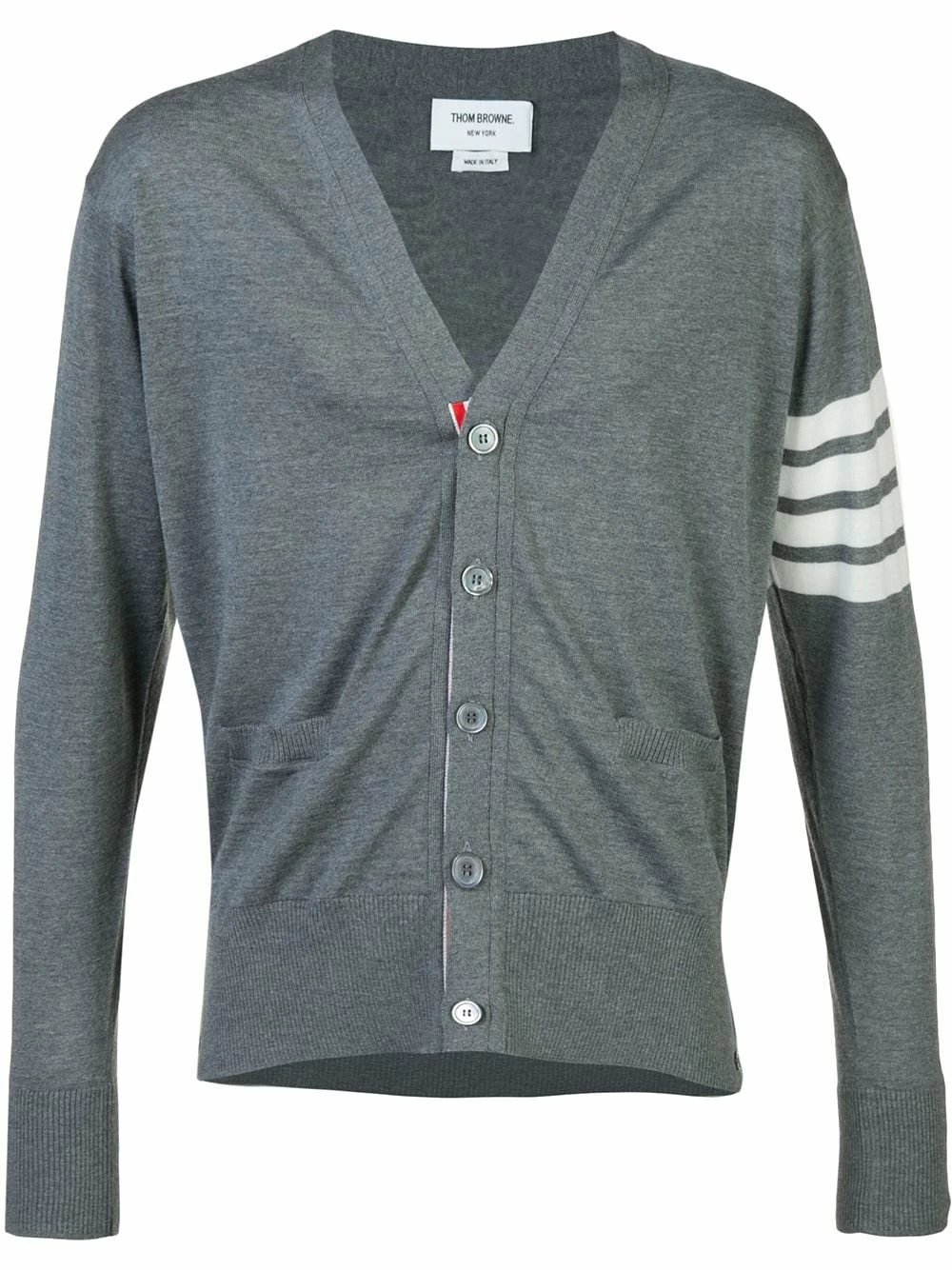 Medium Grey wool V-Neck Cardigan With 4-Bar Stripe In Medium Grey Merino from Thom Browne featuring a deep V neck, a front button fastening, long sleeves, button cuffs, decorative buttons, two front pockets and white stripes on the left arm. This item is true to fit.