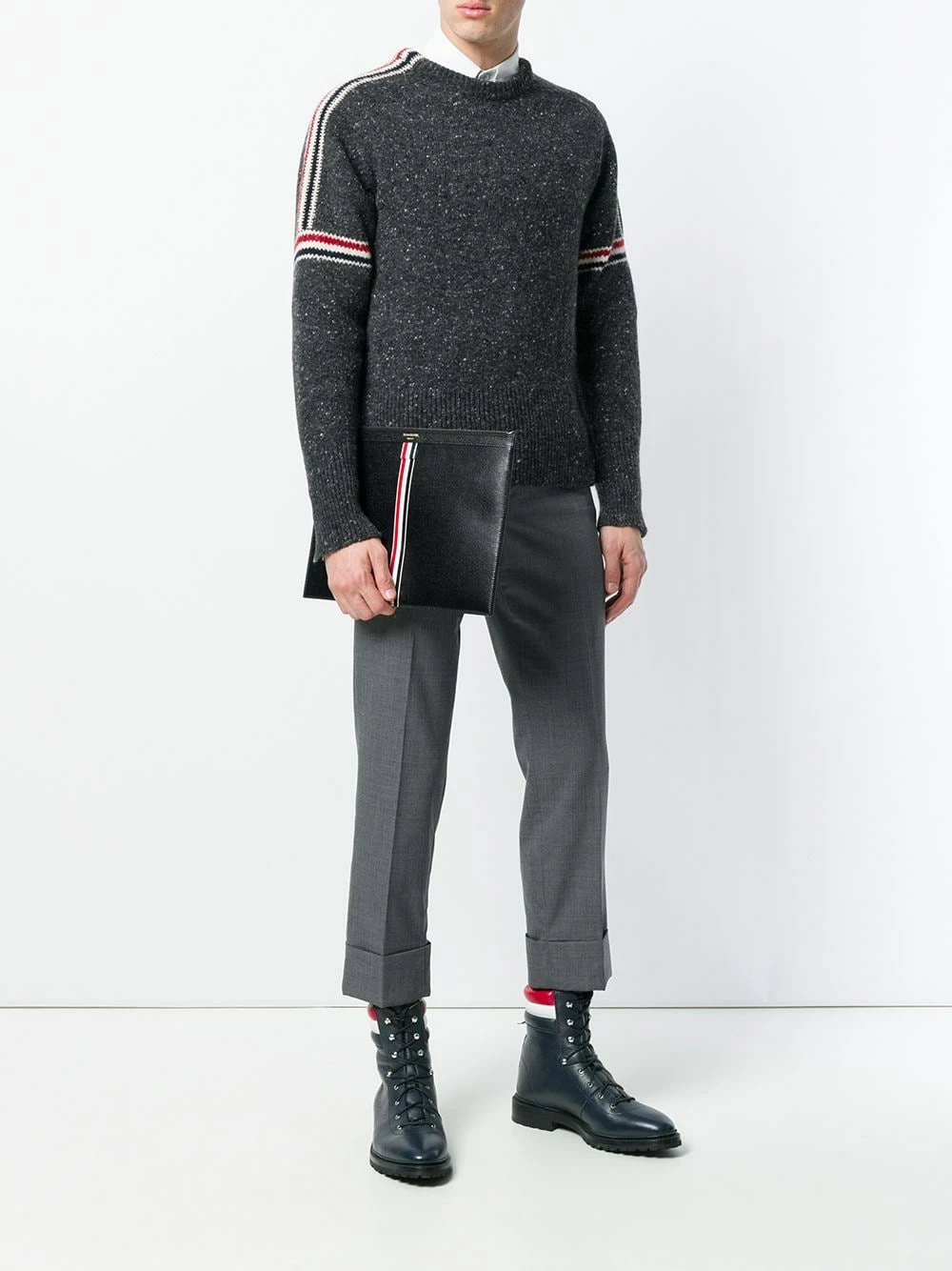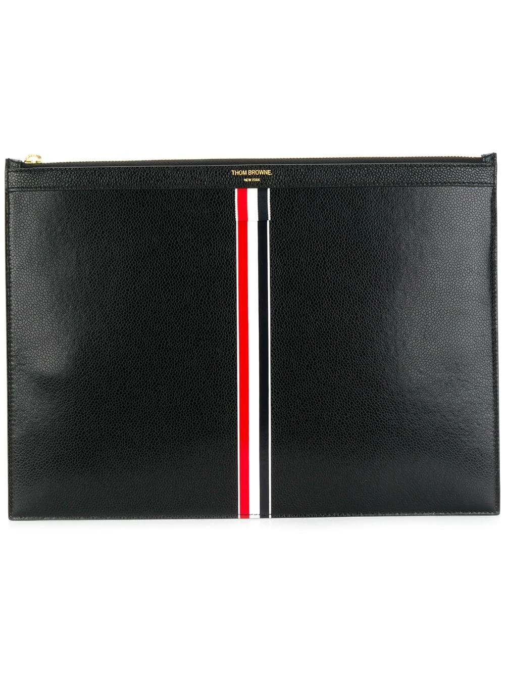 Black Vertical Intarsia Stripe Leather Medium Document Holder from Thom Browne featuring a front centre logo stamp, a signature tri-colour striped trim, a top zip closure, gold-tone hardware, an internal logo plaque and a signature striped lining.