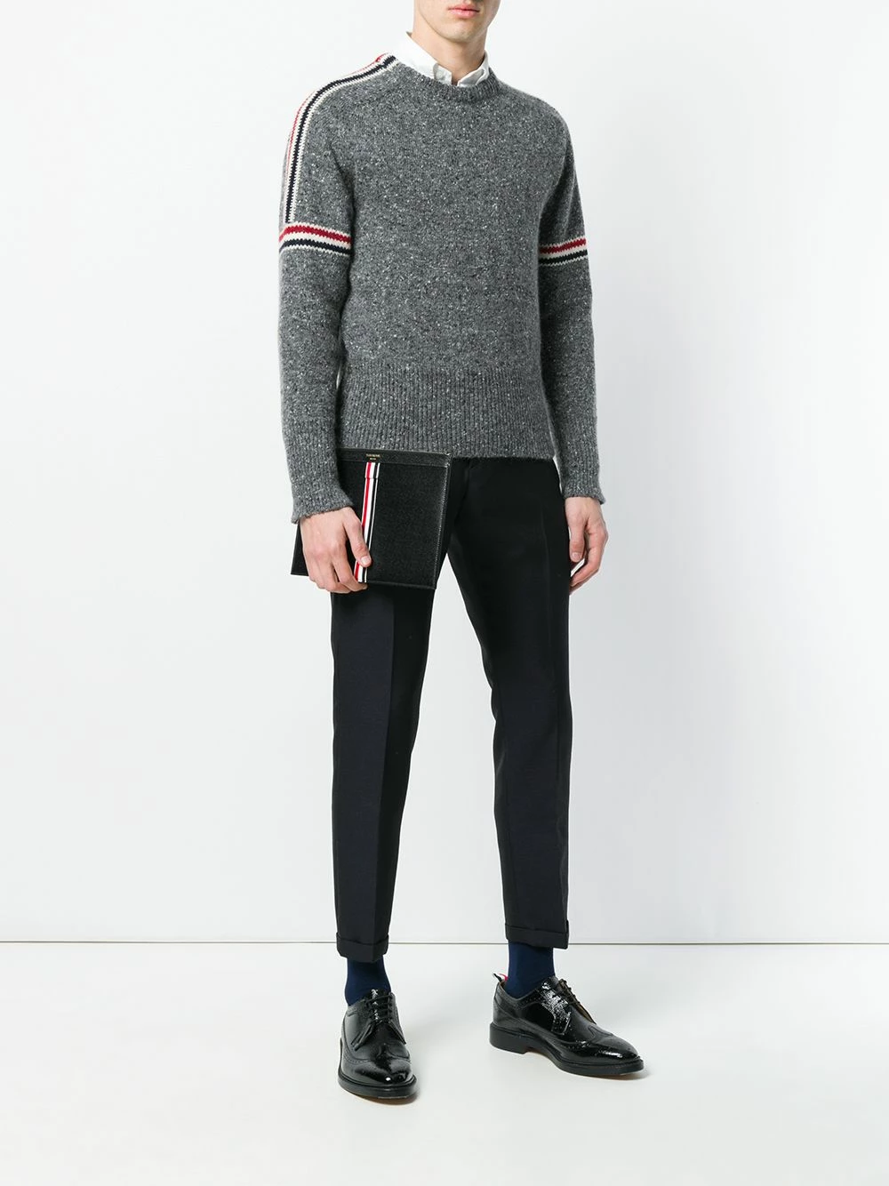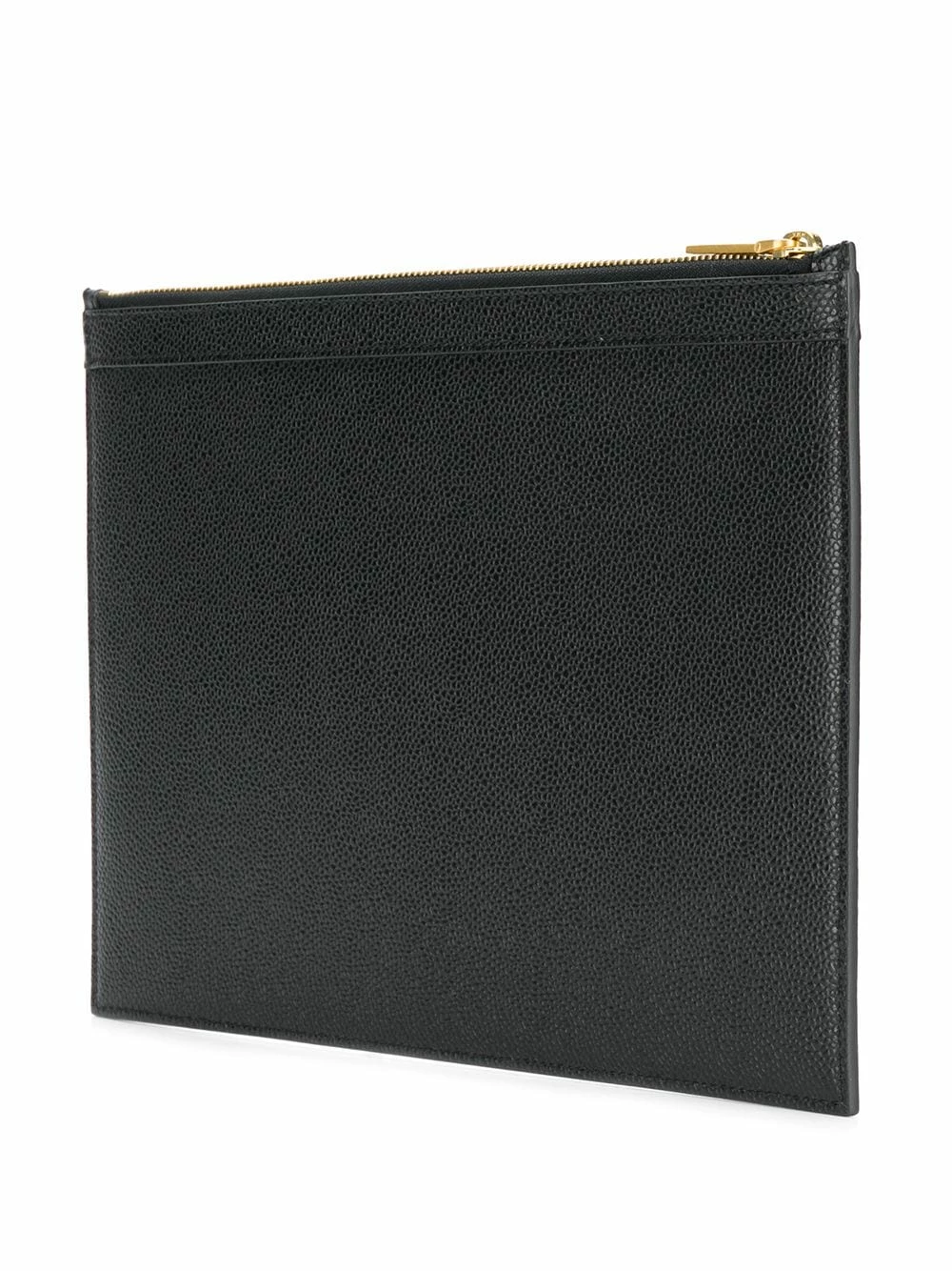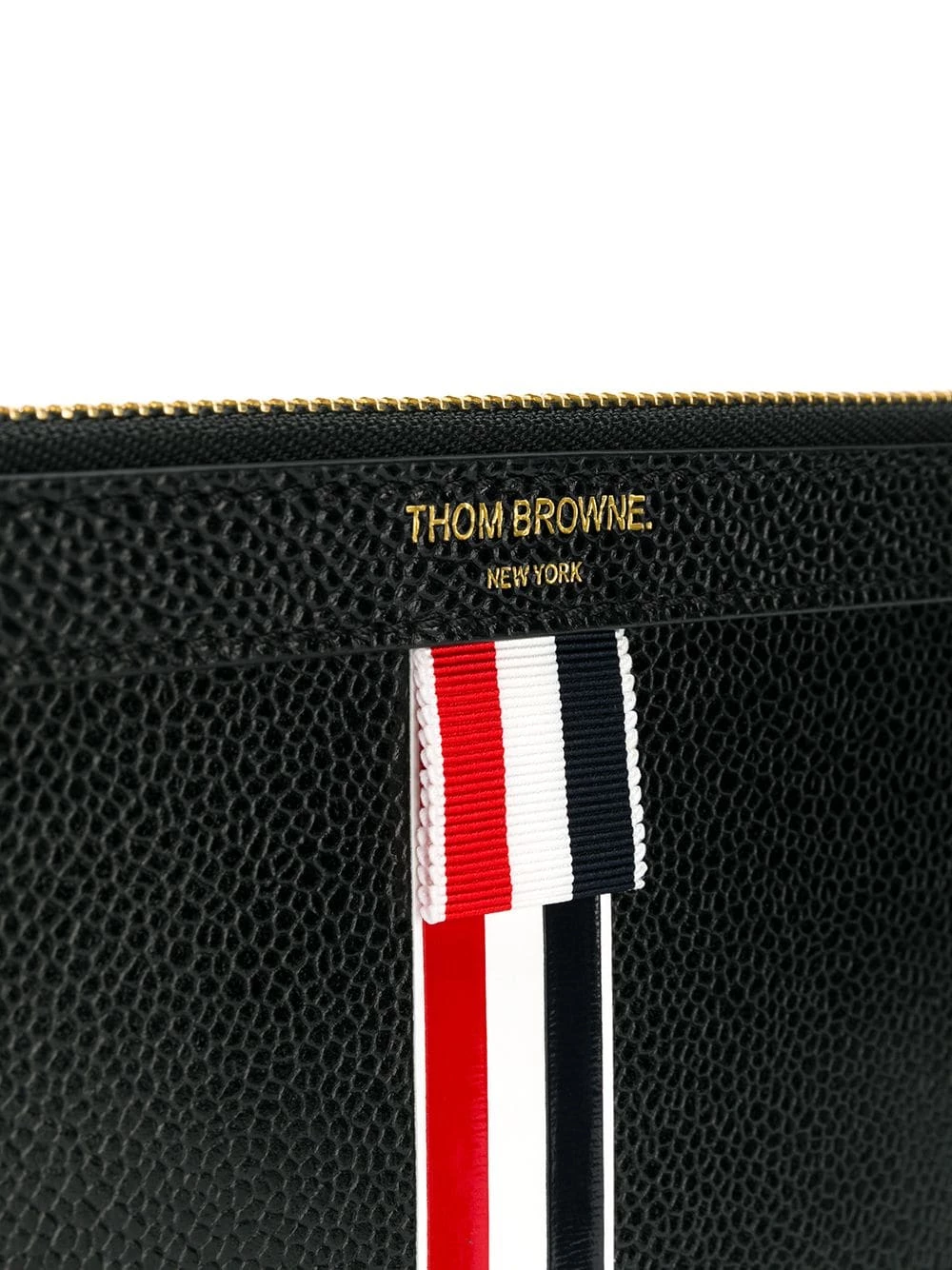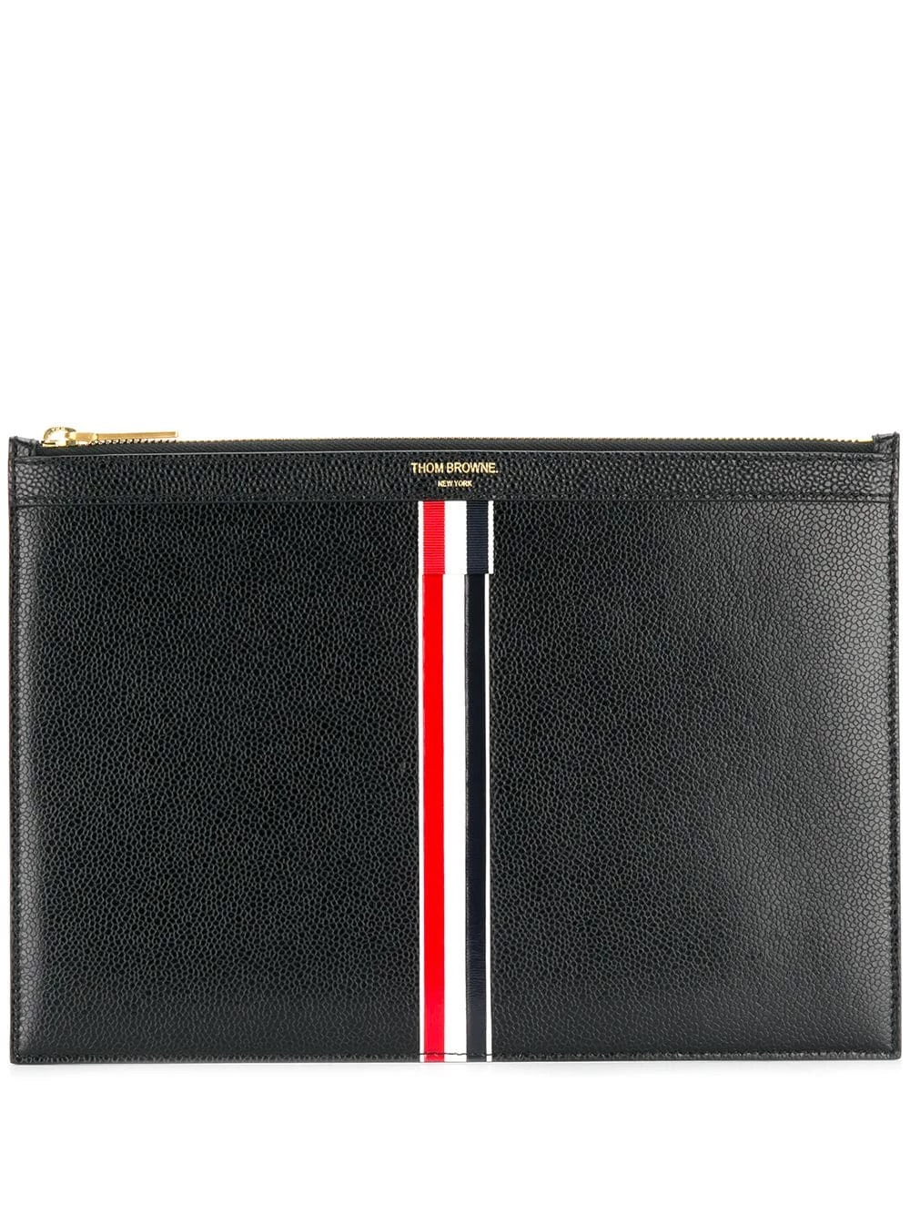 Looking for a practical bag? Say no more. Designed with medium shape, but full of space to put all your essentials in, this black leather vertical Intarsia stripe small tablet holder from Thom Browne is the best daily companion. Simply stylish. Featuring a front centre logo stamp, a signature tri-colour striped trim, gold-tone hardware, a top zip fastening, an internal logo plaque, a signature tri-colour striped logo tab and a signature striped lining.