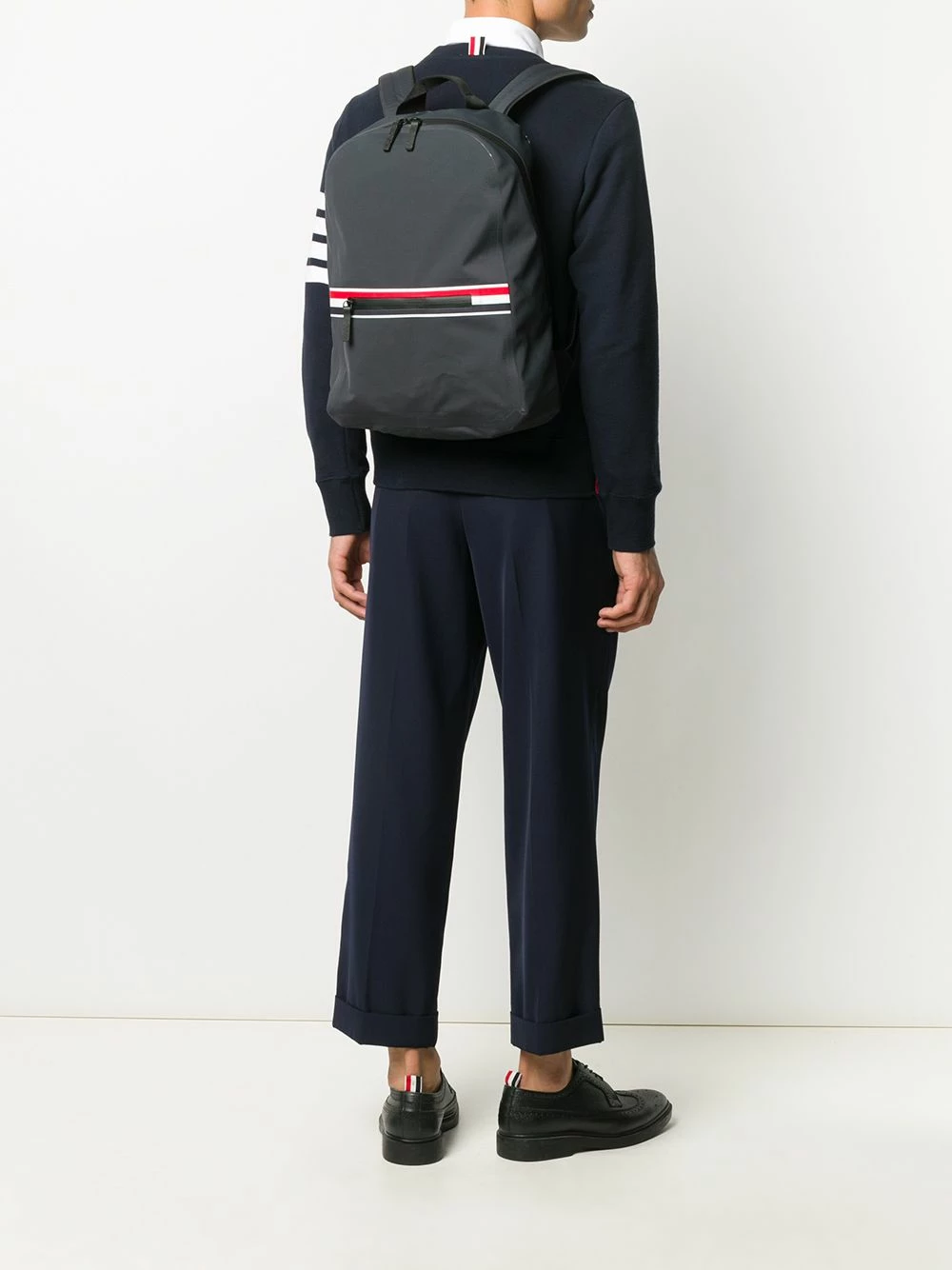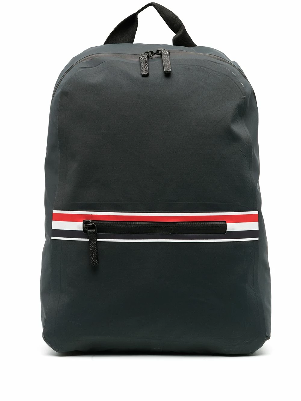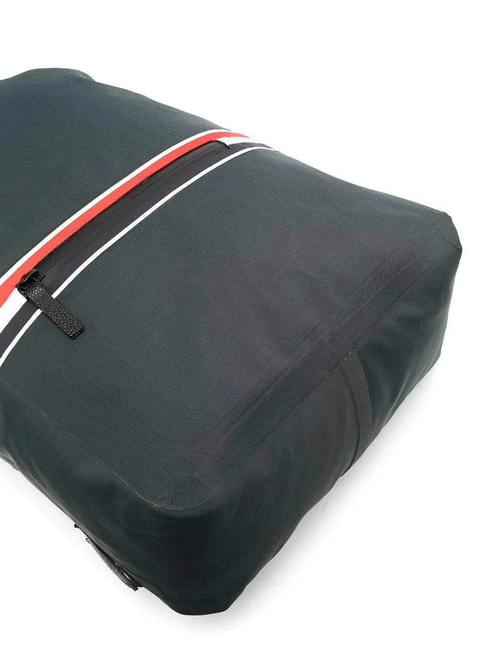 Judging by the forecast the rain isn’t going anywhere, so dress accordingly with this welded backpack from Thom Browne. Constructed from waterproof nylon it’s guaranteed to keep your valuables safe and dry. You can’t rely on the weather, but you can always count on this practical accessory. Featuring a signature three stripe detail, a waterproof design, a round top handle, a top zip fastening and a front zip compartment.