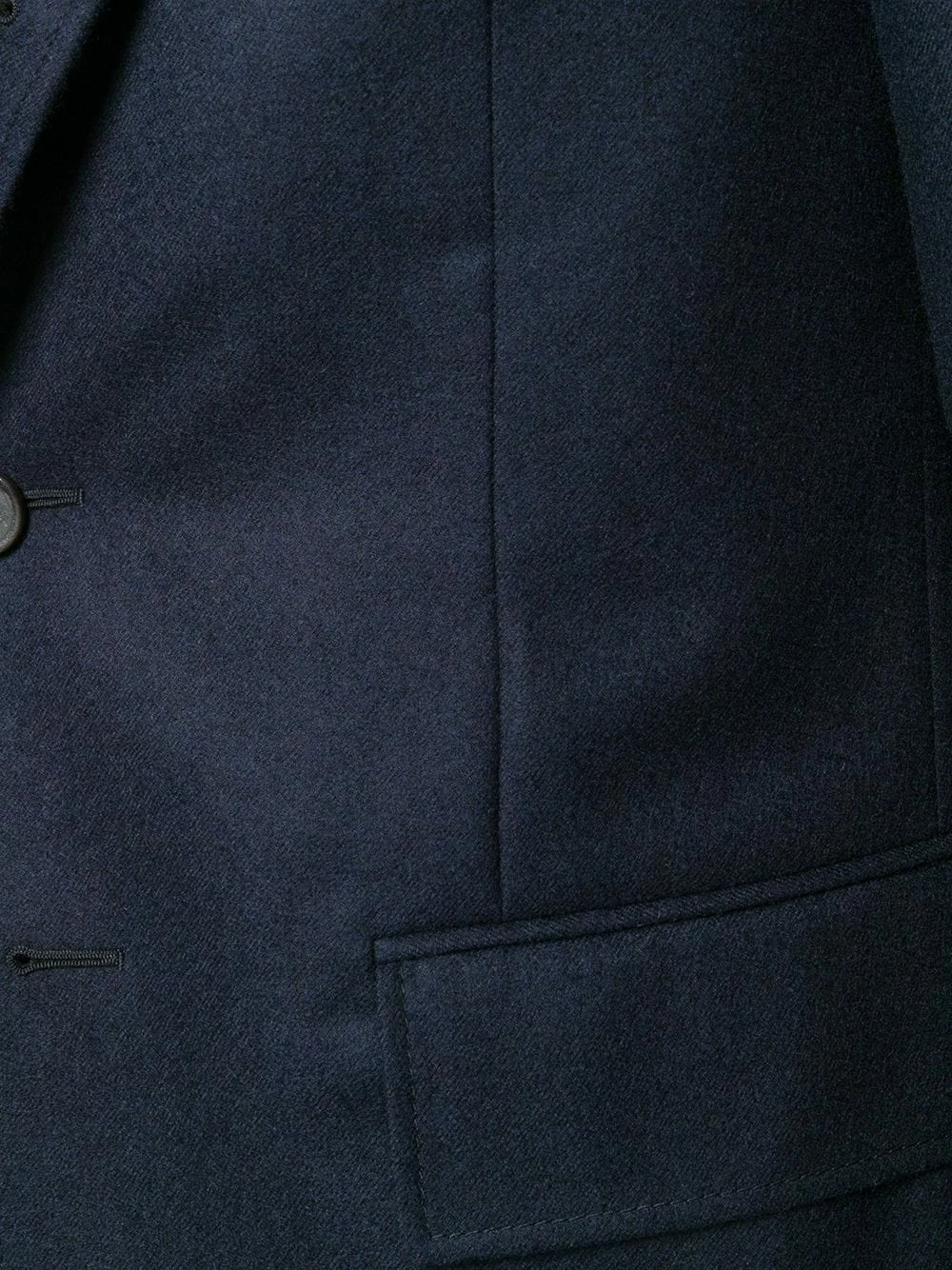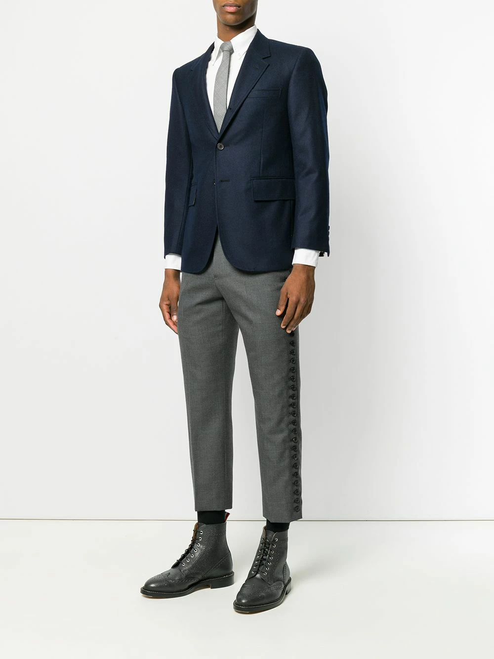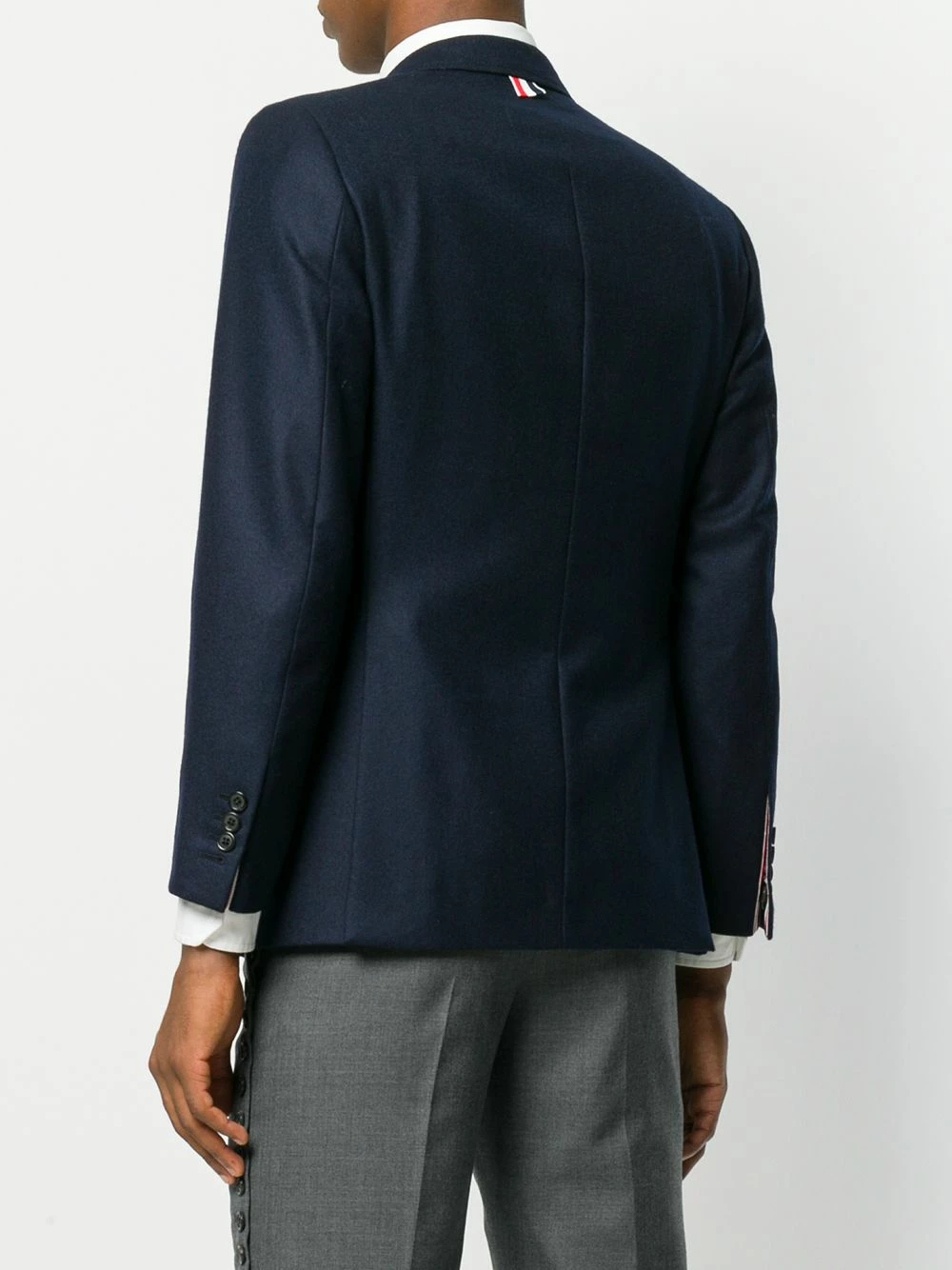 Navy Wide Lapel Solid Wool Sport Coat from Thom Browne featuring notched lapels, a front button fastening, a chest pocket, front flap pockets, cropped sleeves, button cuffs, a signature tri-colour striped trim, a double vent to the rear, a straight hem and a signature striped lining.