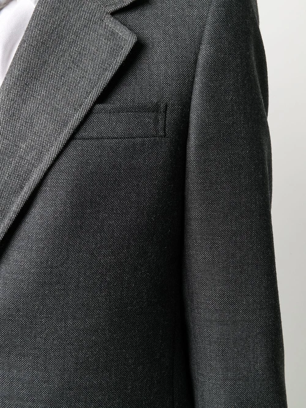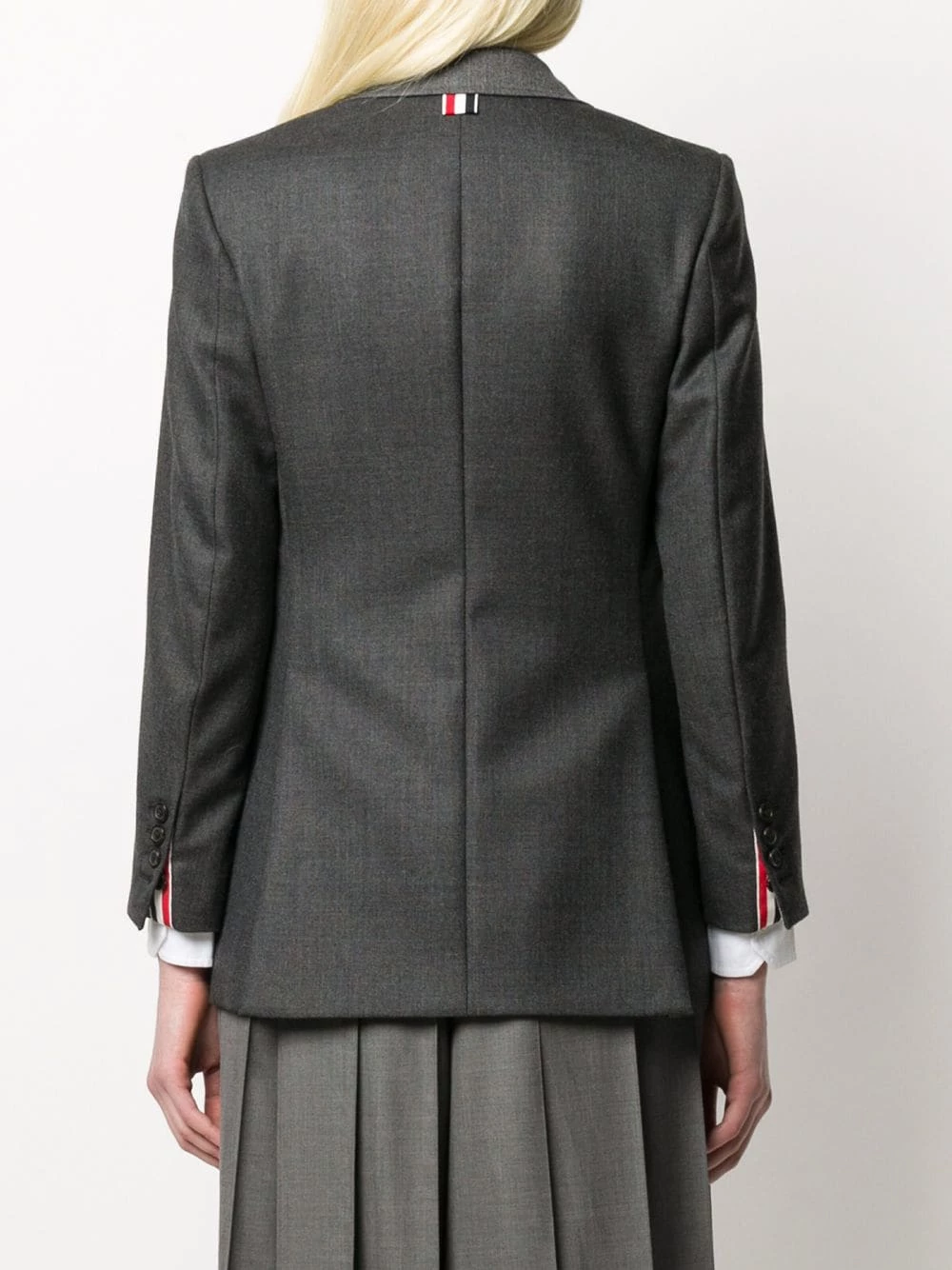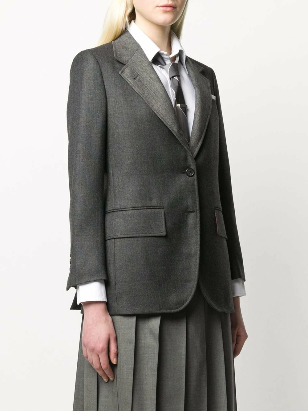 Looking for a jacket that will smarten up your look? This medium grey combo step twill wool jacket from Thom Browne will do the trick. Great for bringing structure to an outfit! Featuring flap pockets, classic lapels, a curved hem and single-breasted.