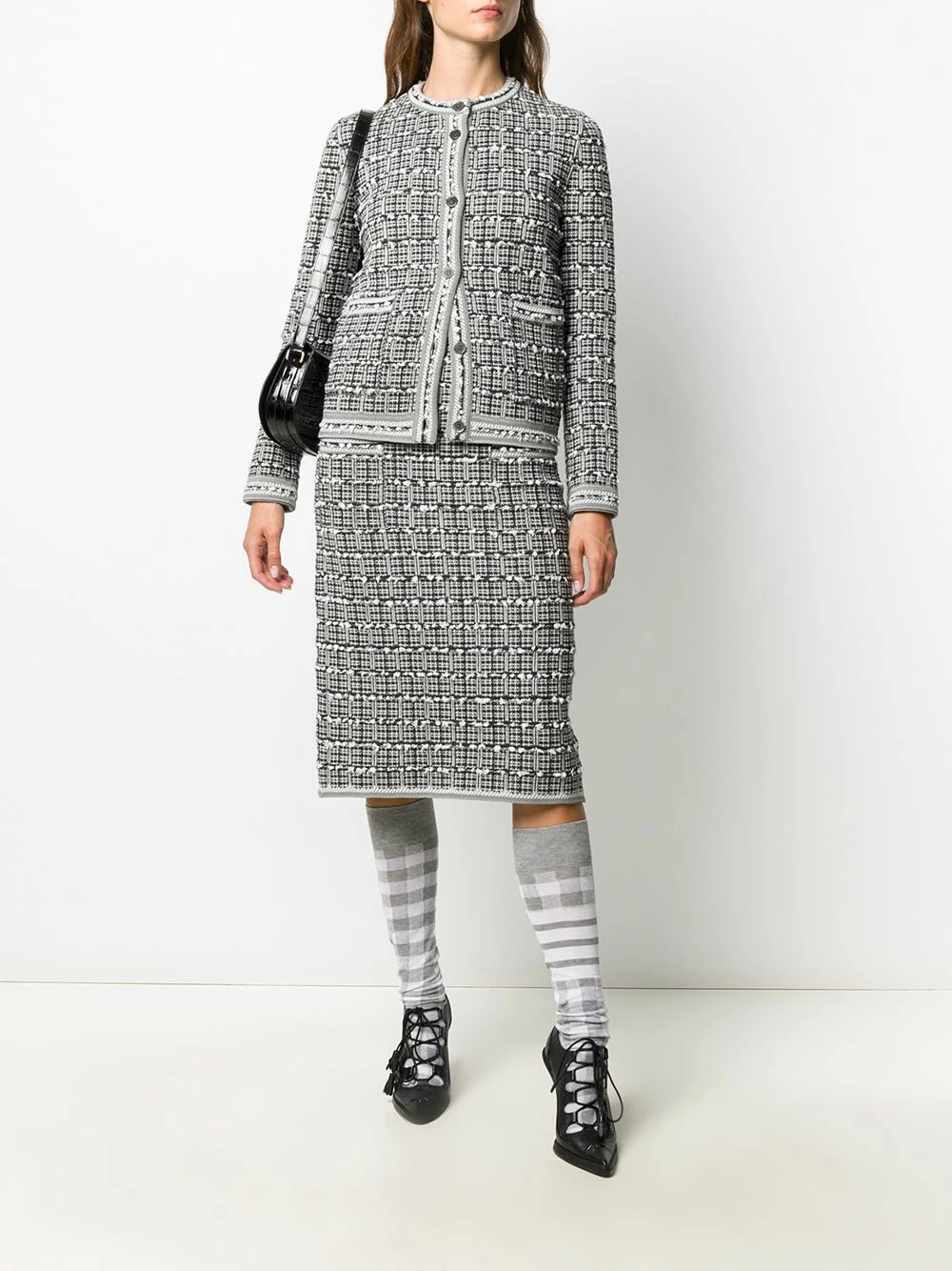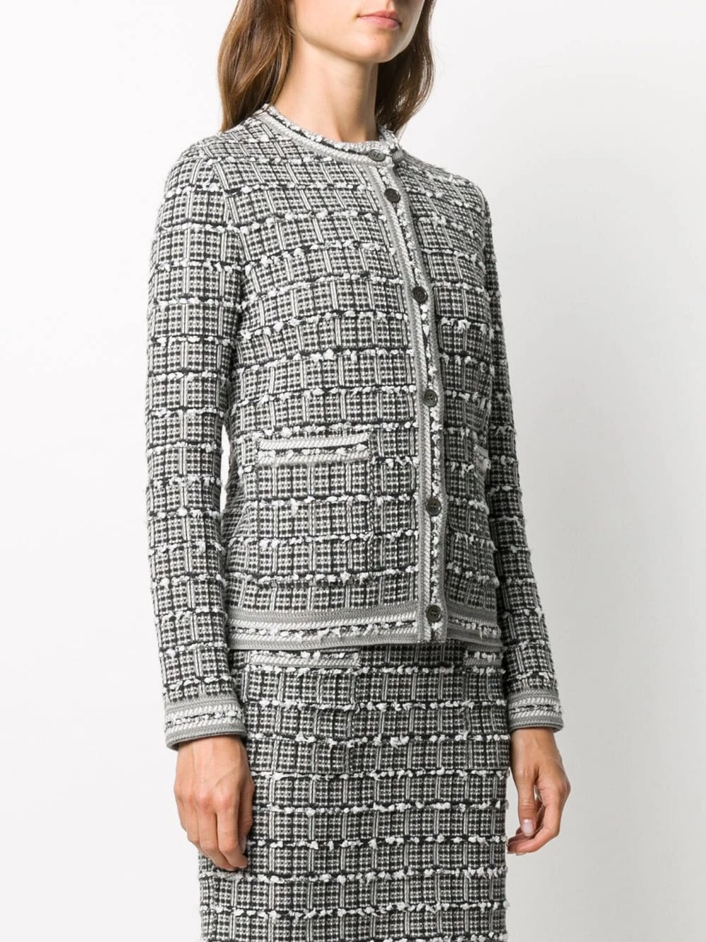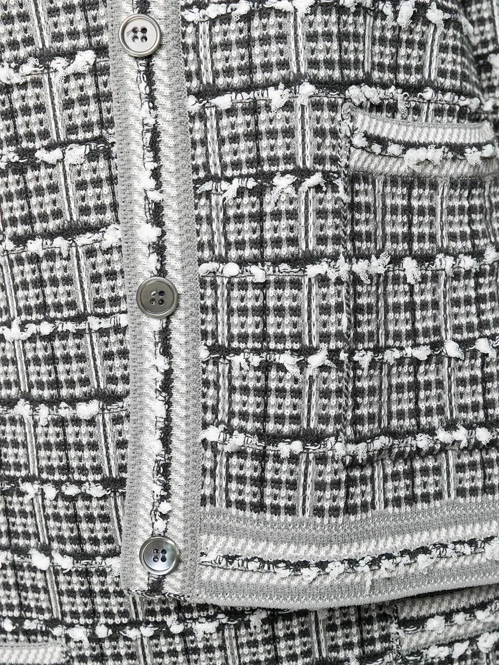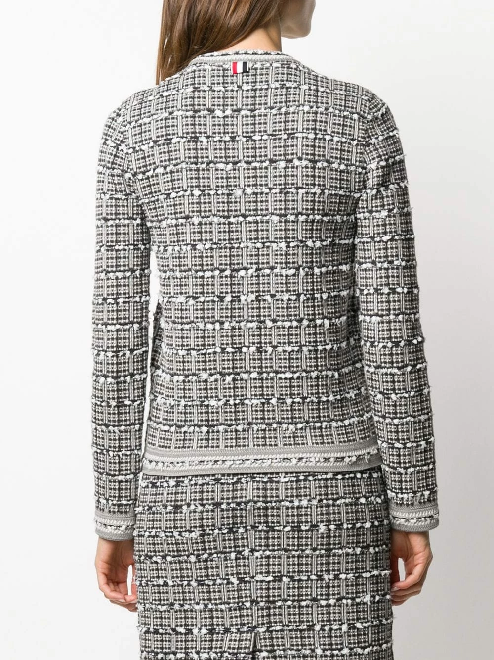 You mix comfort, femininity and add in a sprinkle of refined elegance. What do you get? This windowpane jacquard cardigan jacket from Thom Browne. Constructed from a soft cotton blend, this crew neck cardigan is ready to freshen up your wardrobe with its timeless design and polished-looking aesthetic. What’s not to love?