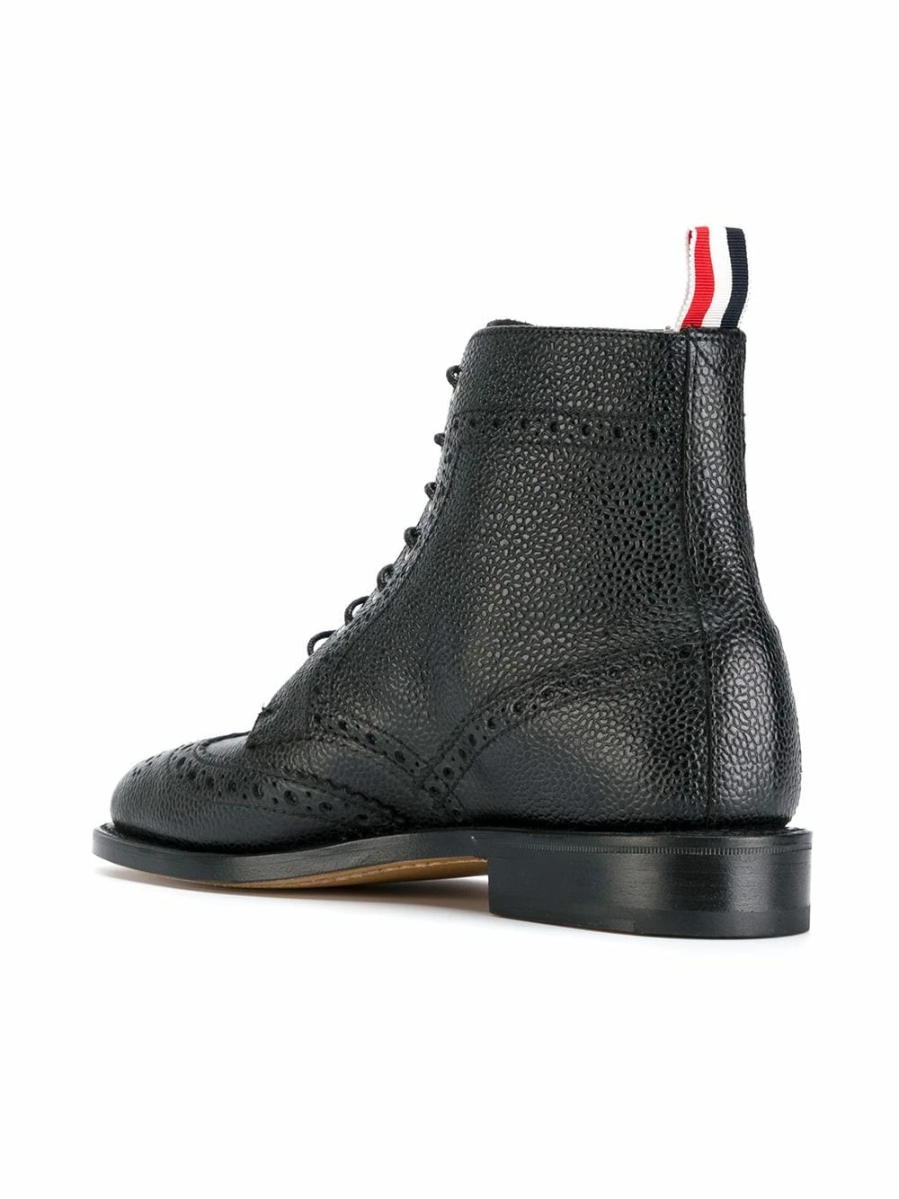 Often traditional, Browne’s footwear relies on texture and minor detailing for that avant-garde twist the brand is known for. Fashioned from the outstanding pebble grained leather incorporated to most of Browne’s leatherwork, these black brogue inspired boots feature an almond toe, a lace-up front fastening, a pull tab at the rear, a branded insole, a leather insole, a leather sole and a wingtip design.
