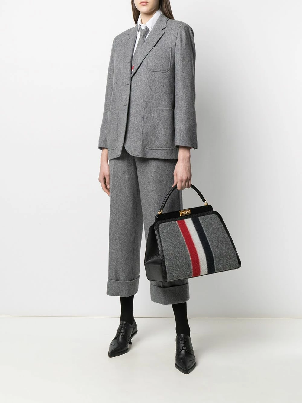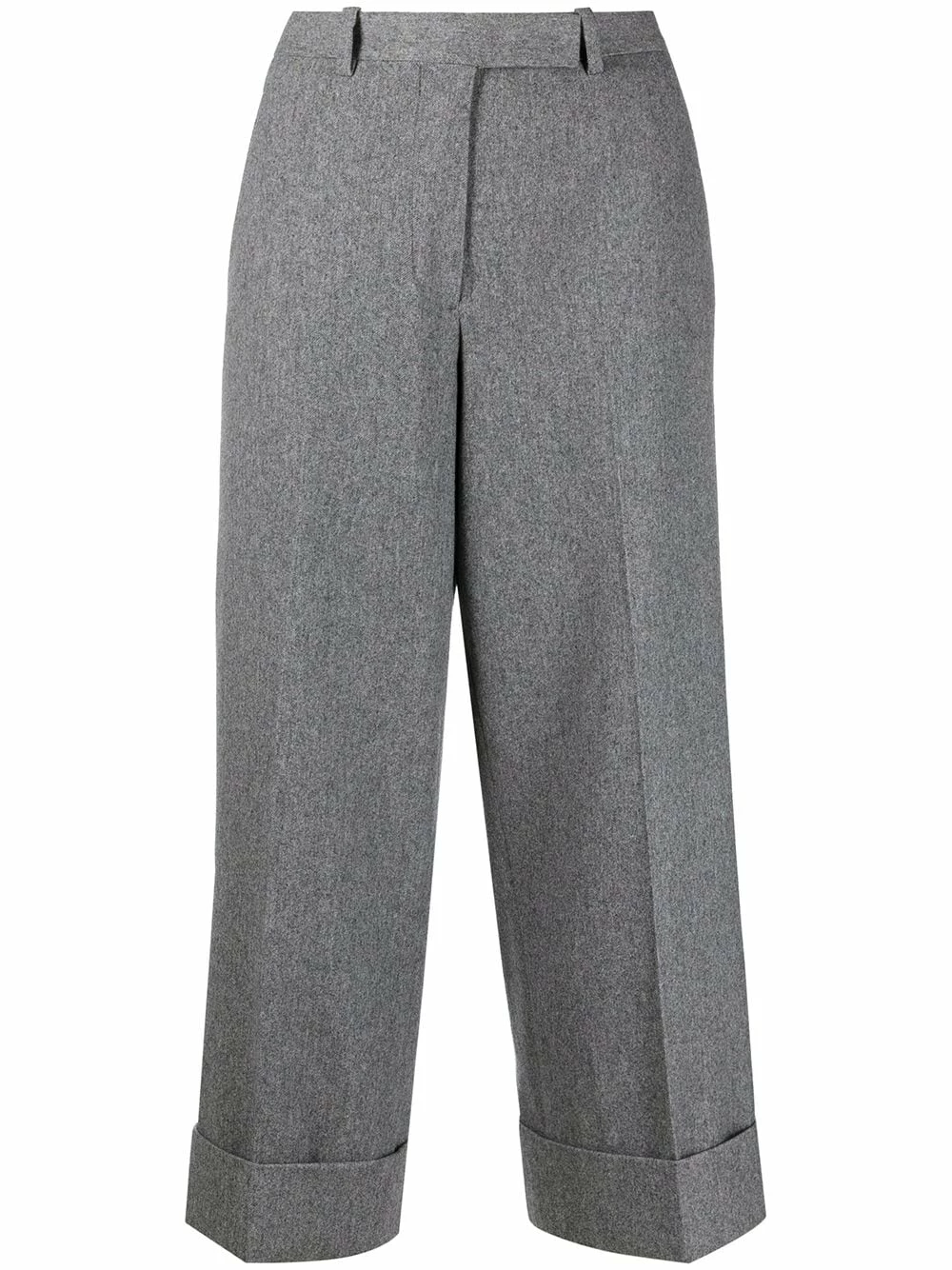 Ankles are all the rage – so why not show them off! These wool-cashmere blend cropped sack trouser from Thom Browne feature a cropped leg, belt loops, concealed front fastening, folded edge, signature three-stripe logo and slip pockets to the sides. Fancy!