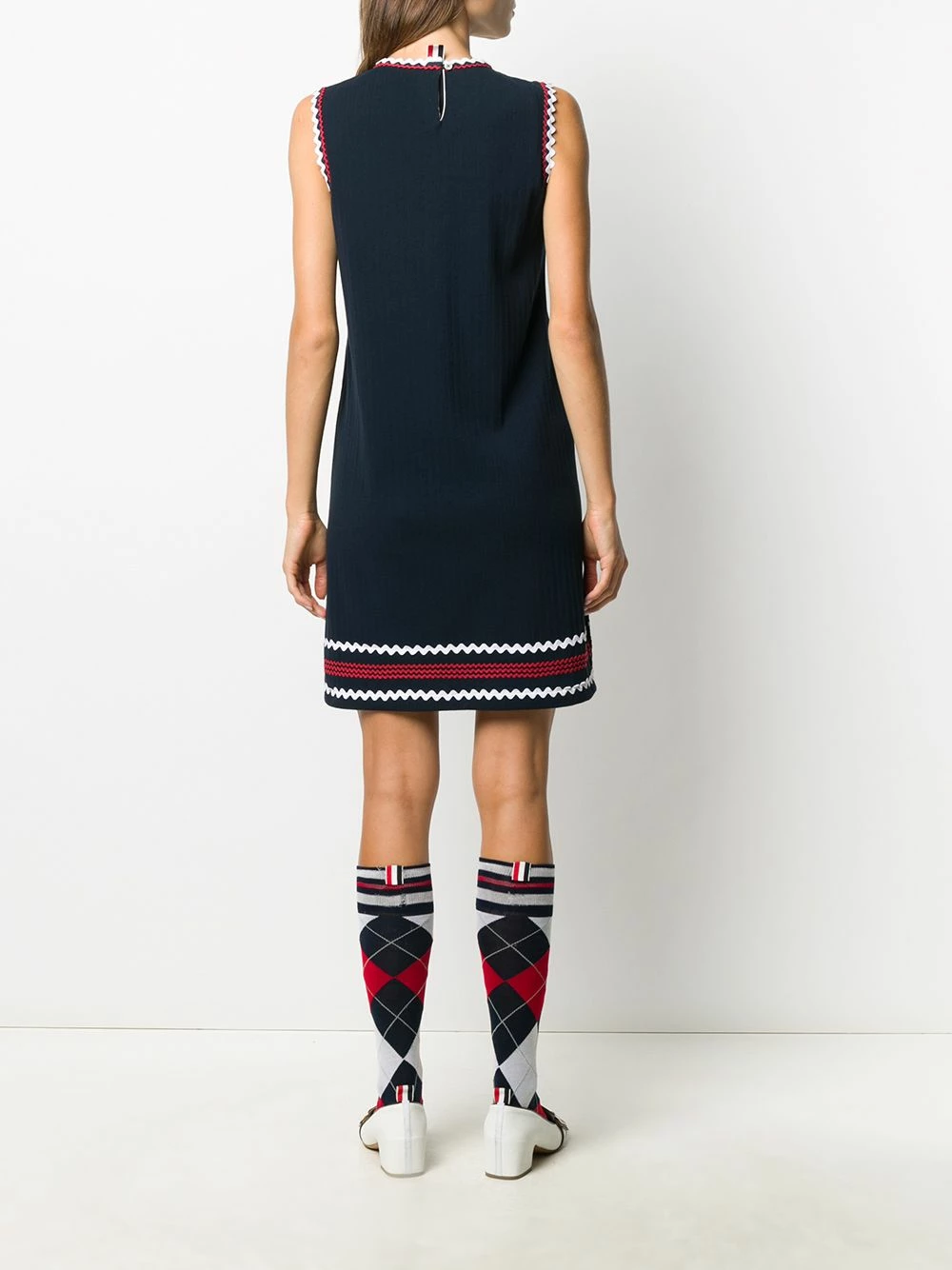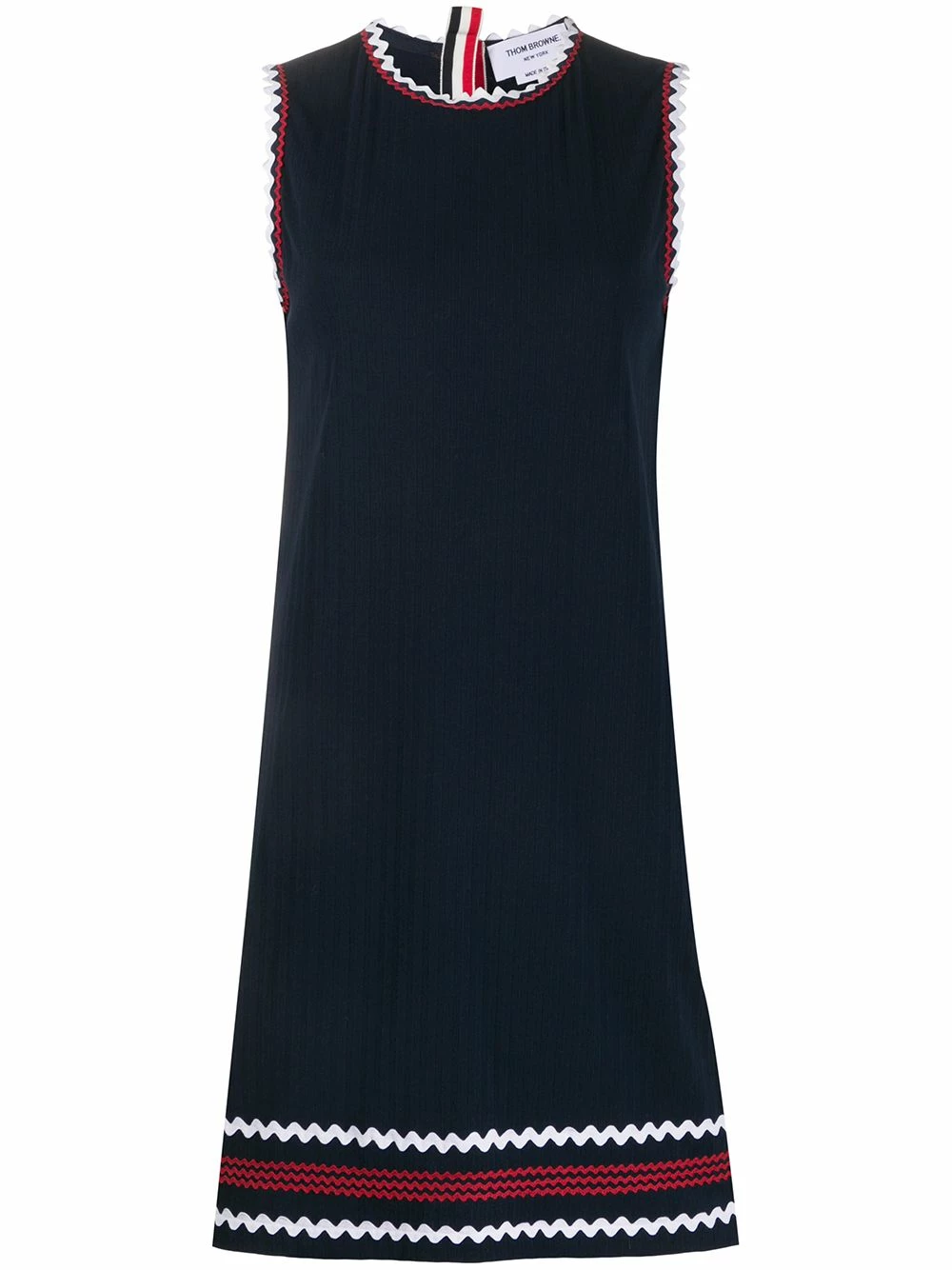 Update your wardrobe with Thom Browne. This dark blue cotton ribbed dress is cut for shift shape and trimmed with scalloped detailing. Make space in your collection.