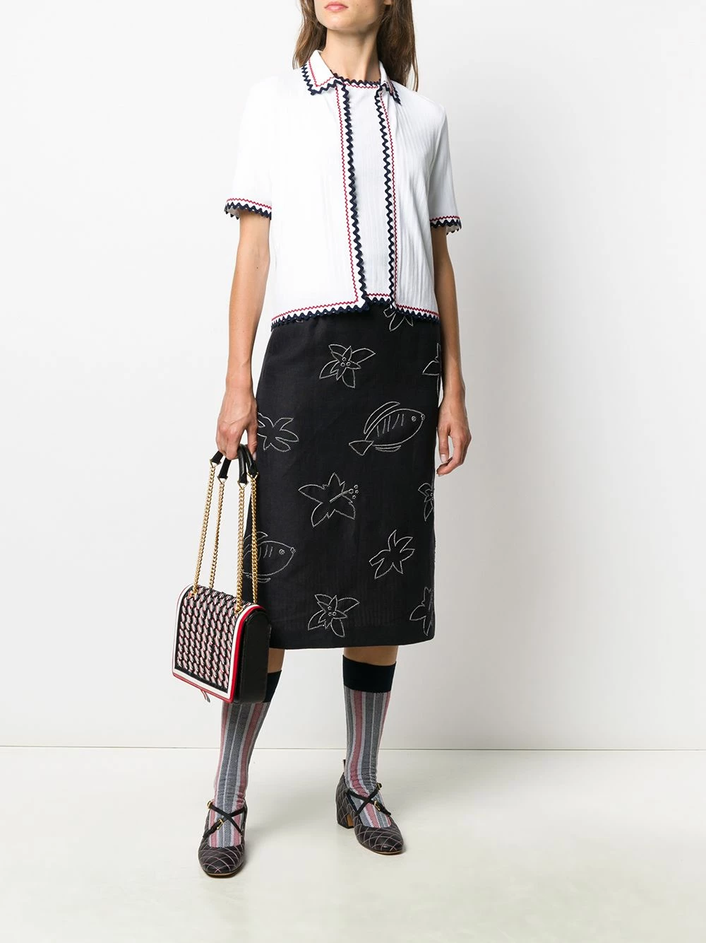 We hope you like seafood…scallops in particular. This perfectly patterned piece from Thom Browne features a scalloped edge, fine knit, layered design, zigzag edge, fitted silhouette and classic collar. It’s delicious.